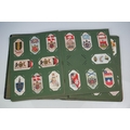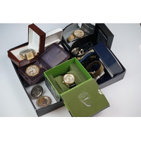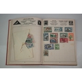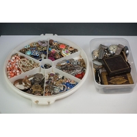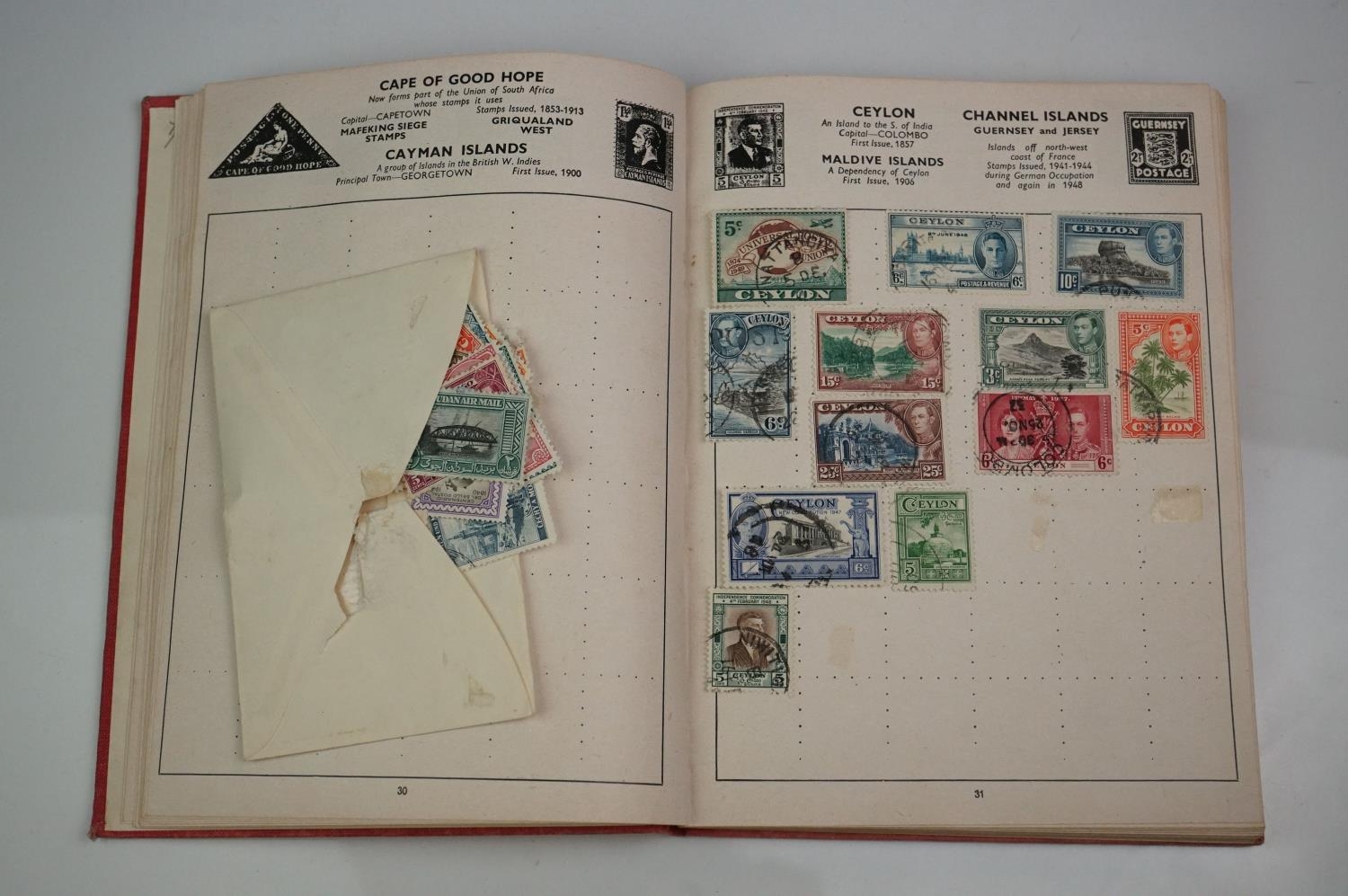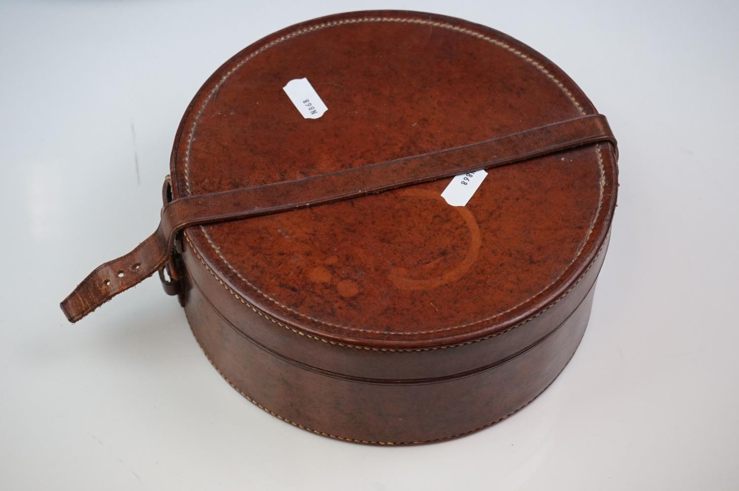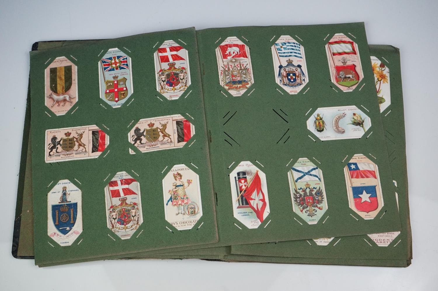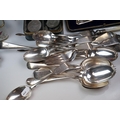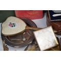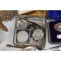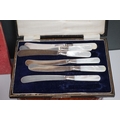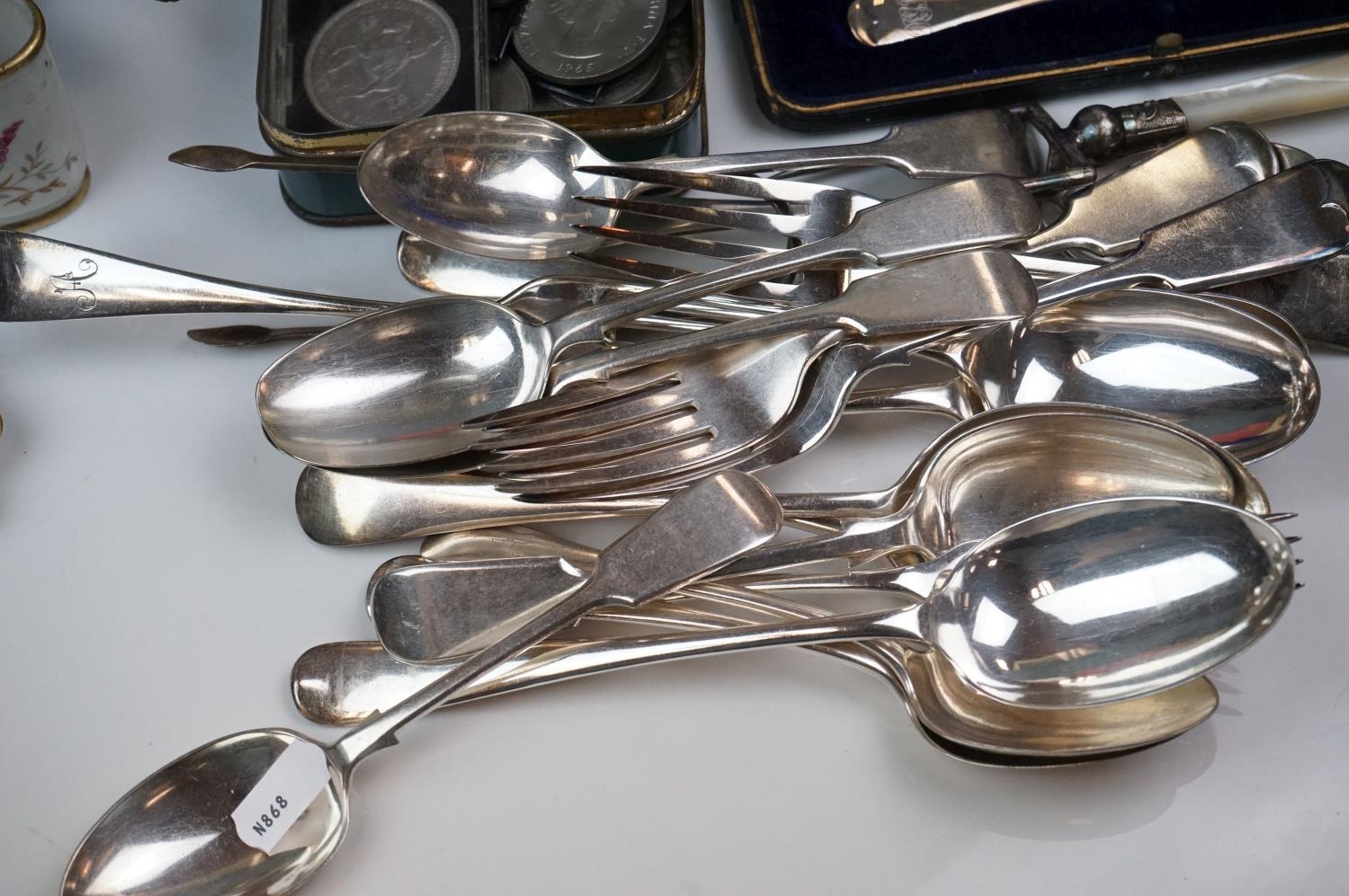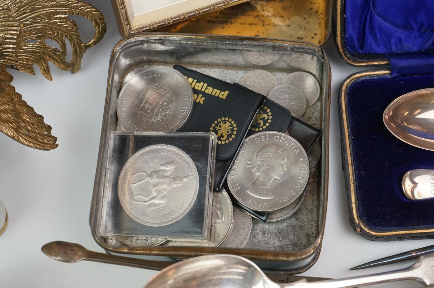 A box of mixed collectables to include a hallmarked silver candlestick, a cased hallmarked silver fork and spoon set, silver plated cutlery, leather collar box and a quantity of stamps and cigarette cards.