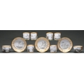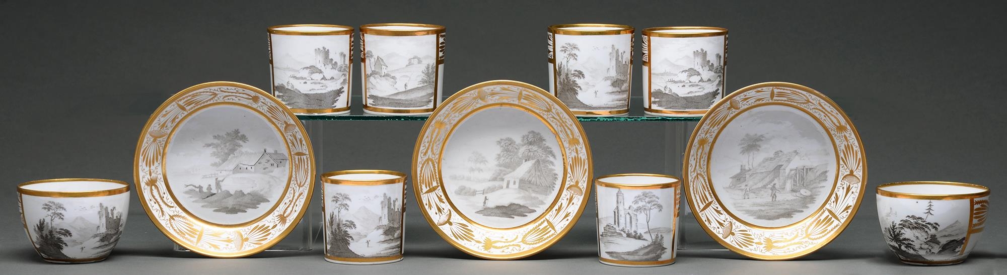 A Spode bat printed tea and coffee service, c1800, printed with scenes from the Landscape Ruins and Cottages series, with gilt borders, coffee can 6.4cm h, pattern 558 (11)