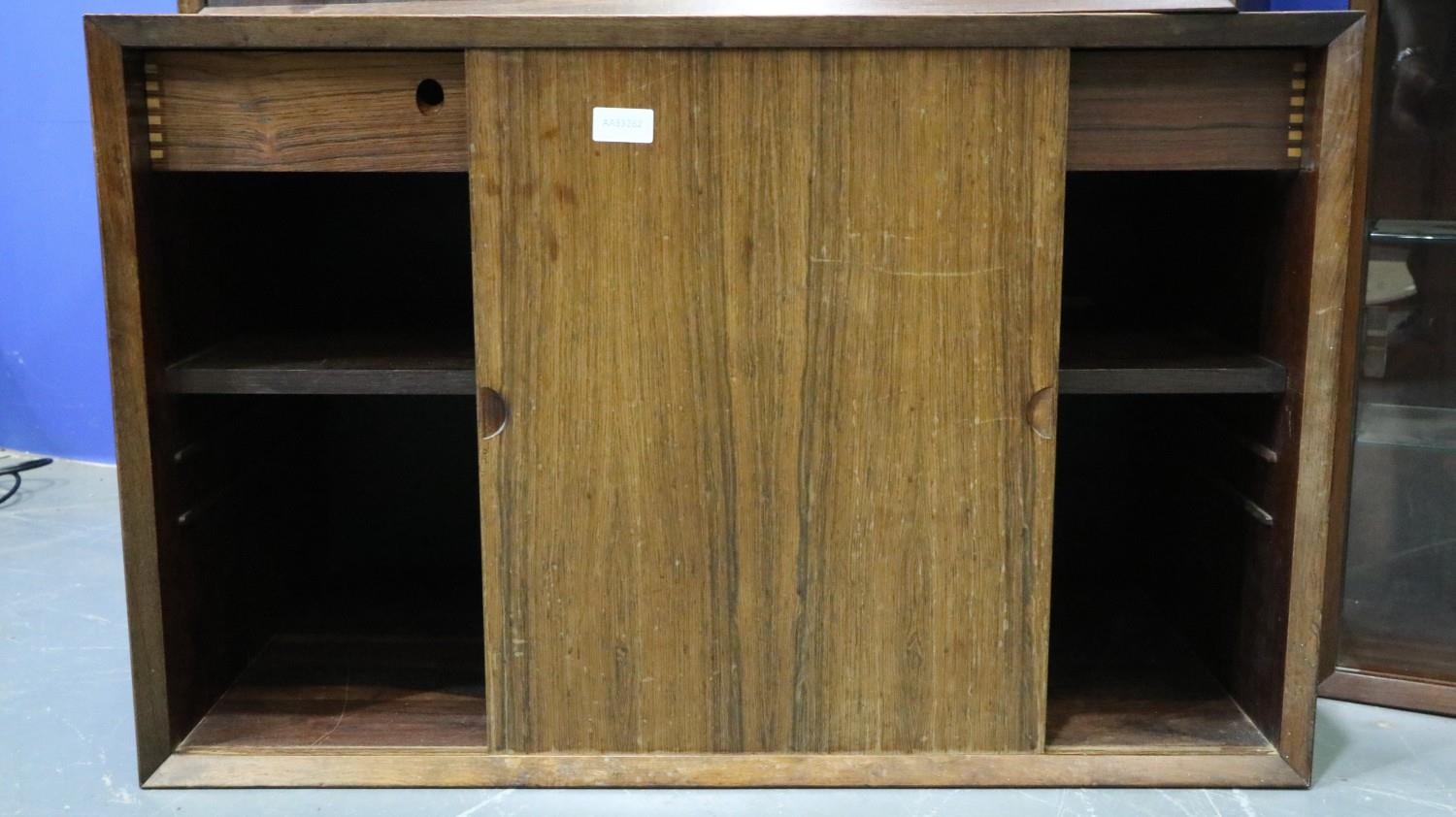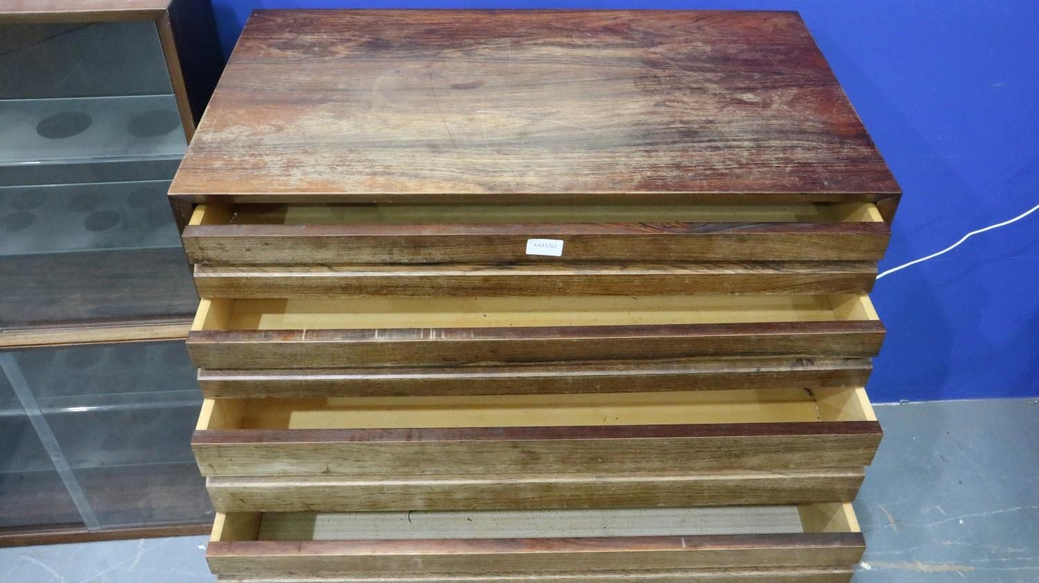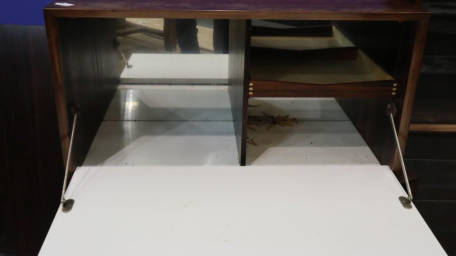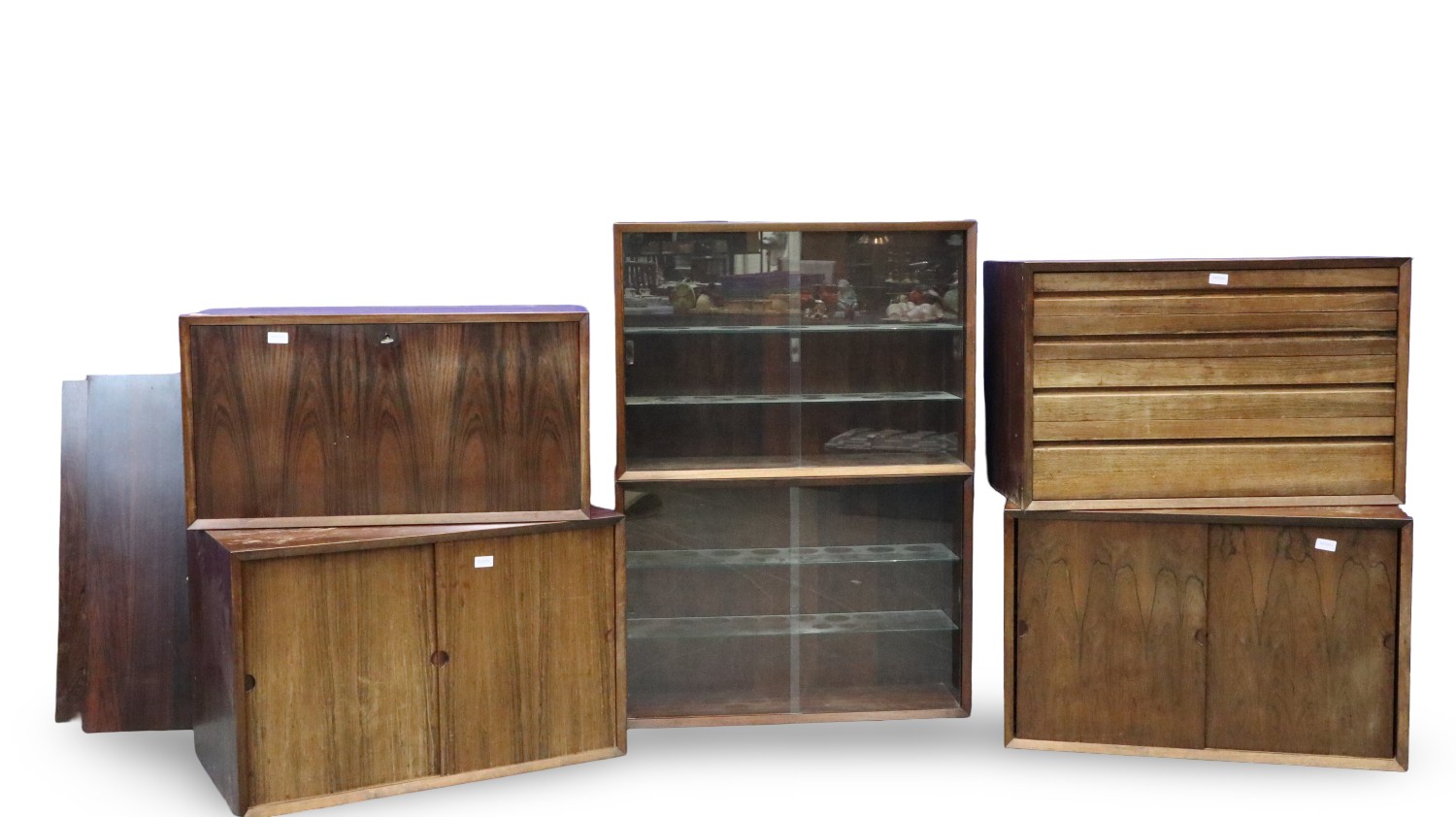 Mid-20th century modular wall mounting units, including a chest of three drawers, drop-front drinks cabinet and two cupboards, with two slim display cabinets and additional panels. All reverse panels with angled dowels, no mounting panels are included. Not available for in-house P&P