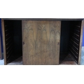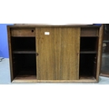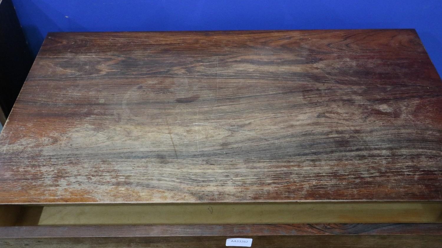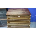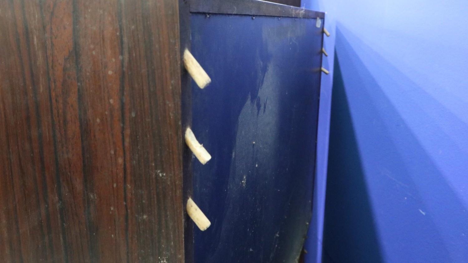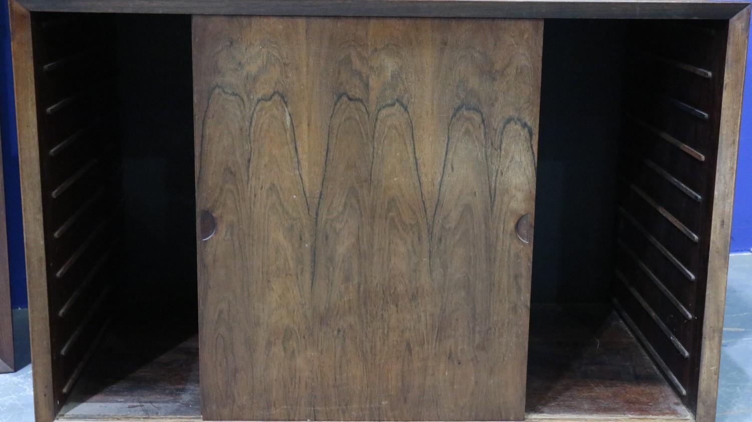 Mid-20th century modular wall mounting units, including a chest of three drawers, drop-front drinks cabinet and two cupboards, with two slim display cabinets and additional panels. All reverse panels with angled dowels, no mounting panels are included. Not available for in-house P&P