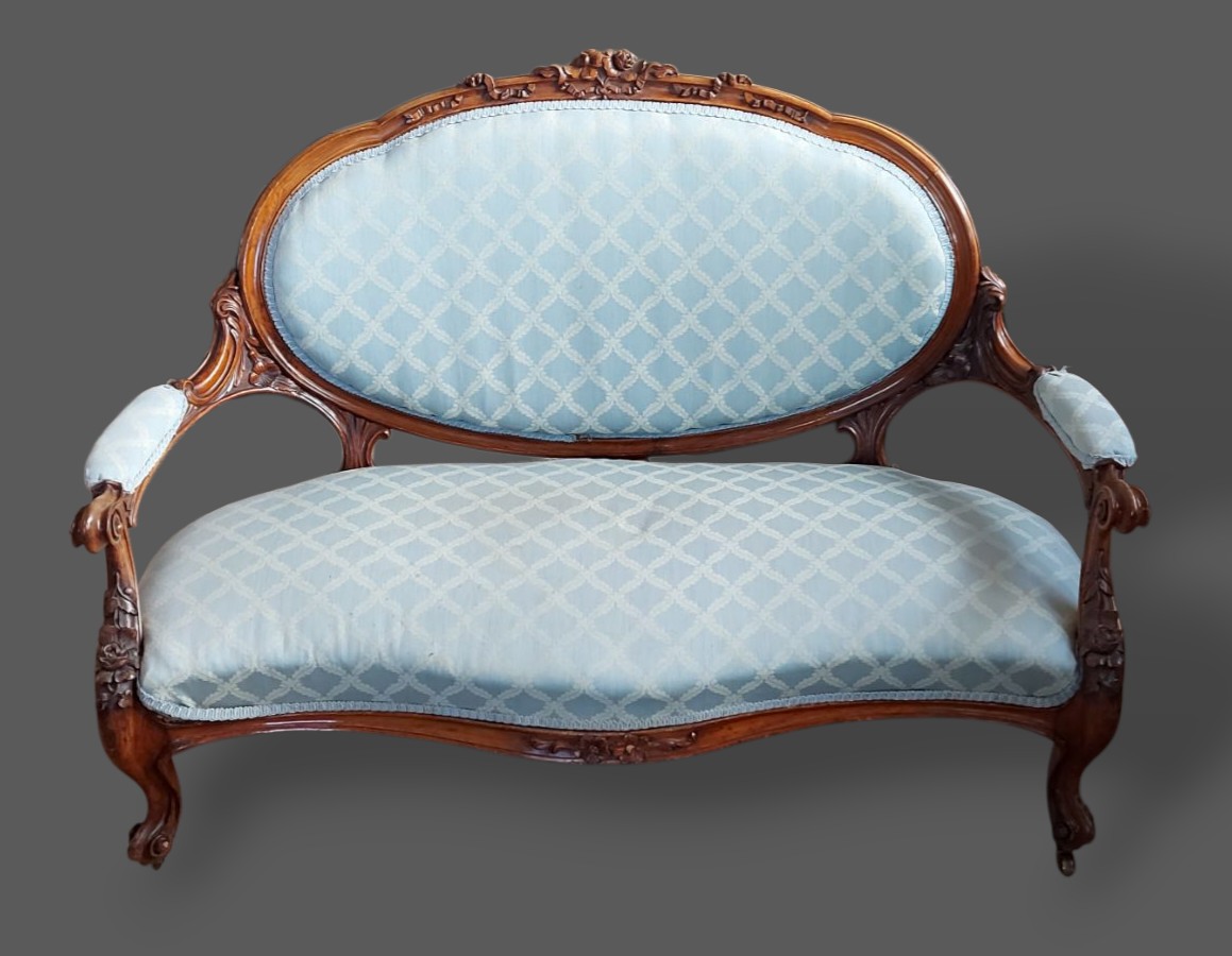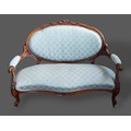 A Victorian mahogany settee, the carved oval and upholstered back above a stuffover seat raised upon carved cabriole legs with scroll feet, 135cms wide