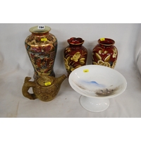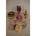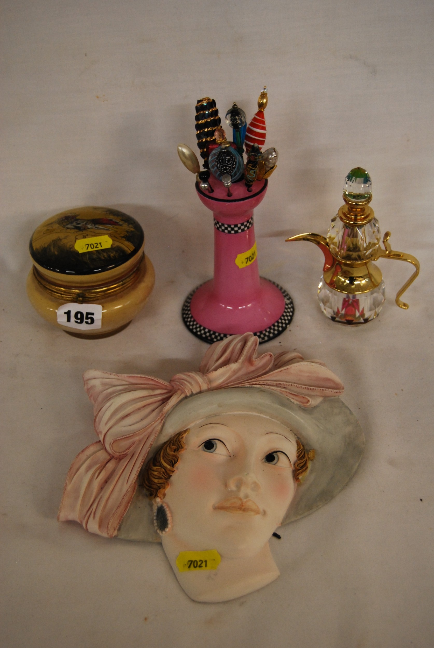 CHINA HAT PIN STAND AND PINS, HAND PAINTED GLASS BOX, ART NOUVEAU STYLE WALL PLAQUE, CRYSTAL & GOLD PLATED KETTLE PAPERWEIGHT