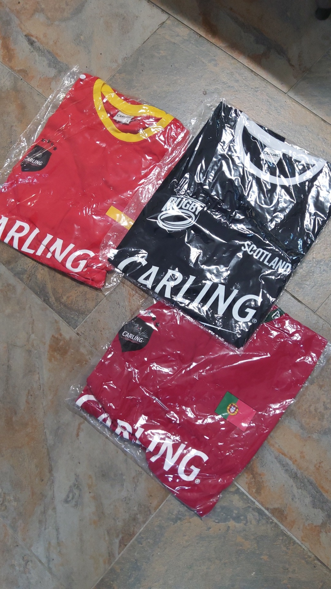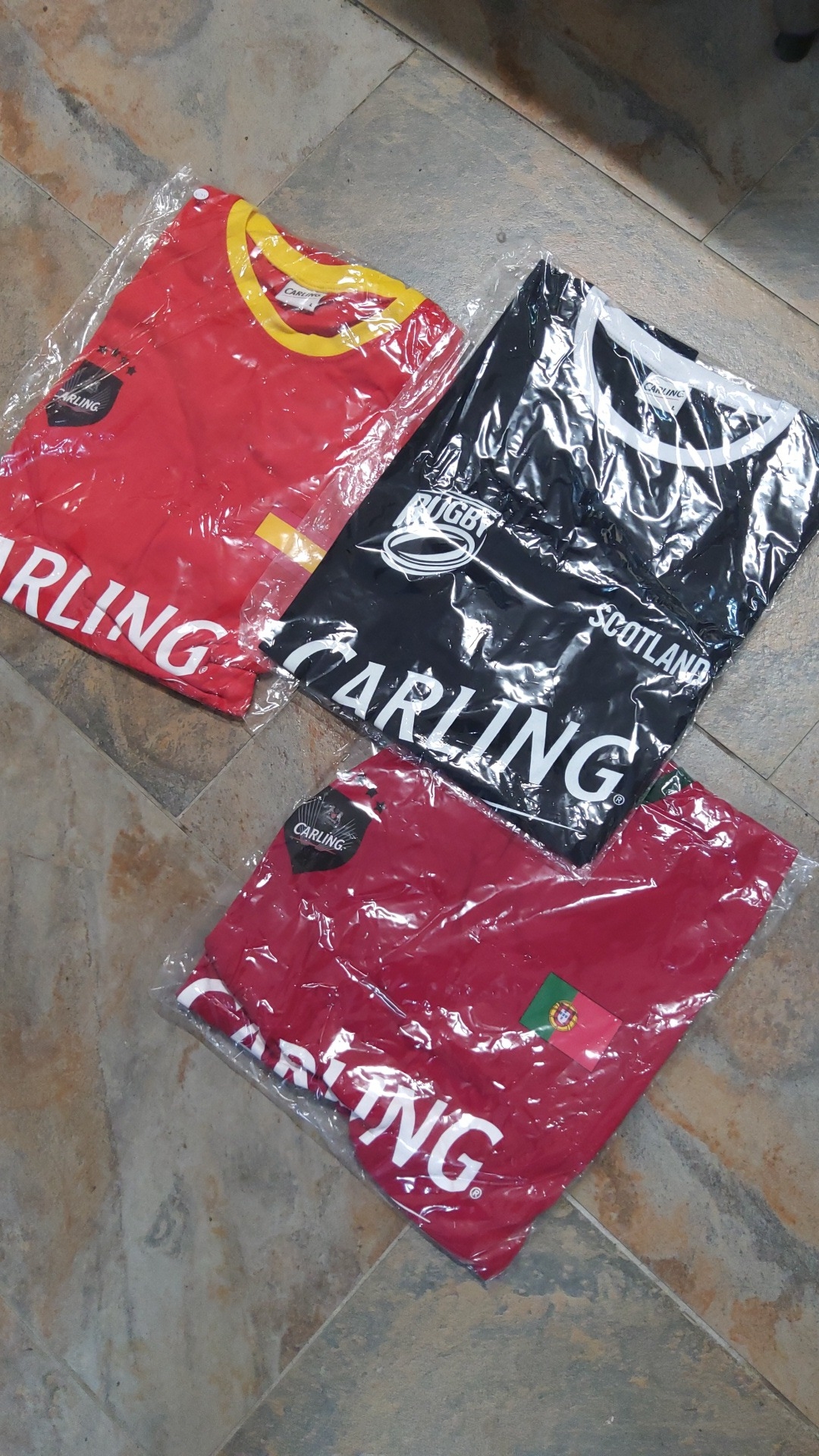 A group of Carling-branded shirts (Portugal & Spain soccer + Scotland Rugby all size large)