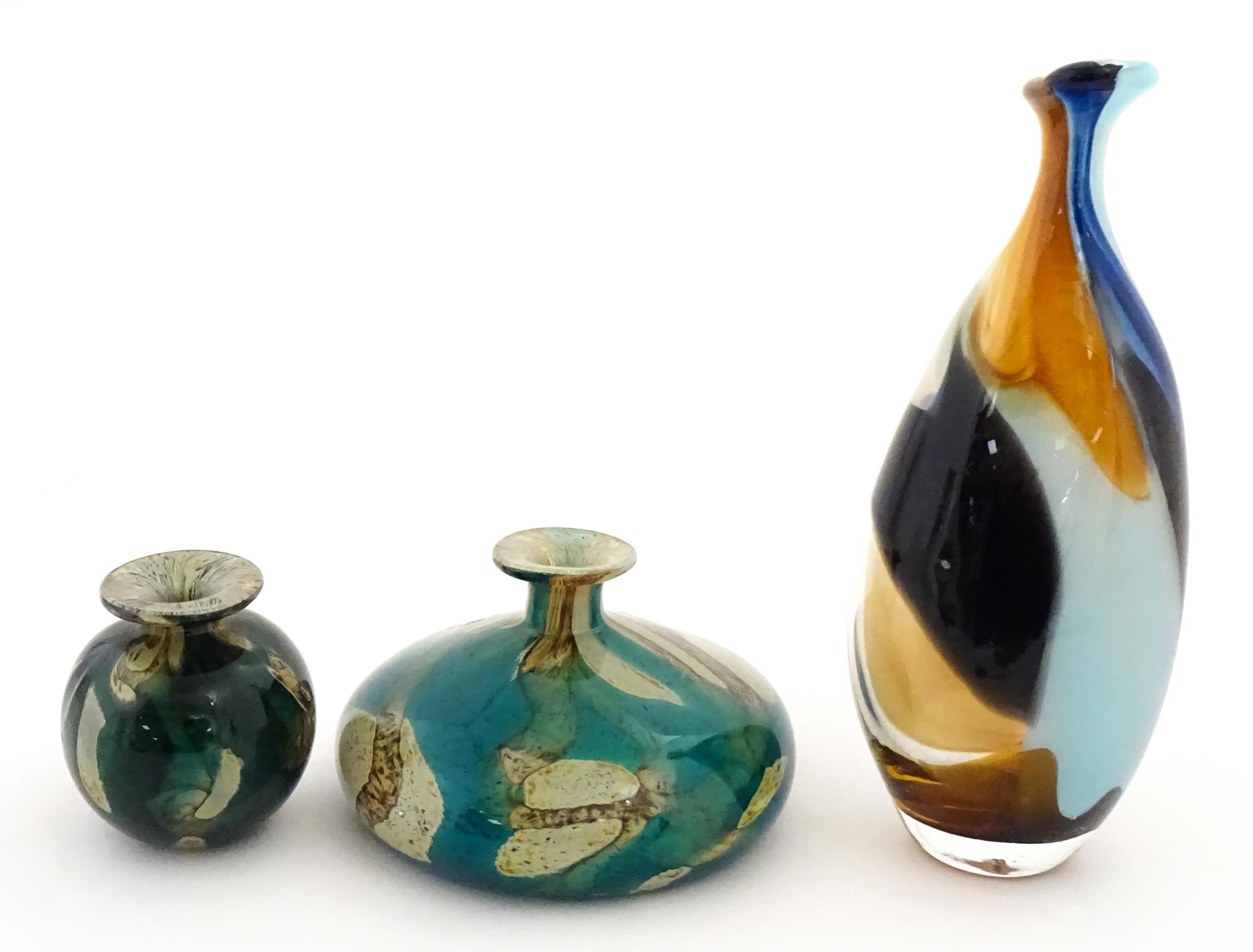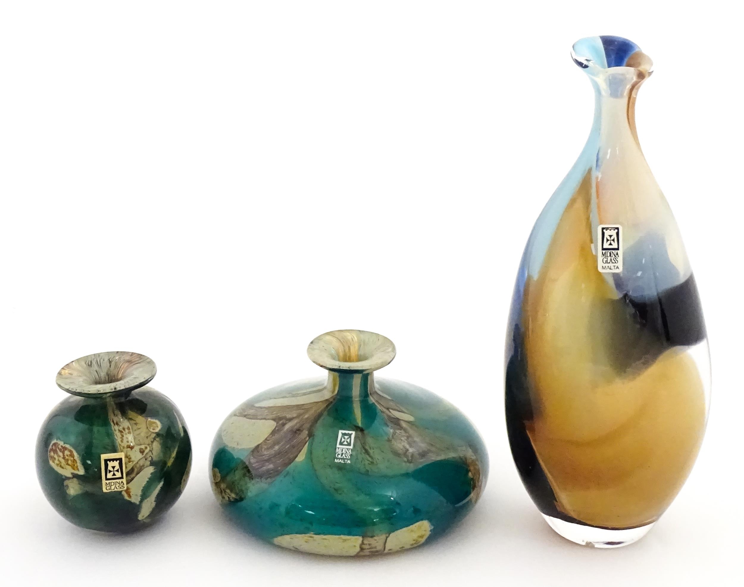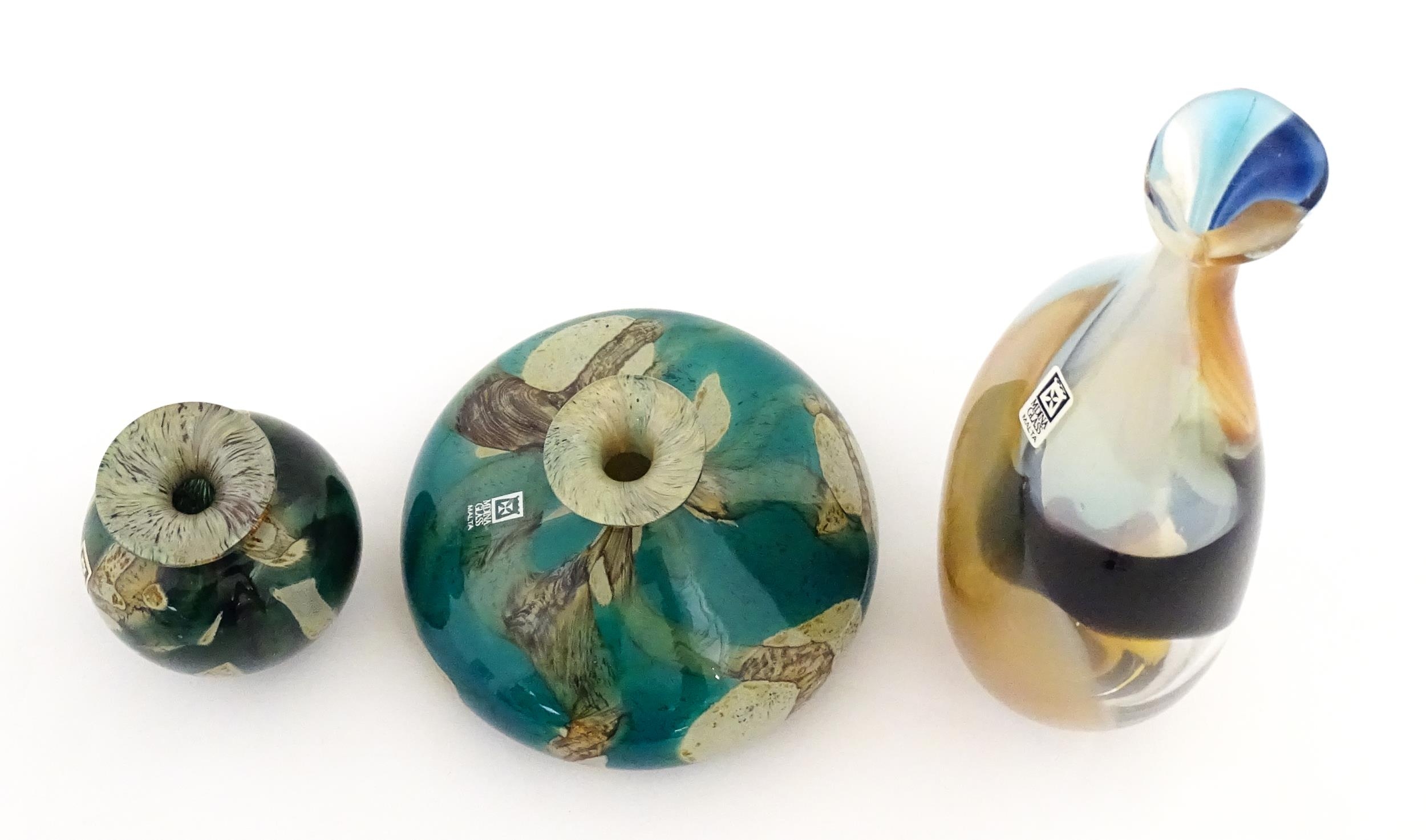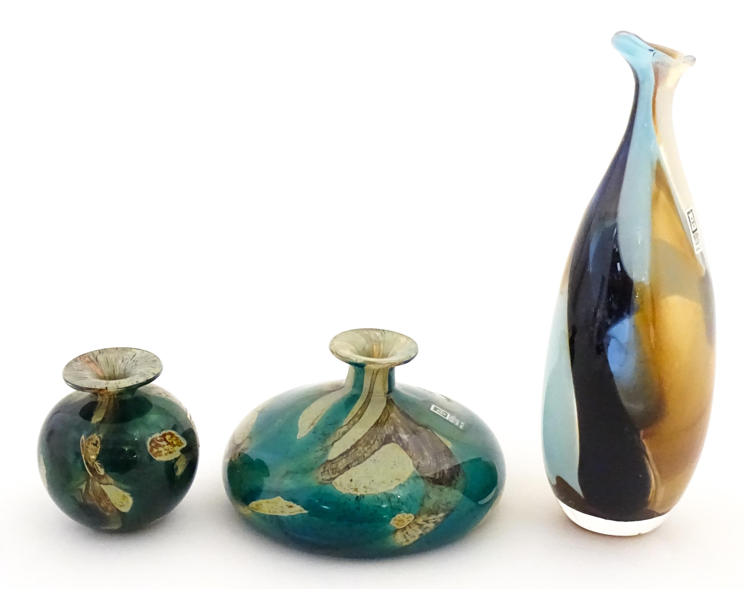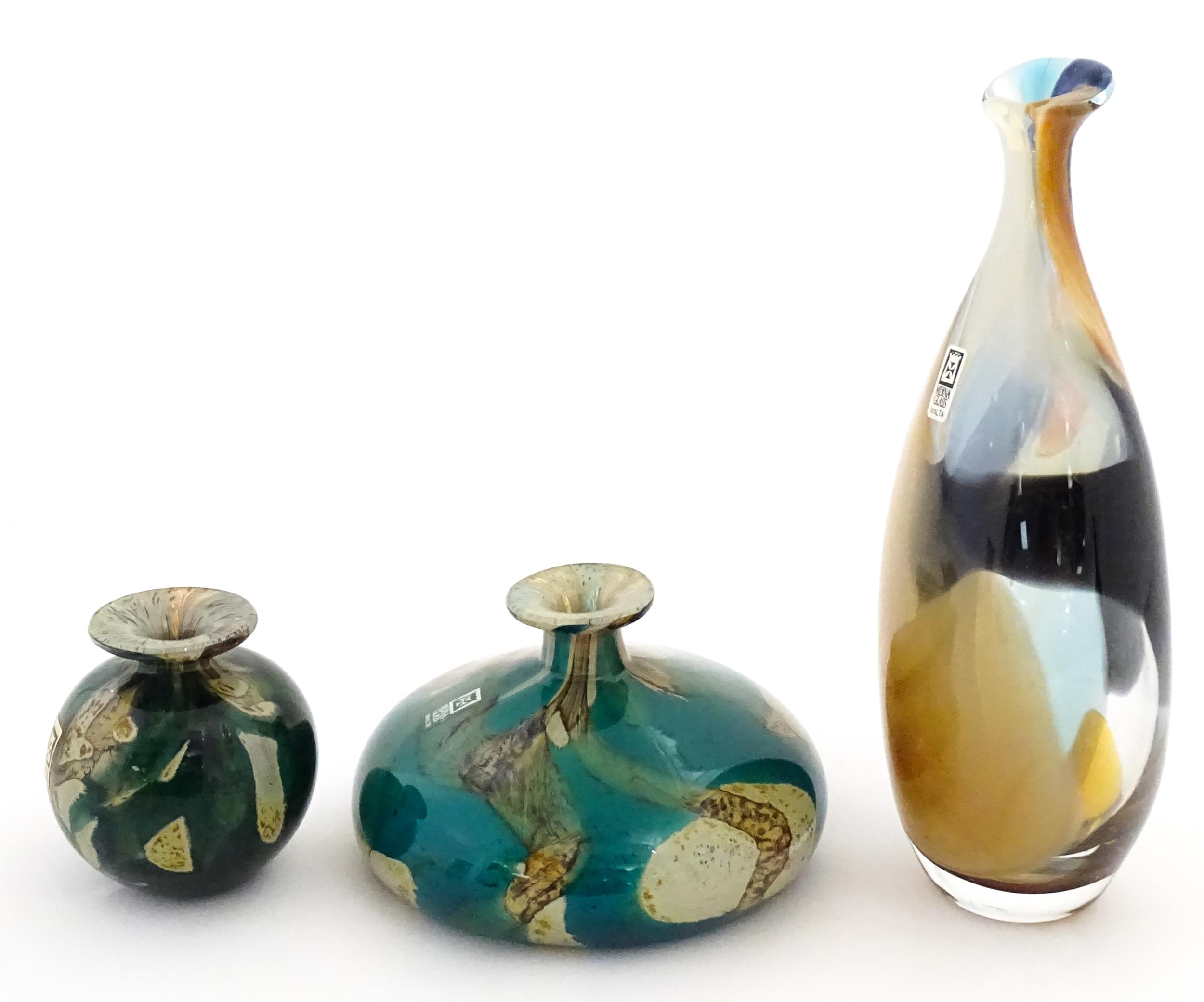 Three Mdina vases to include a squat vase in the Marble pattern, and one in the Tiger pattern. One signed and numbered under, the other two with Mdina labels. Tallest approx. 9 1/4" high (3)