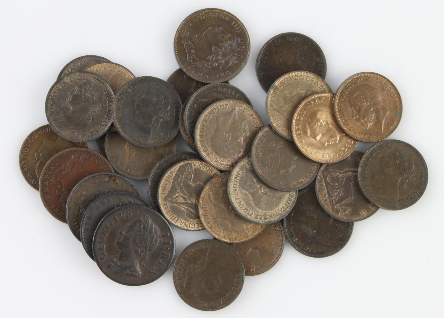 GB Farthings (31) 1754 to 1952, mixed grade including high grade, Victorian bun heads with lustre noted; also: 1821 GVF, 1821 EF light edge knock, 1825 GVF, 1885 EF, 1886 aEF, 1894 EF, 1895 young heads VF and GF, etc.