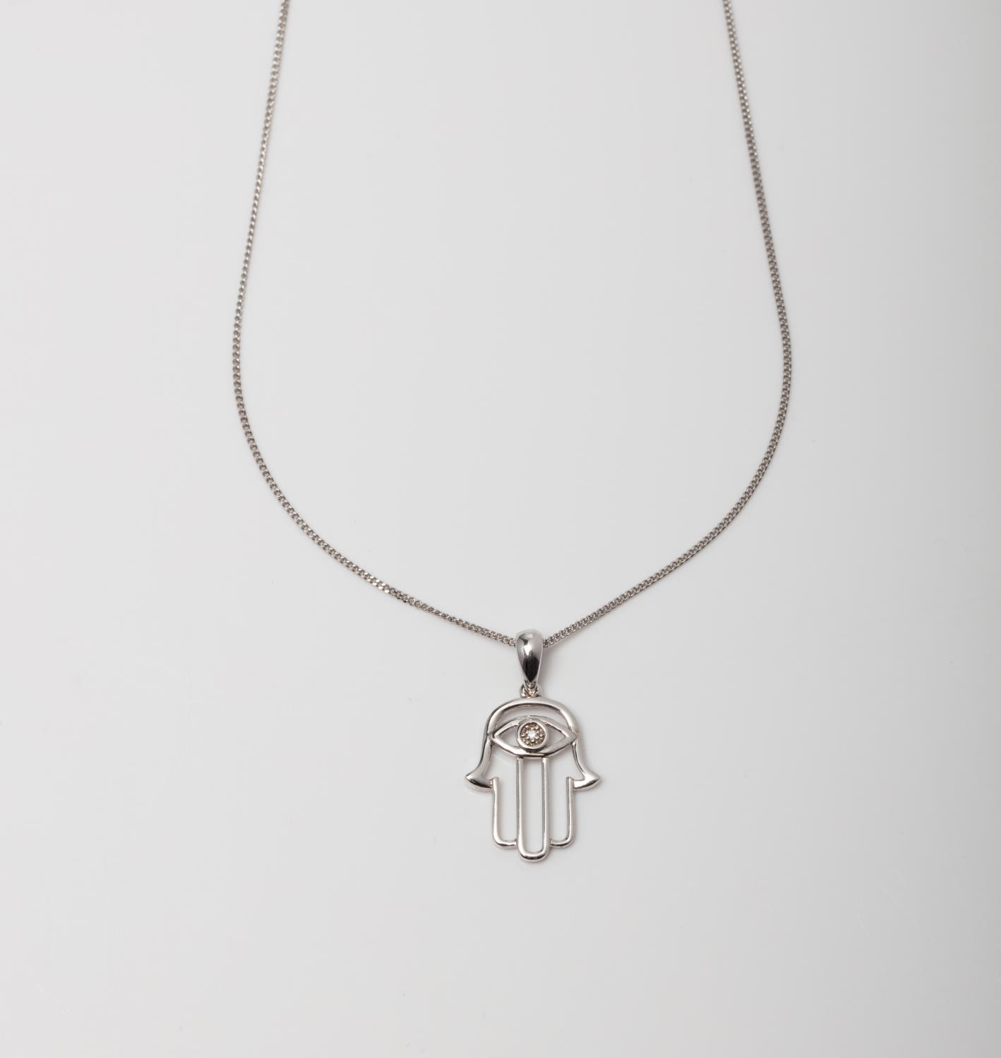 A SILVER DIAMOND HAMSA HAND PENDANT ON A 45CM CHAIN Crafted in Sterling Silver set with 2 Round Diamondsweighing 0.004ct