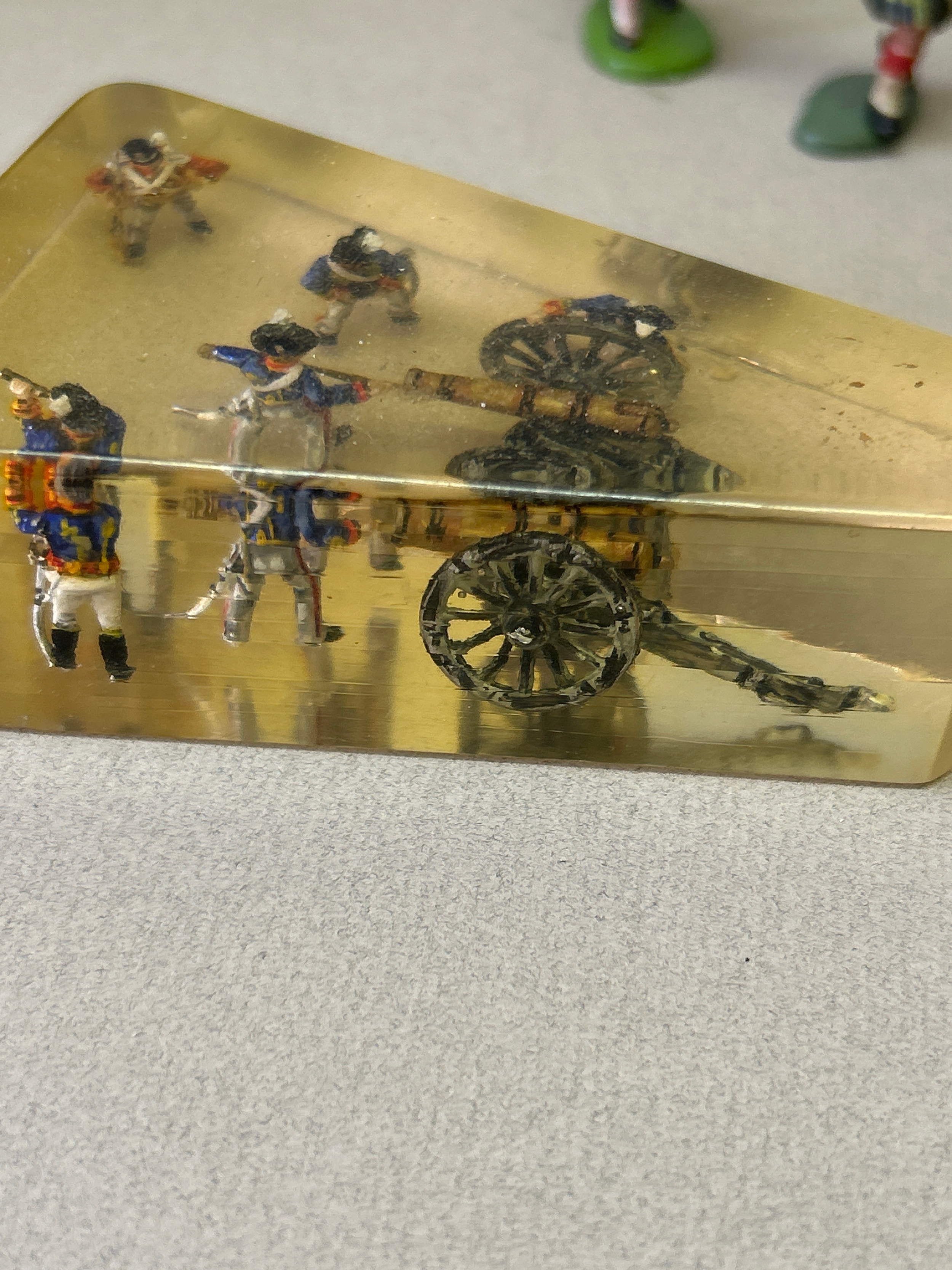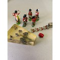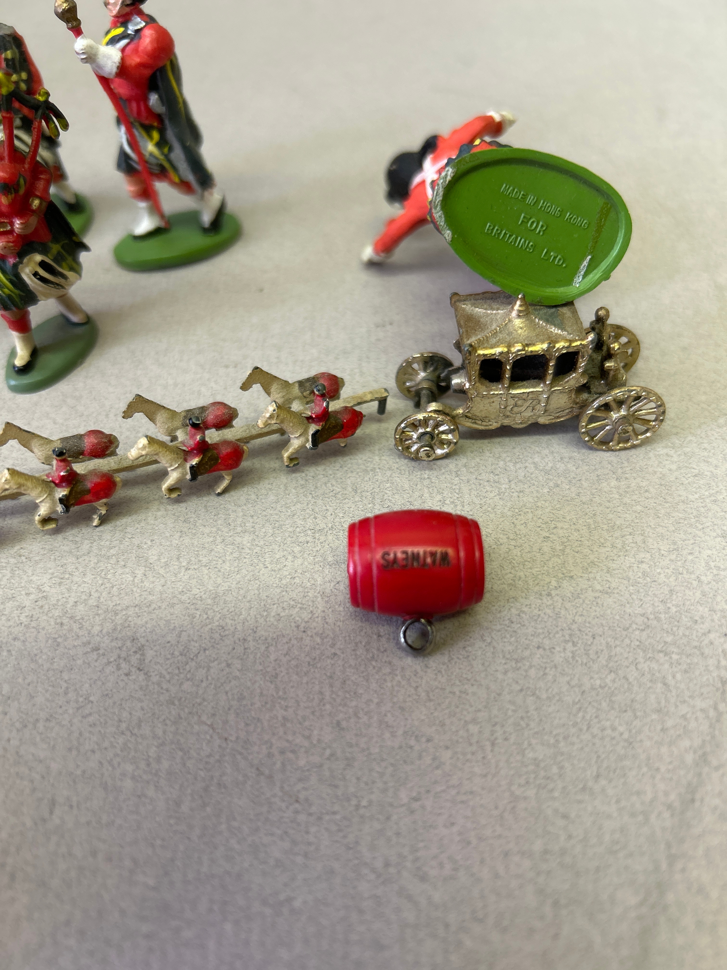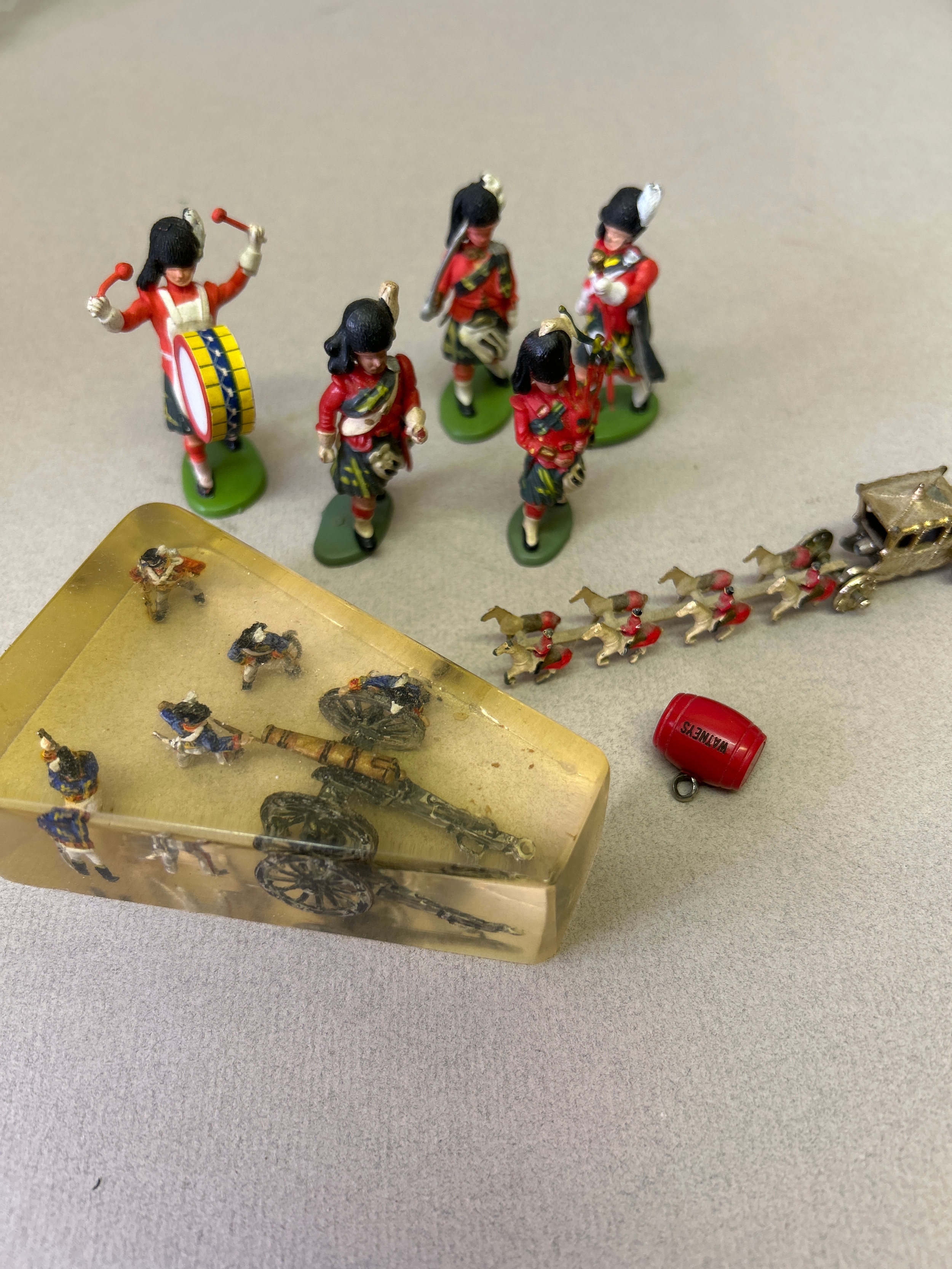 Military & mixed including 5 Britains bandsmen (plastic “Made in Hong Kong for Britains”) miniature Napoleonic group with cannon in lucite block, coronation coach & horses & a Watneys Ale fob