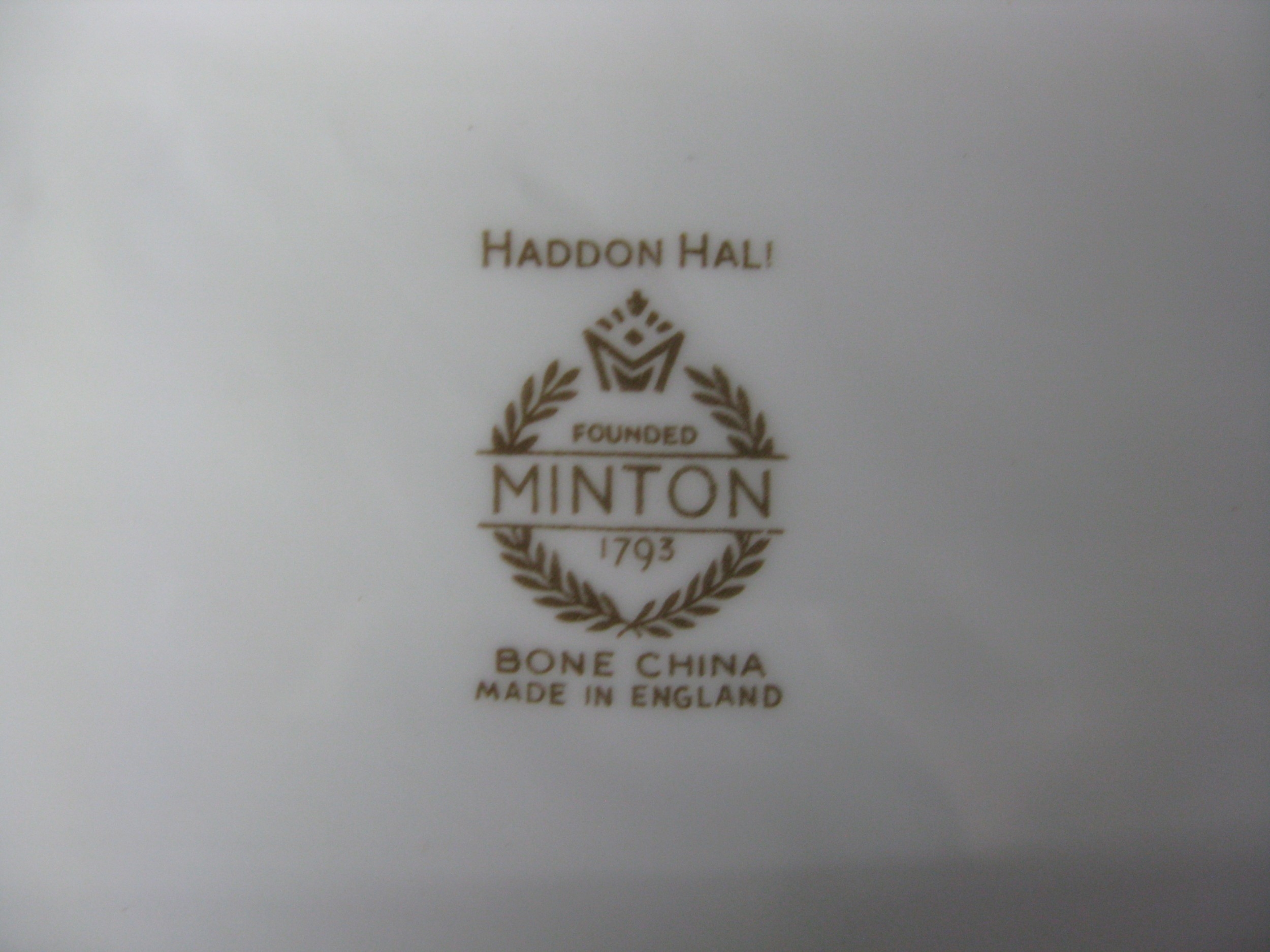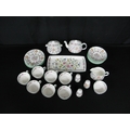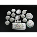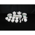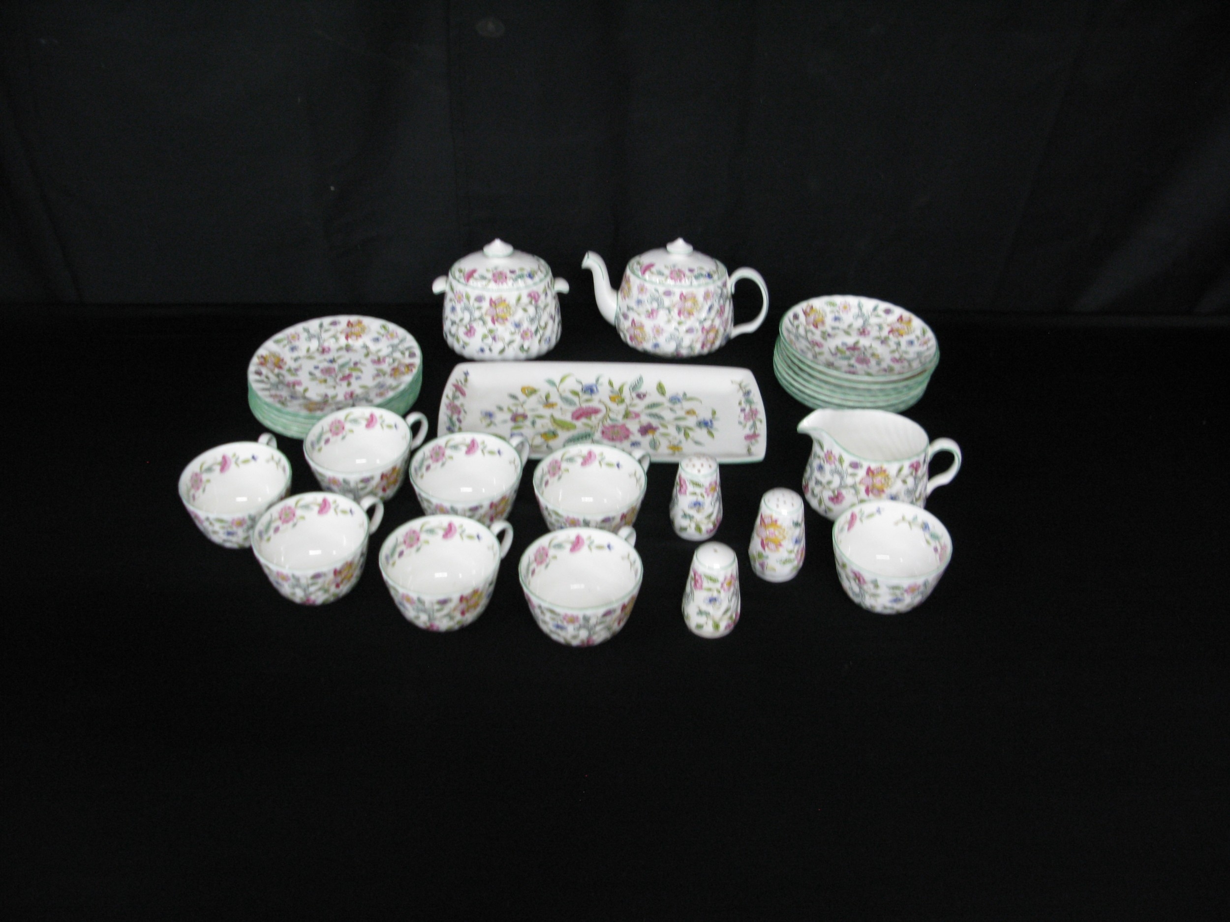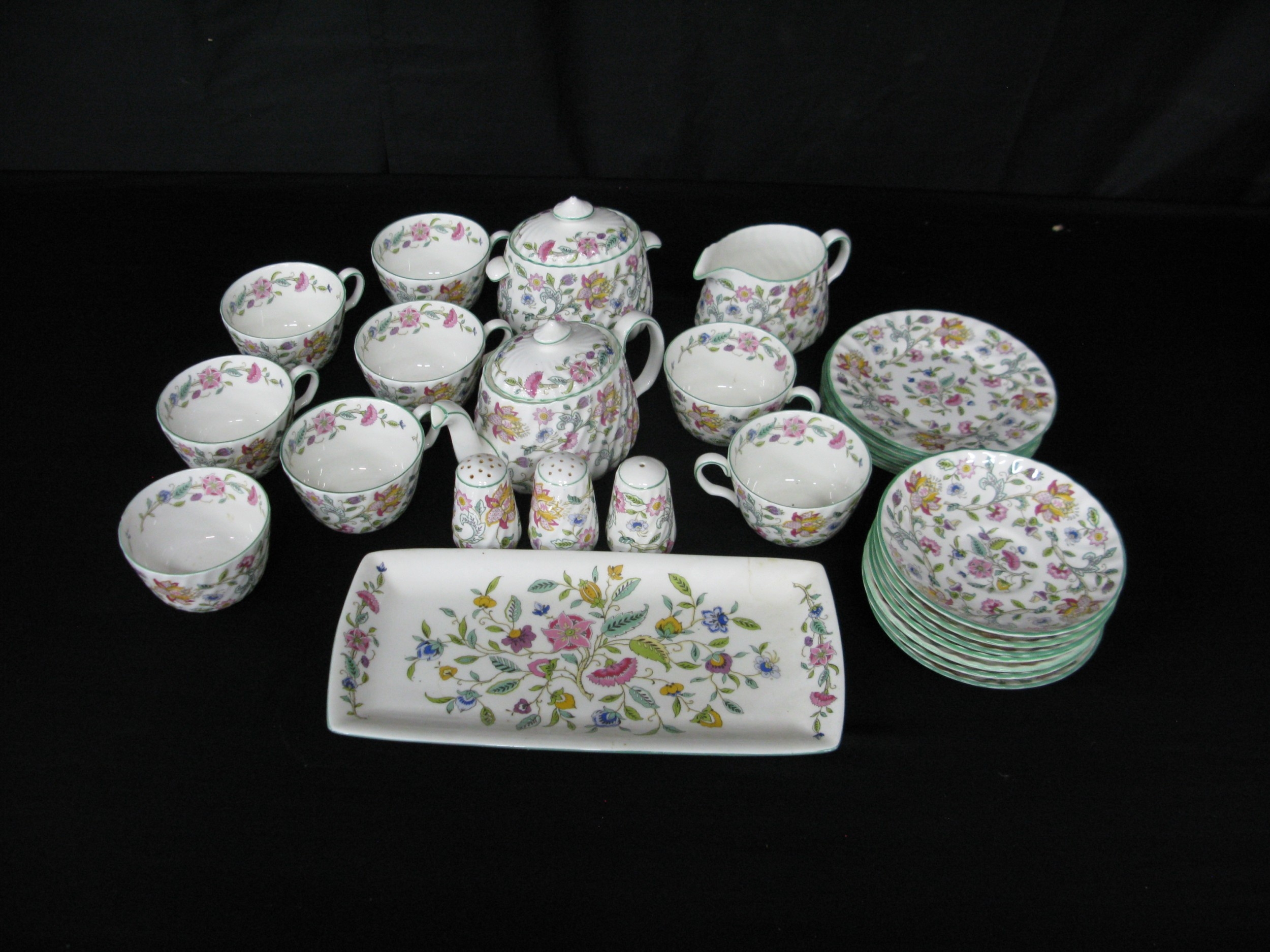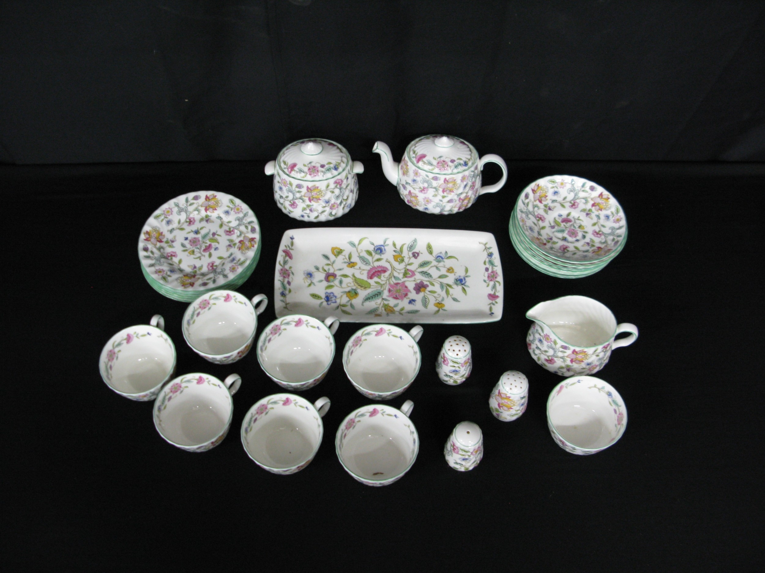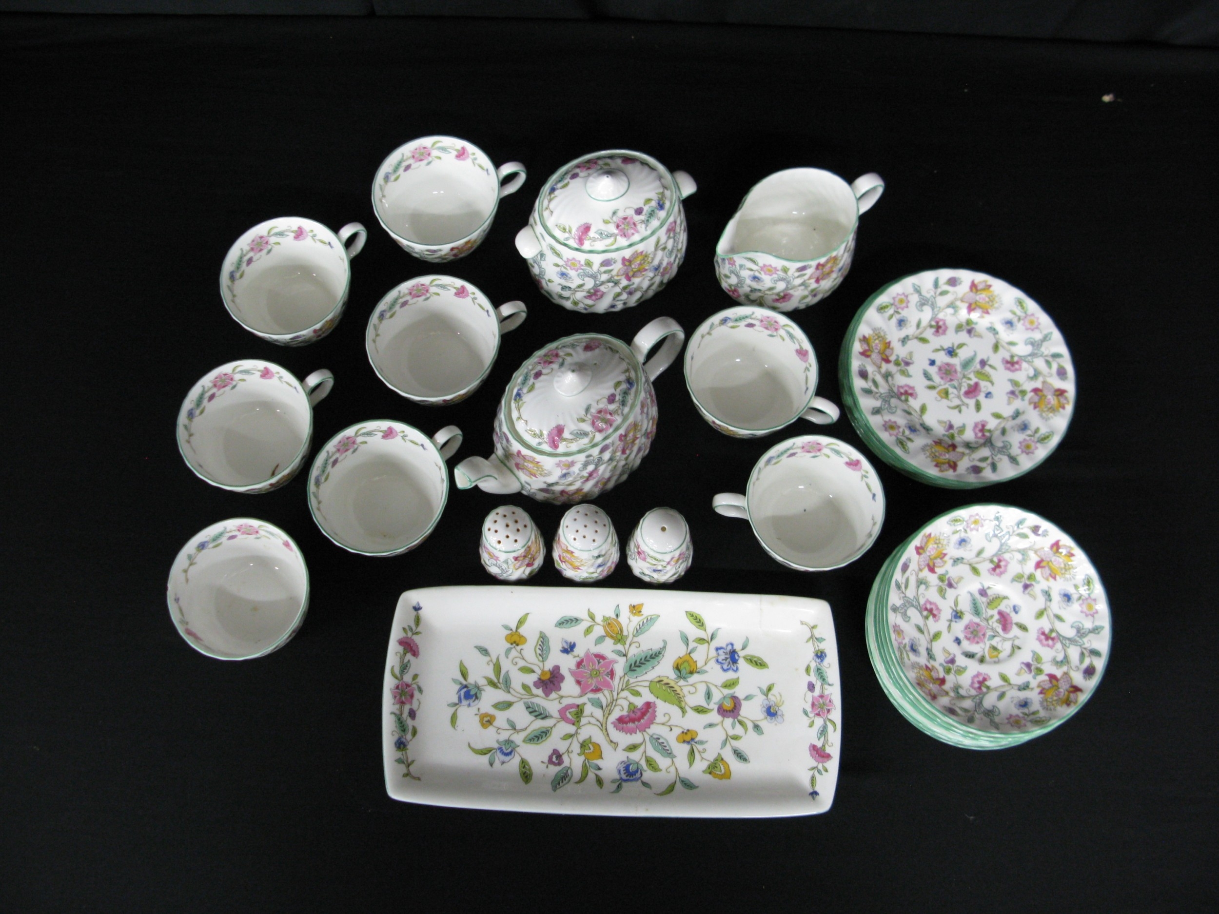 Minton Haddon Hall part tea and dinner ware to comprise: six tea cups, seven 14.5cm saucers, six 16cm side plates, sugar bowl, milk jug, teapot, lidded sugar bowl, 29cm serving plate, salt pot and two pepper pots