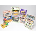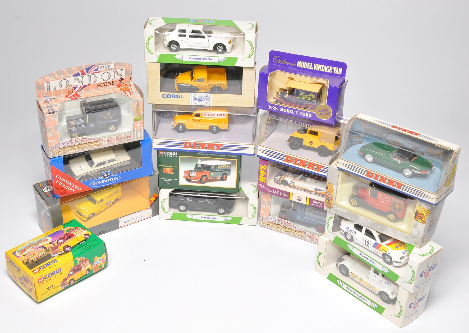 A group of 17 x diecast model vehicles to include vans & cars. Individual models comprise 1) Onyx cars Jaguar XJR-9, 2) Matchbox Dinky 1968 Jaguar E Type MK 1 1/2 3) Motoring Memories Metropolitan Police Van, 4) Corgi Classics Morris 1000 Advance Publicity Van Set, 5) Mobil Peugeot 205 T16 , plus others as shown. All appear mostly excellent in original boxes, from an ex-shop collection.