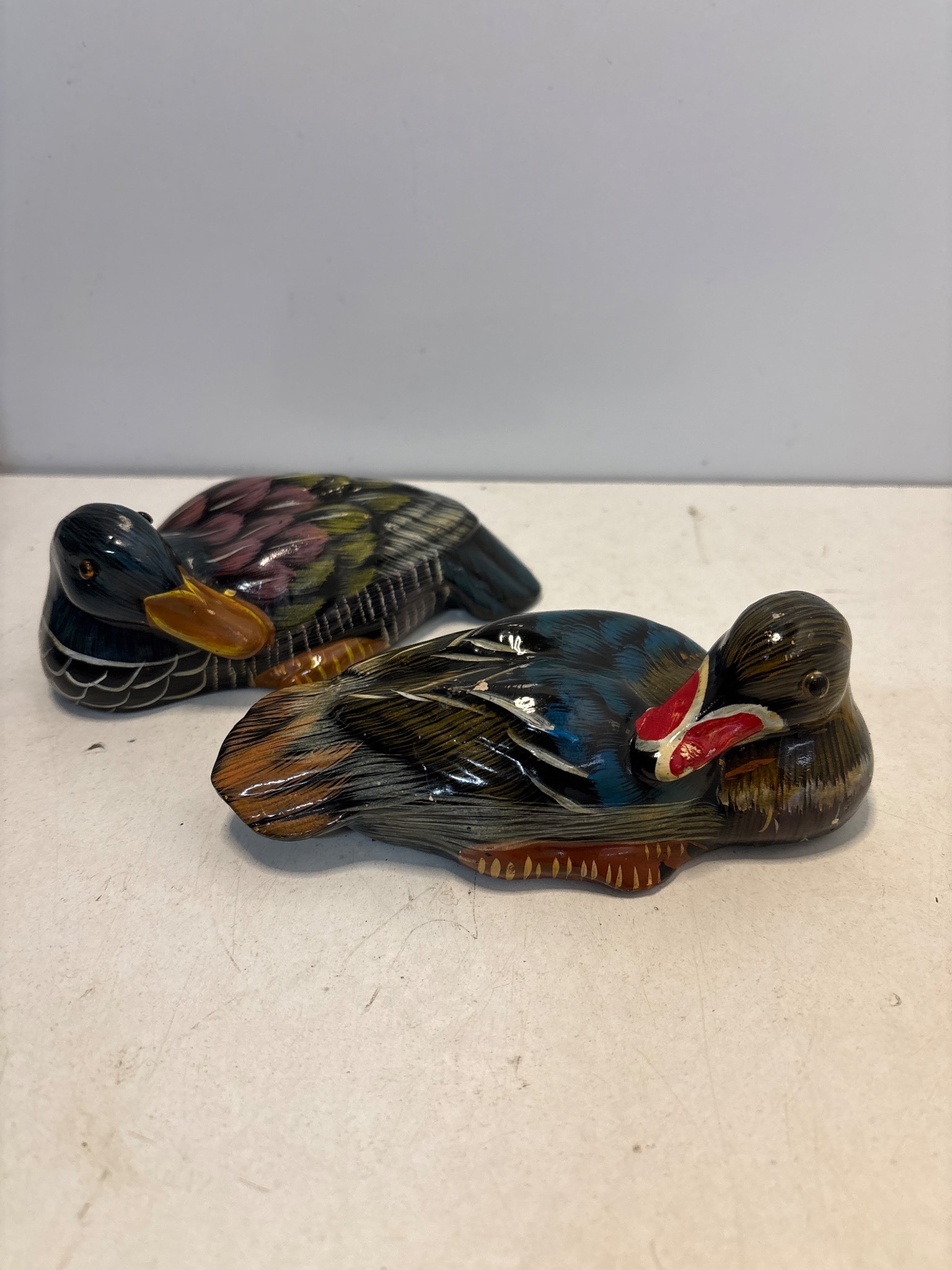 Ceramic ducks, multicolored, in good condition.
