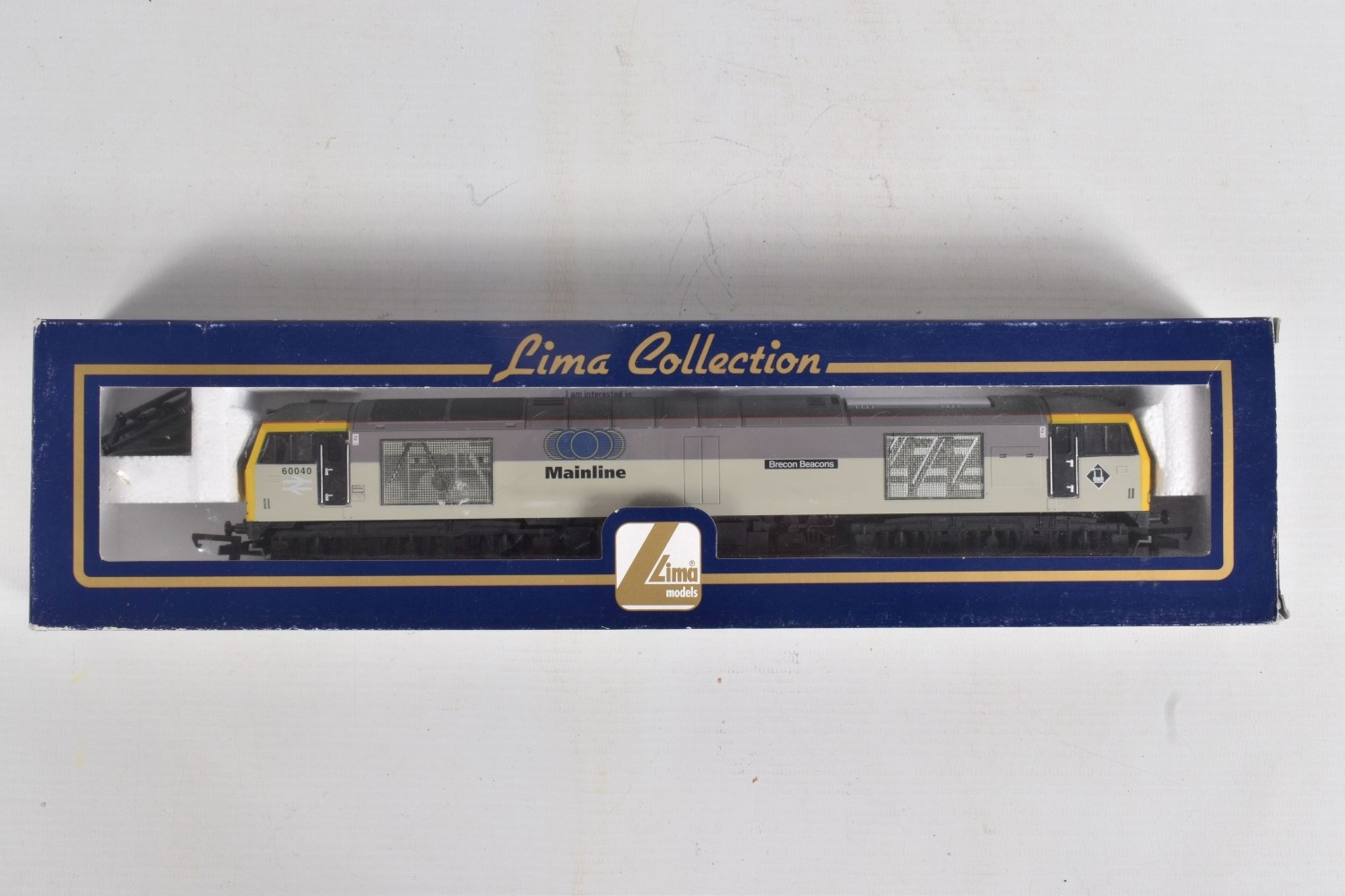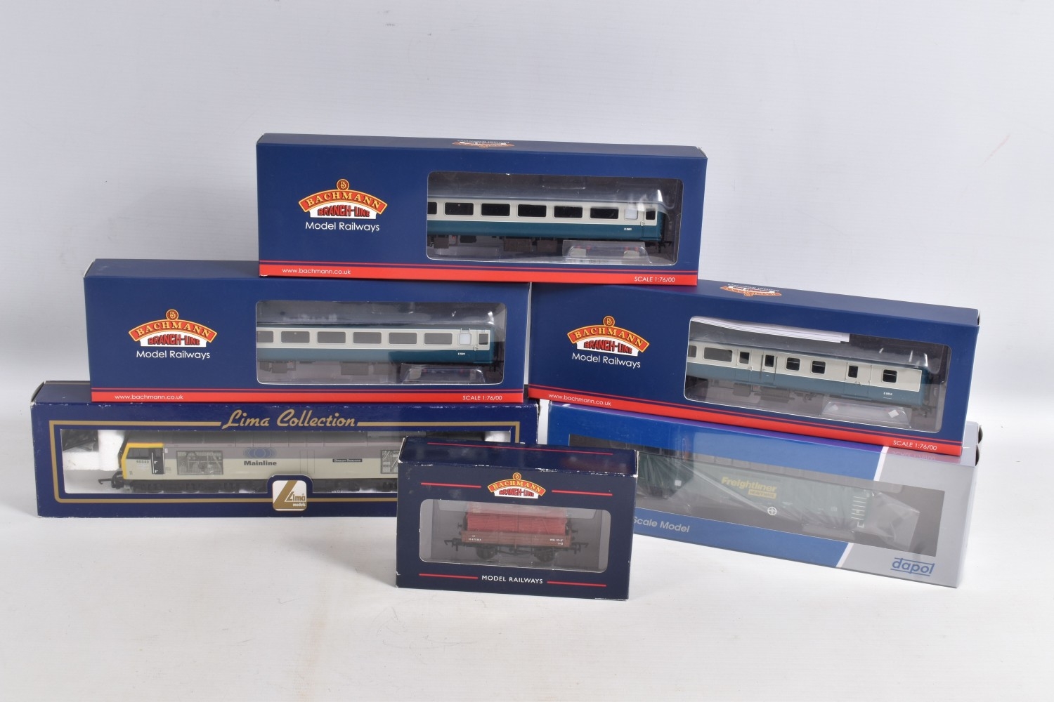 A QUANTITY OF BOXED OO GAUGE MODEL RAILWAY ITEMS, Lima class 60 'Brecon Beacons' No.60 040, Mainline on Railfreight grey livery (L204876), three boxed Bachmann B.R. Mk.2F coaches, 2 x TSO Tourist Second Open (39-675DC) and a BSO Brake Second Open (39-700DC), all in B.R. InterCity blue and grey and possibly fitted with DCC chips, 2 x Dapol MJA Freightliner Heavy Haul Bogi Box Van, Freightliner logo detached from one side of one model but present in box (4F-025-005), with a Bachmann 3 plank wagon with bauxite BD container (37-930), all models appear complete and in very good condition, except as noted above, locomotive with unfitted accessories, boxes all in fairly good condition (7)
