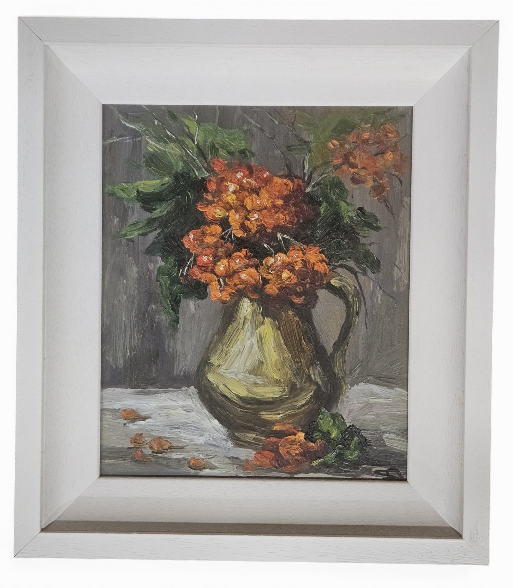 Sarah Adams, Irish Oil on Board still life initialed LR and signed verso. 29 x 24 cm approx.
