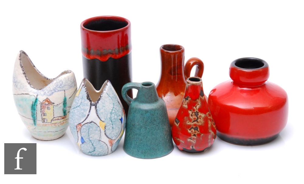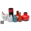 Jopeko Keramik - A post war vase of squat form with swollen collar neck, glazed in red, retains label, with six other mid 20th Century West German vases, tallest 15.5cm. (7)