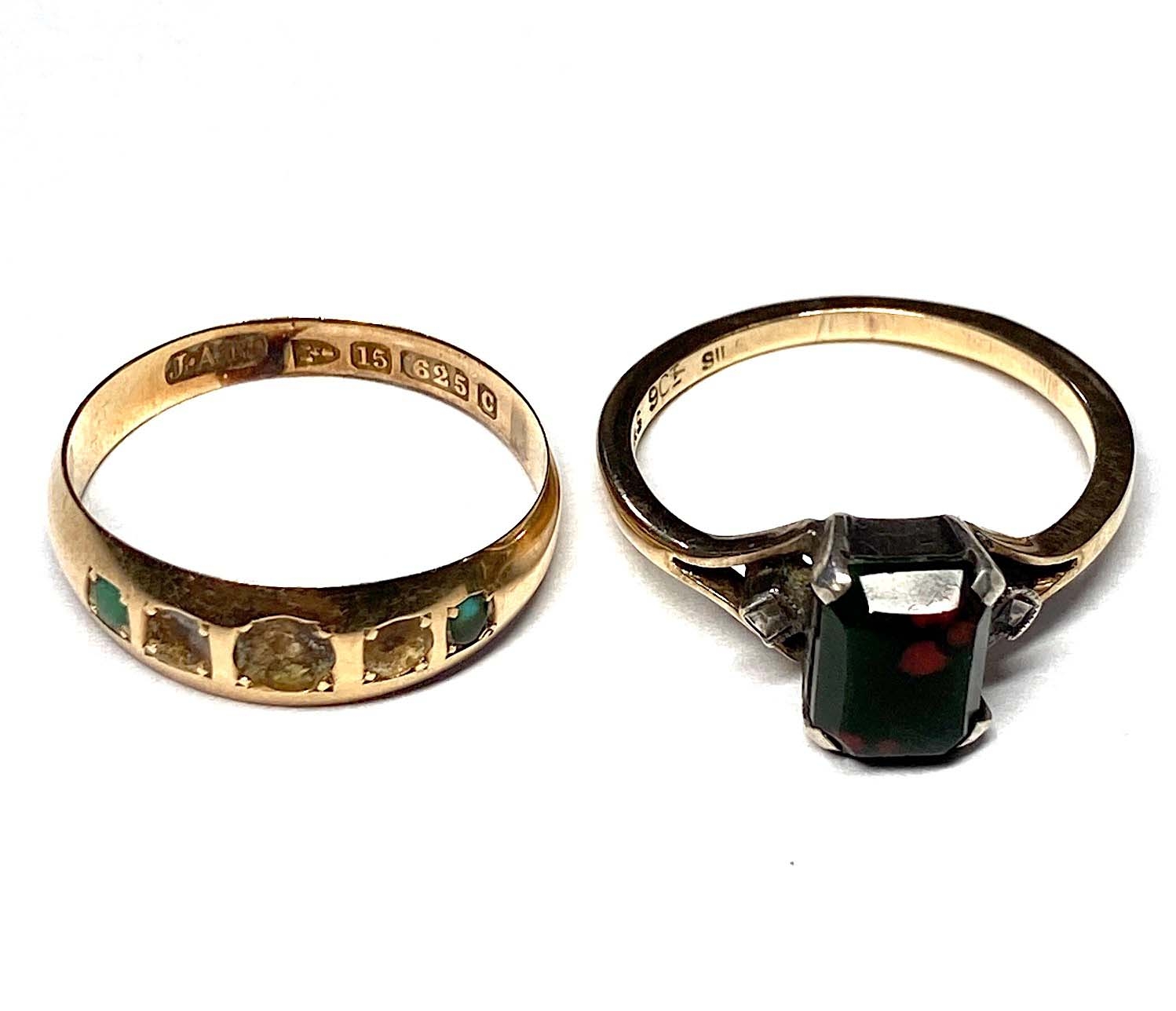 Two gold gem-set rings, to include a late Victorian 15ct gold turquoise ring, AF, marks to indicate 9ct gold, 15ct gold and silver, ring sizes N and N1/2, total weight 4.3g