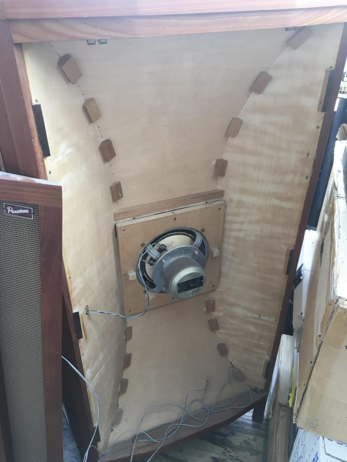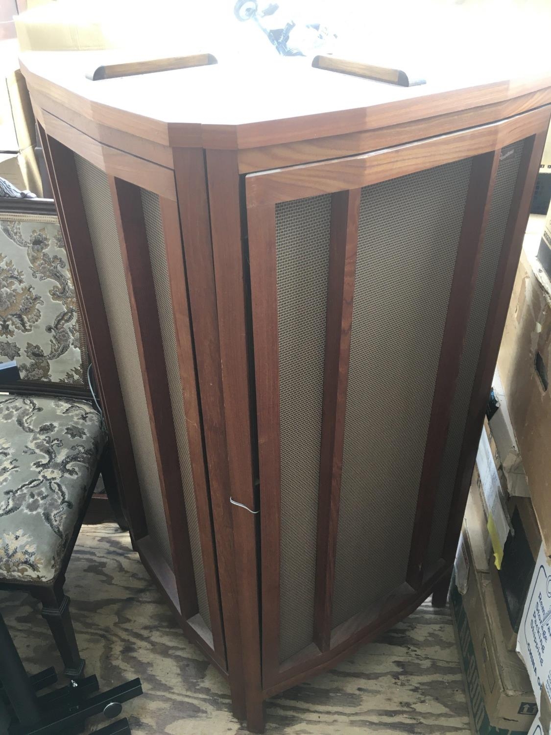 A pair of vintage Lowther Worden Panasona corner tower speakers, approx height 124cm.