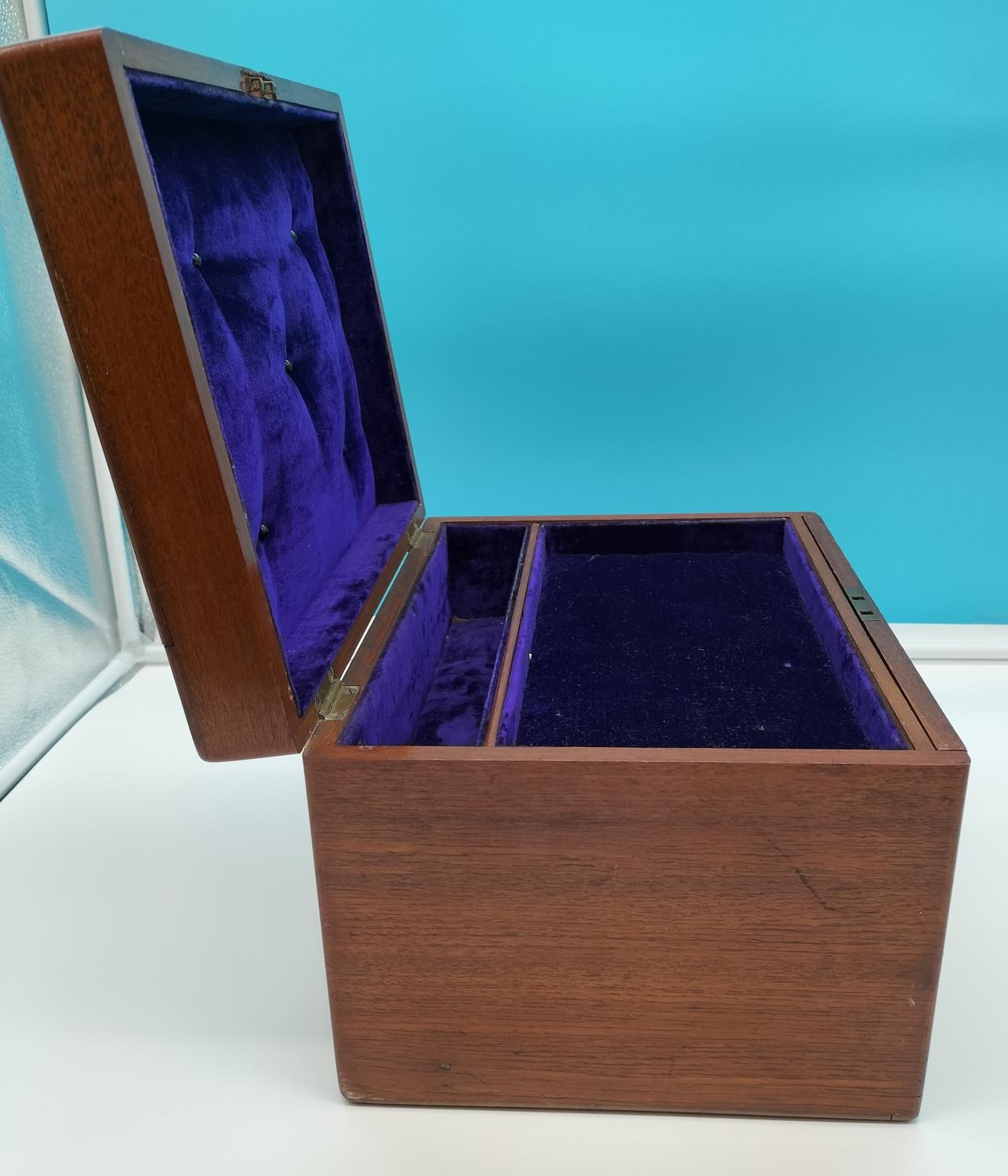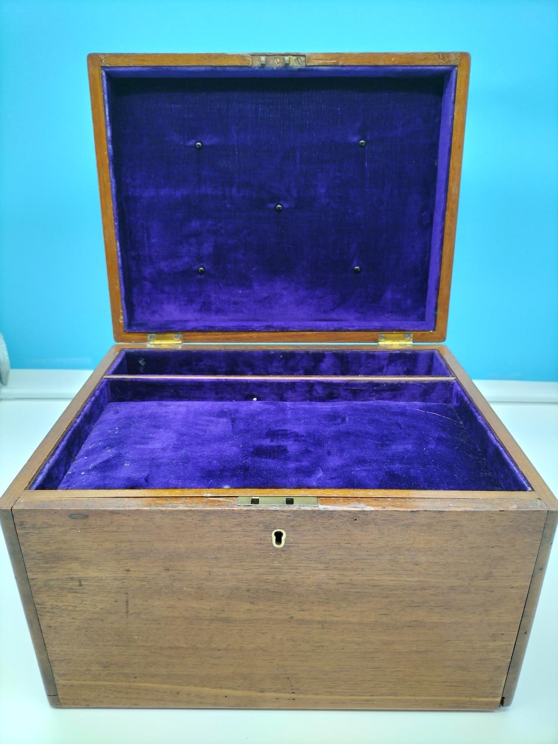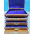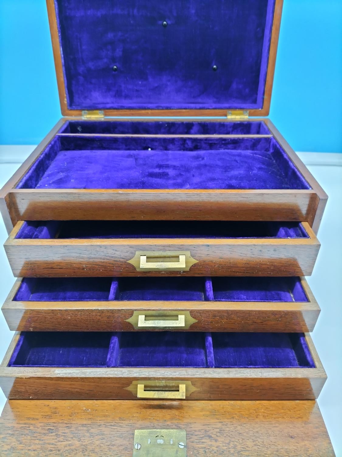 Oak Three Drawer Box with Purple Velvet Lining. 21cm High, 31cm x 24cm.