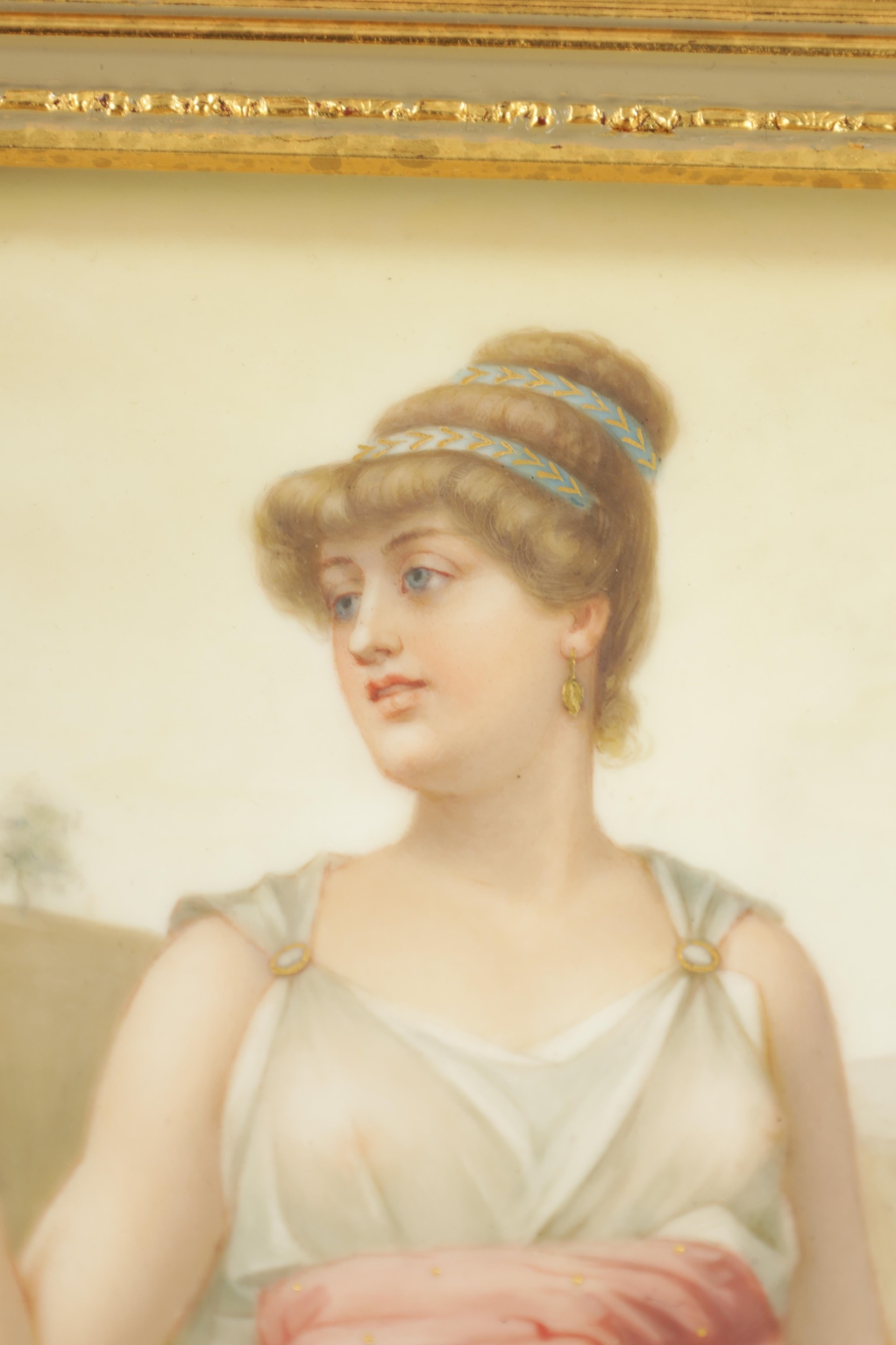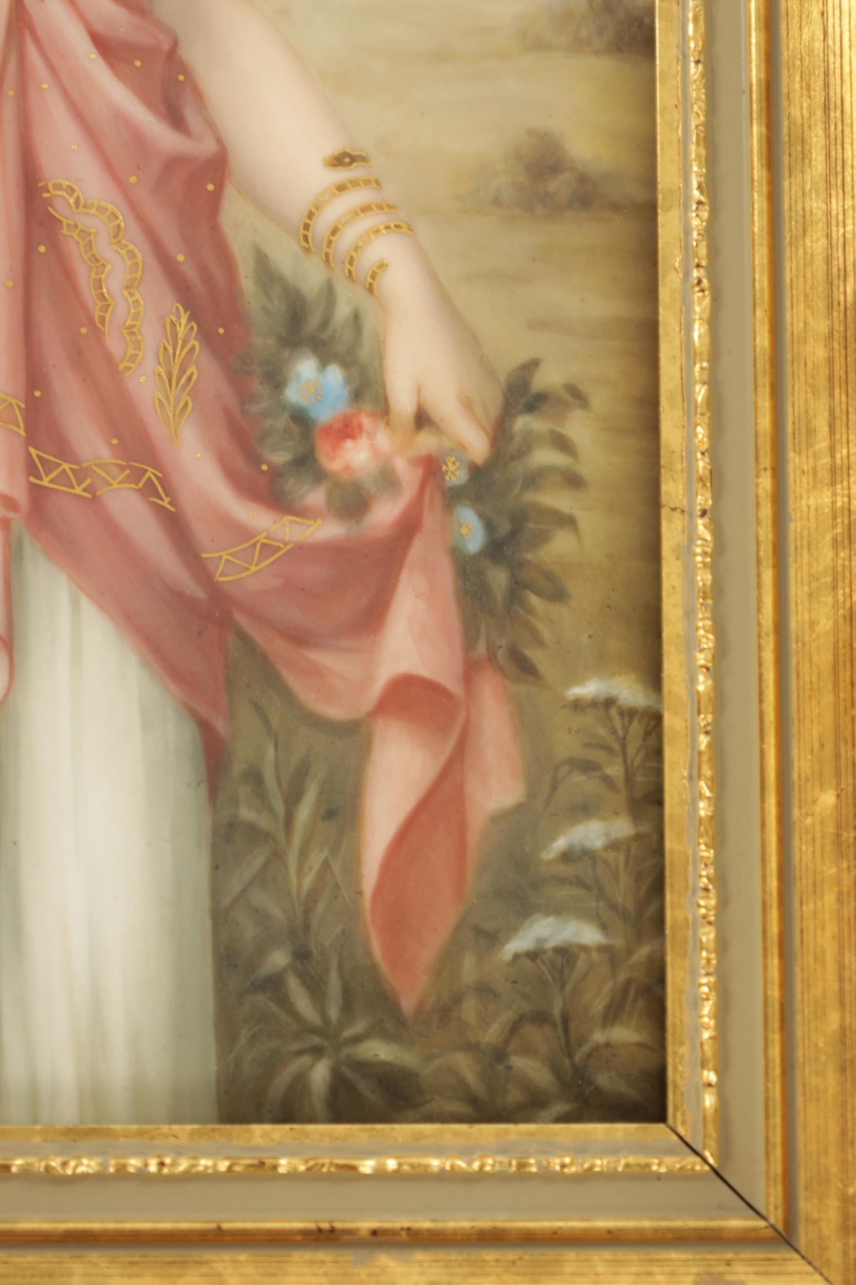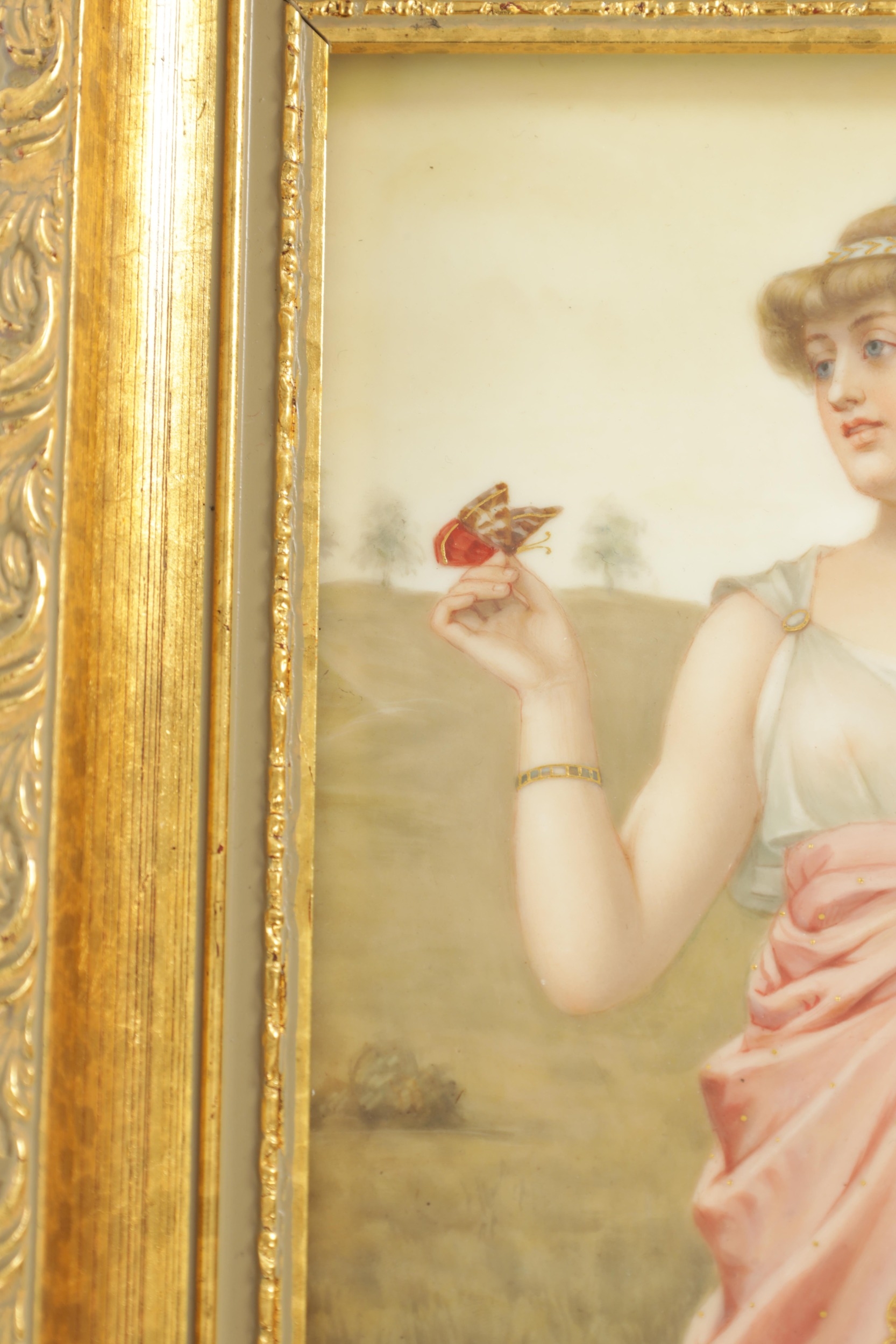 A FINE 19TH CENTURY KPM BERLIN PORCELAIN PLAQUE, full-length portrait of a young lady holding a bird in a landscape setting, impressed mark to verso - in gilt moulded frame (Plaque measures 22.5cm high, 14.5cm wide)