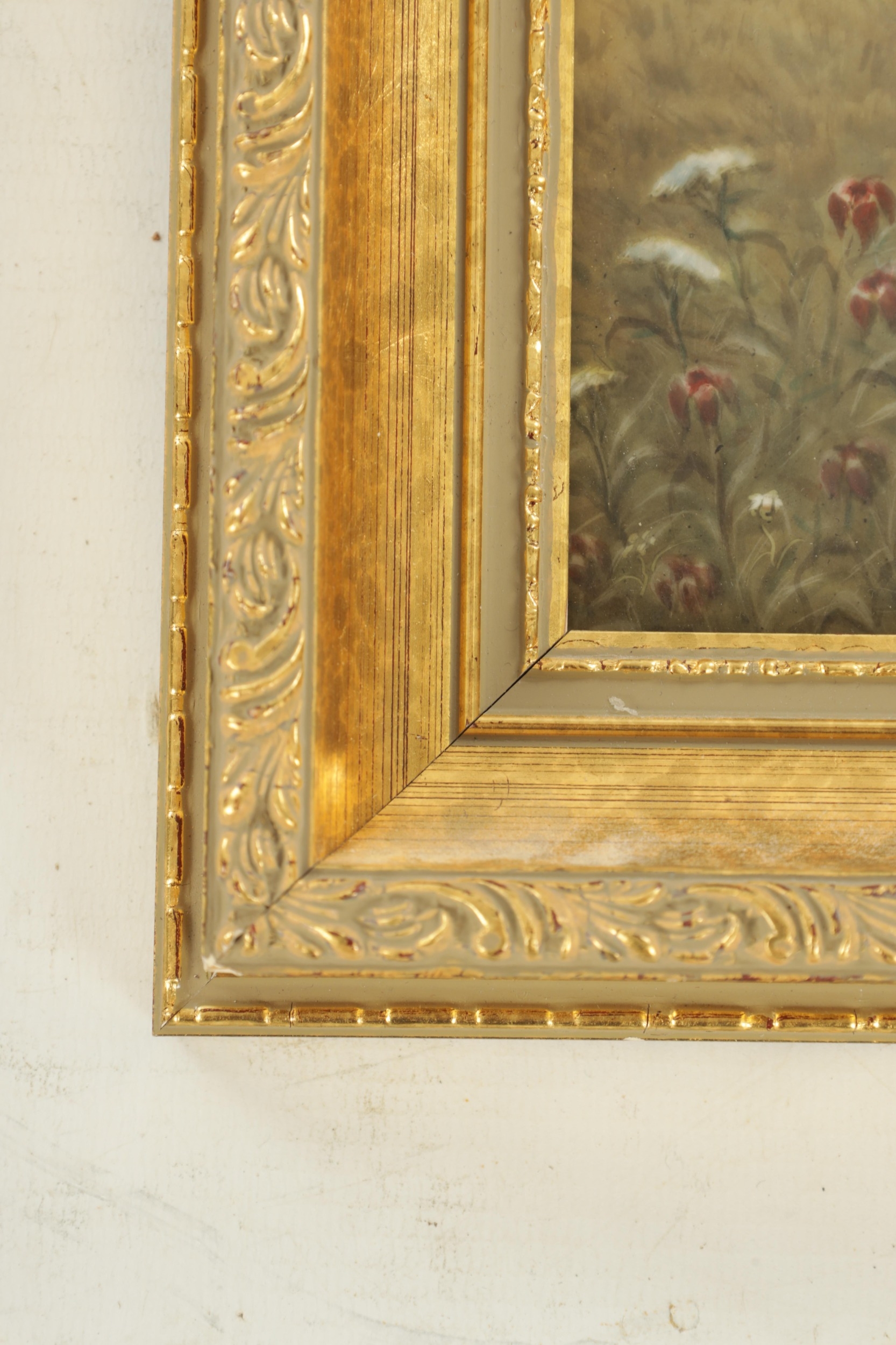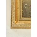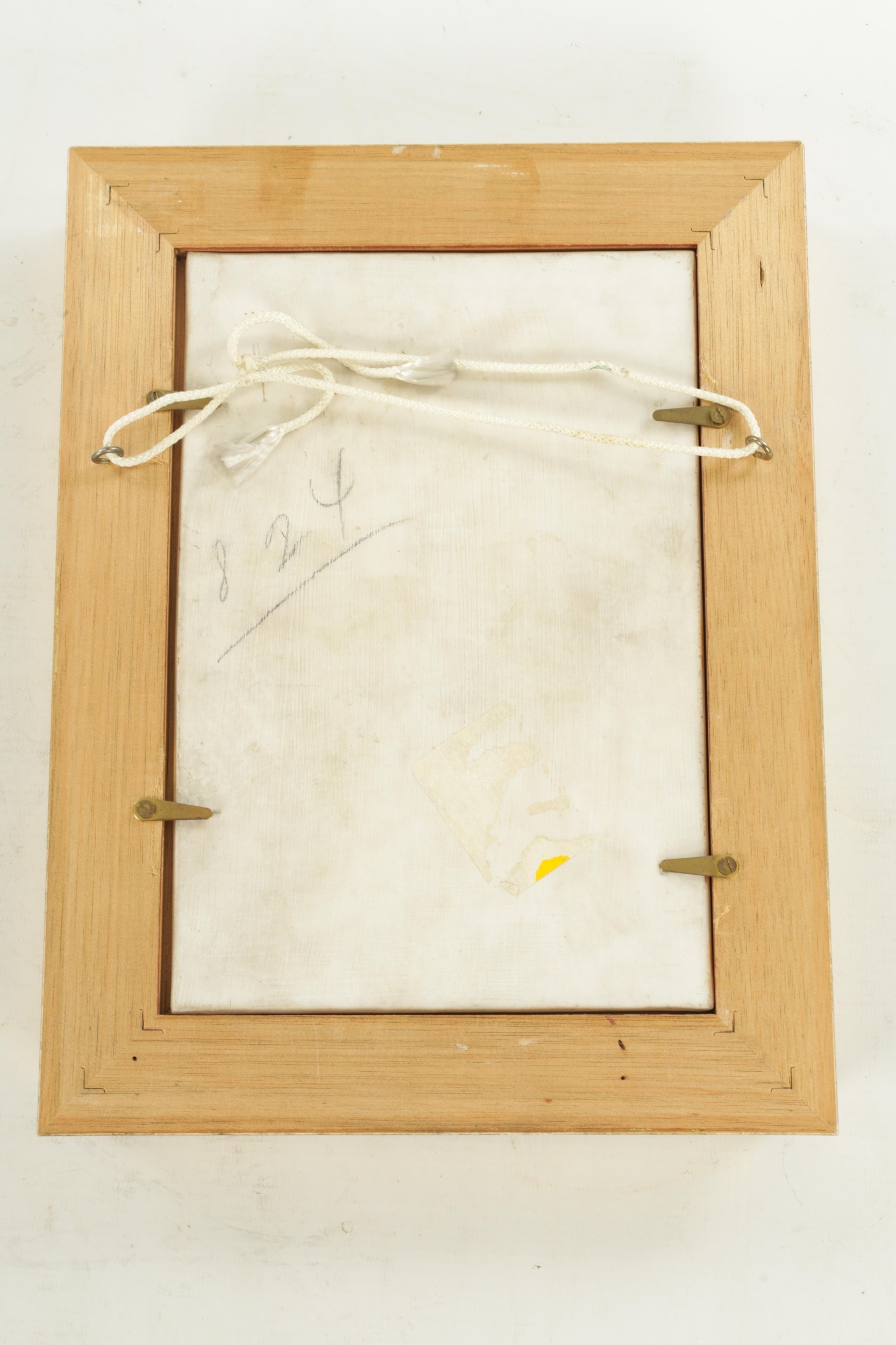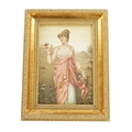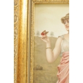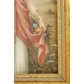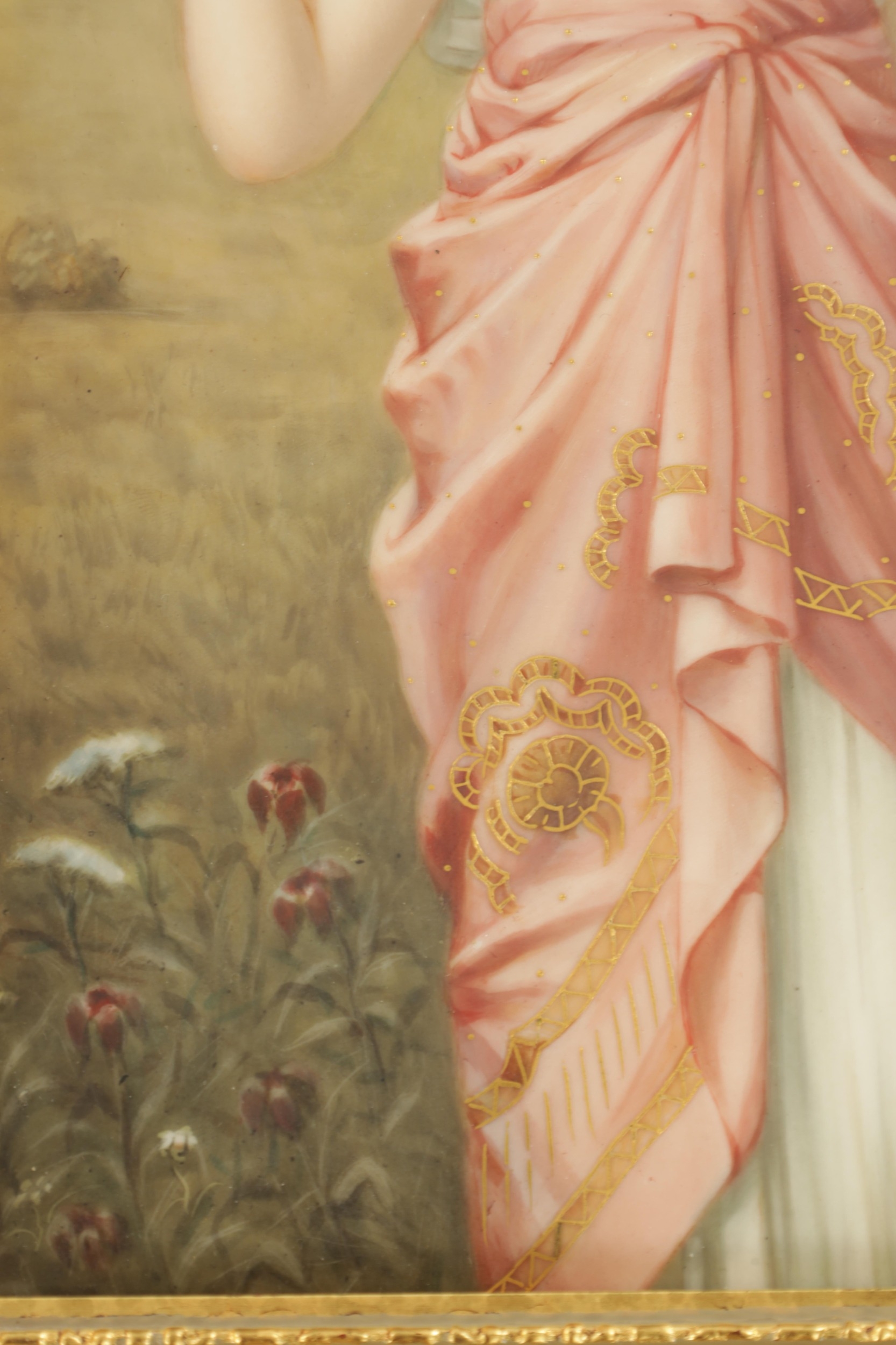 A FINE 19TH CENTURY KPM BERLIN PORCELAIN PLAQUE, full-length portrait of a young lady holding a bird in a landscape setting, impressed mark to verso - in gilt moulded frame (Plaque measures 22.5cm high, 14.5cm wide)