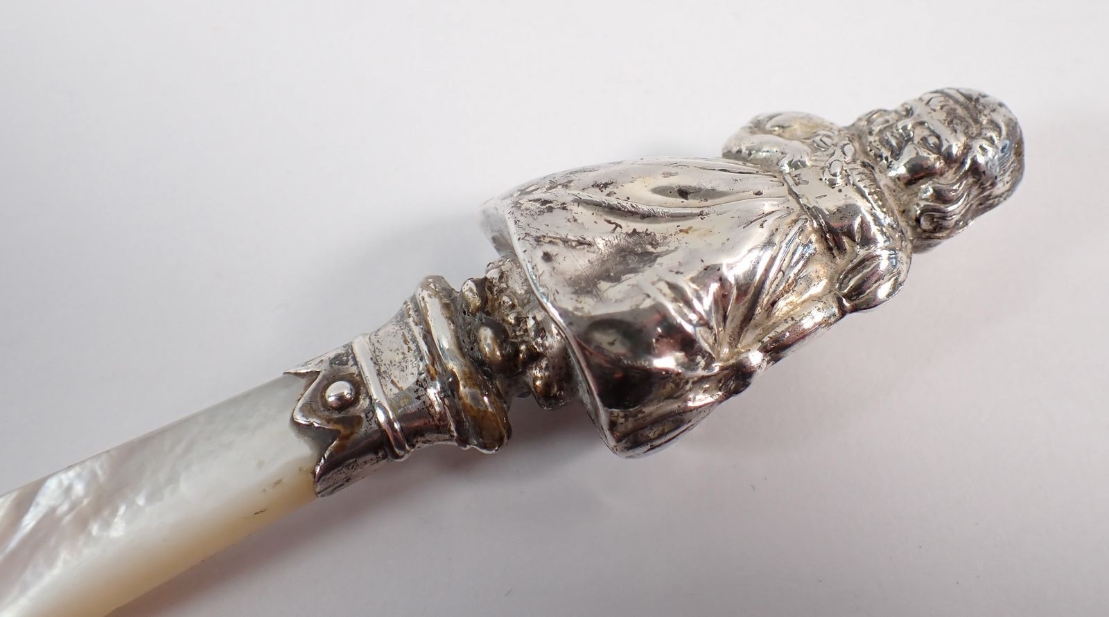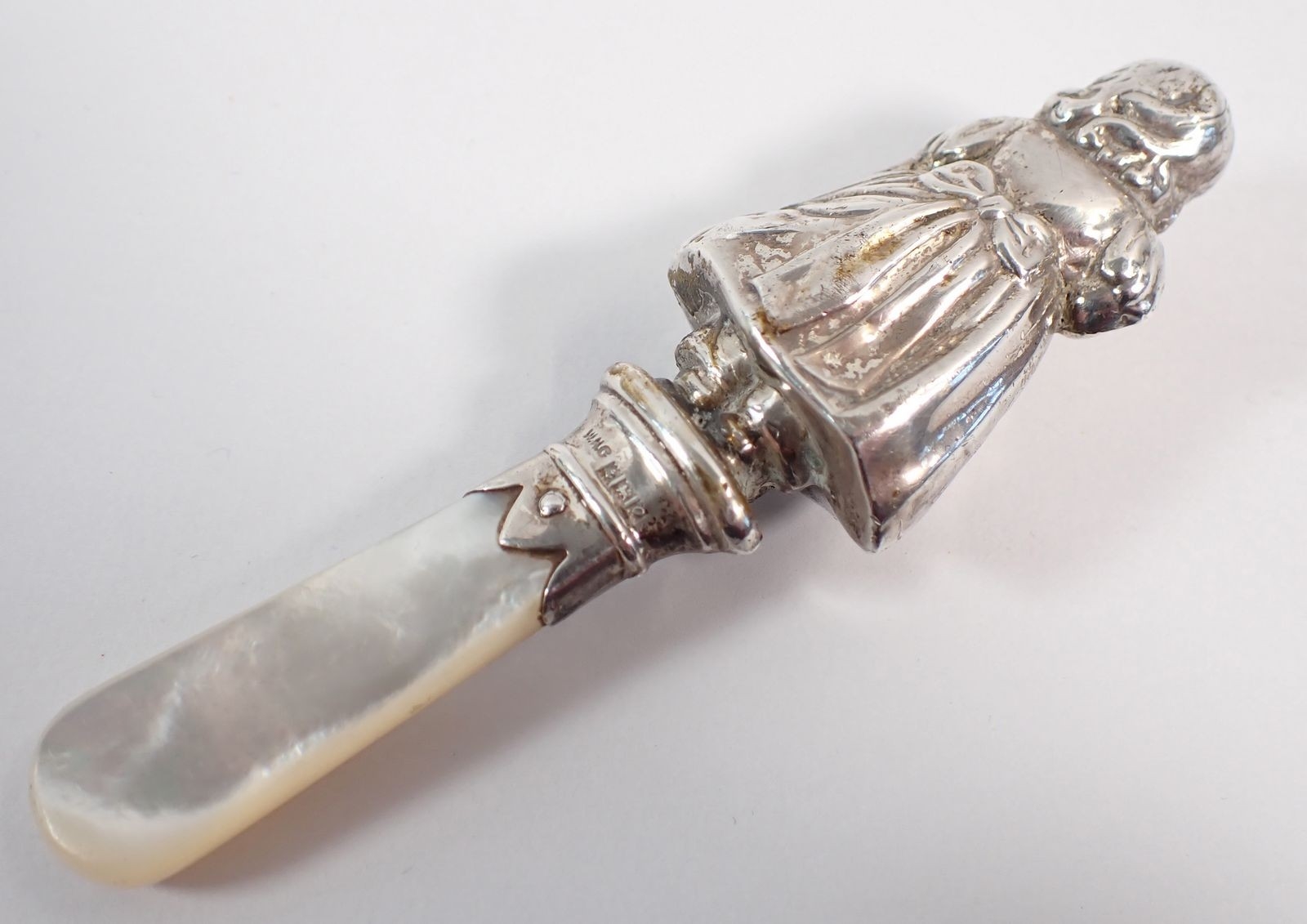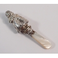 A silver teether in the form of a girl, with mother of pearl handle, 10cm long by W H Collins & Co Birmingham 1963