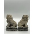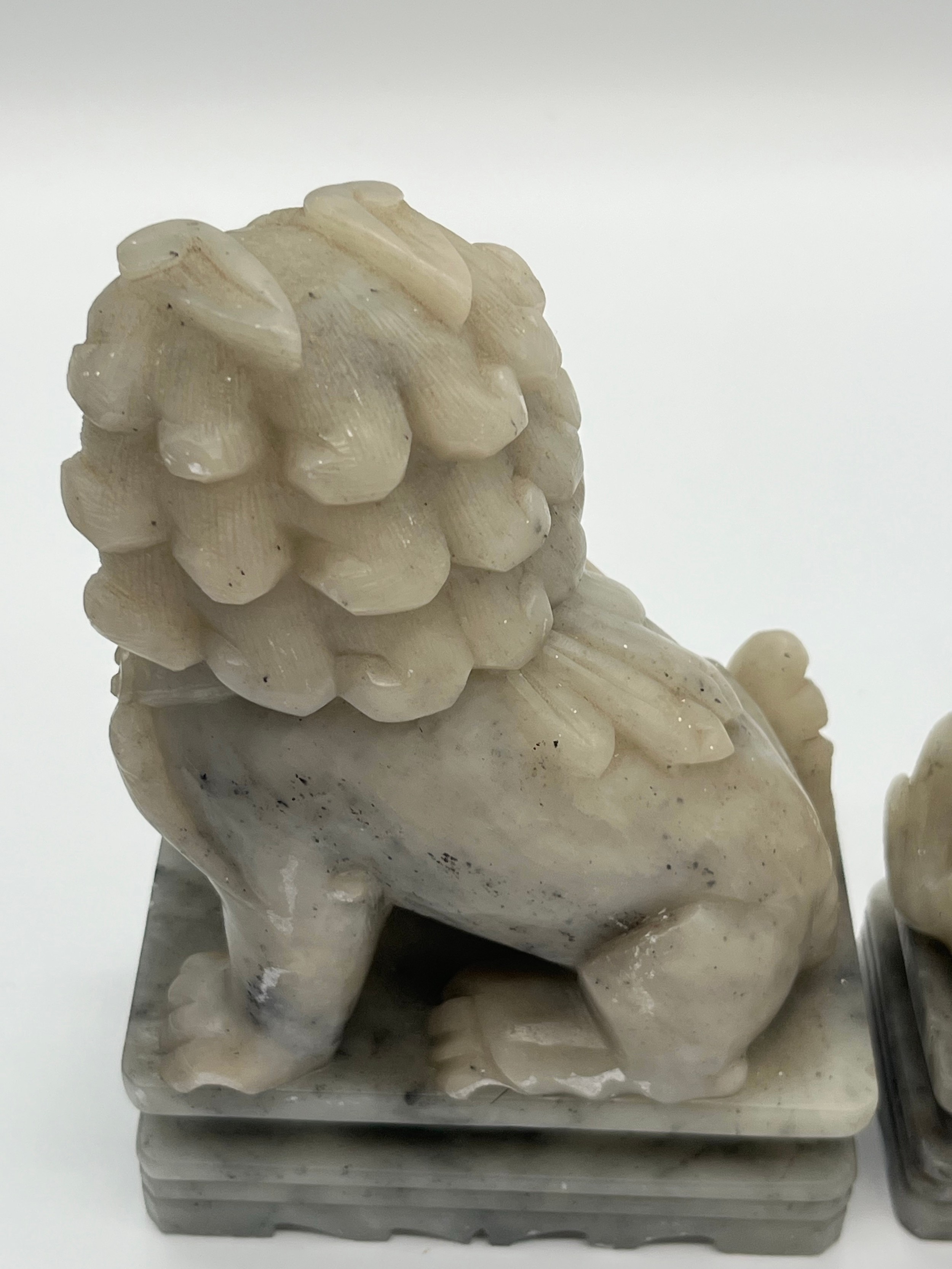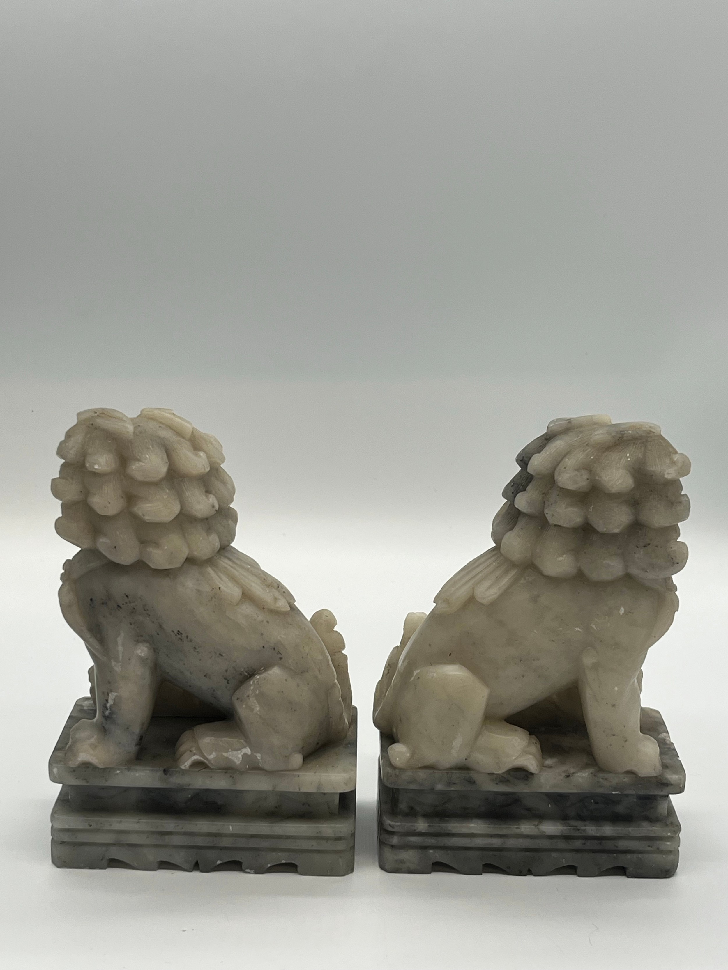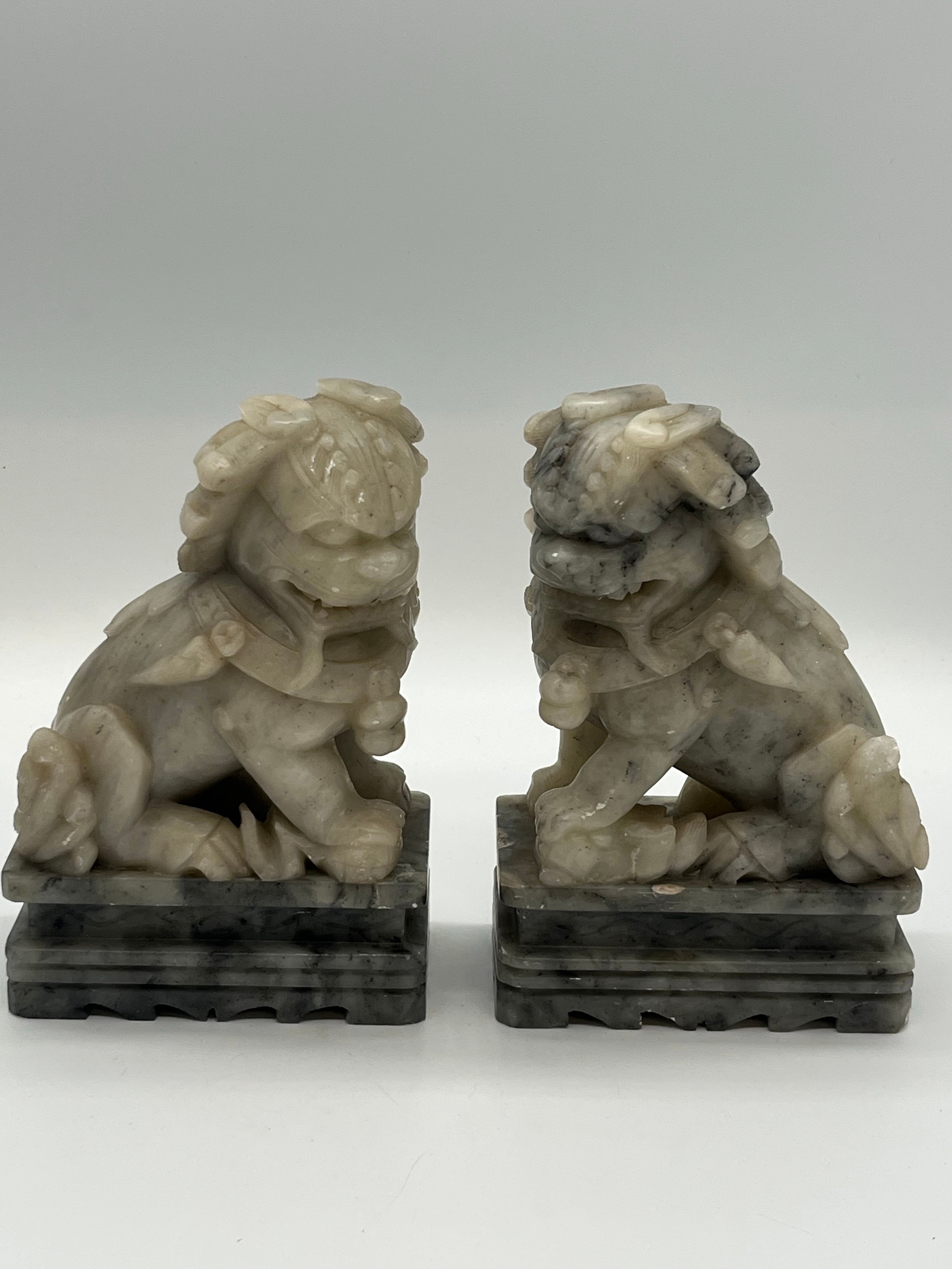 Pair of Mid Century Chinese hand carved soapstone foo dogs/guardian lion statues. 7" tall.