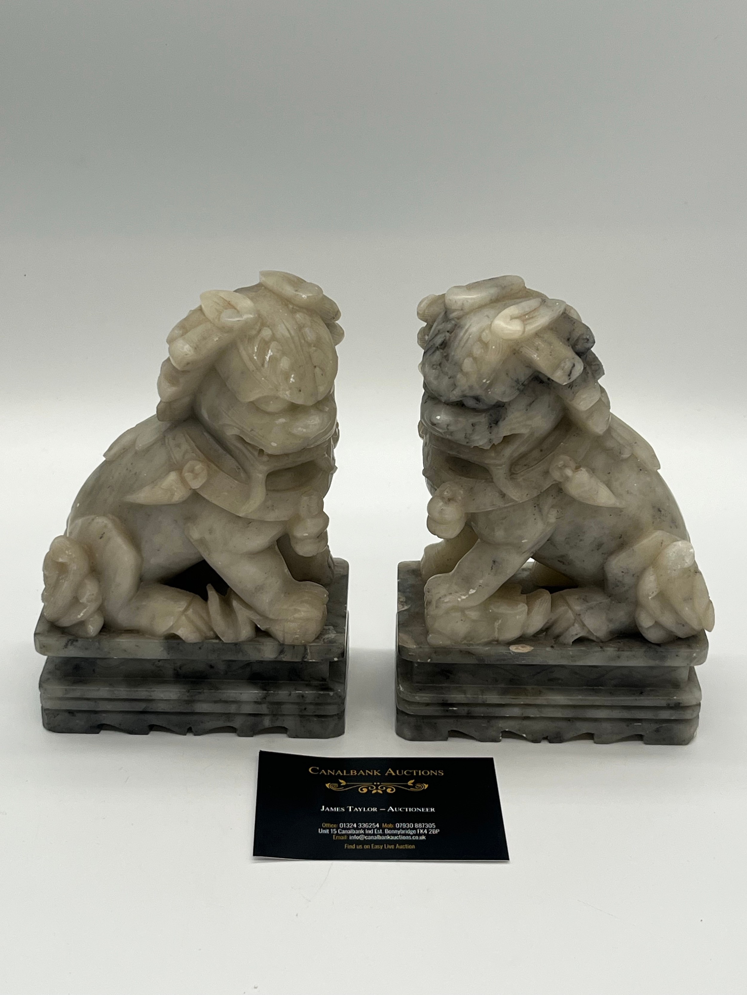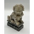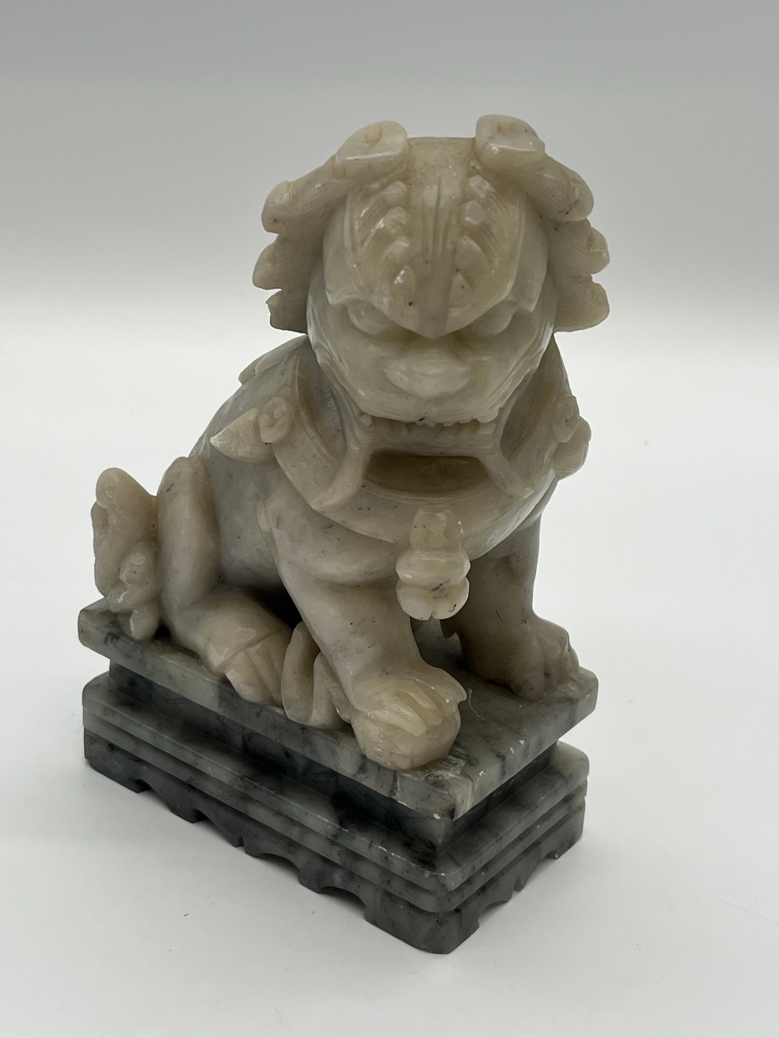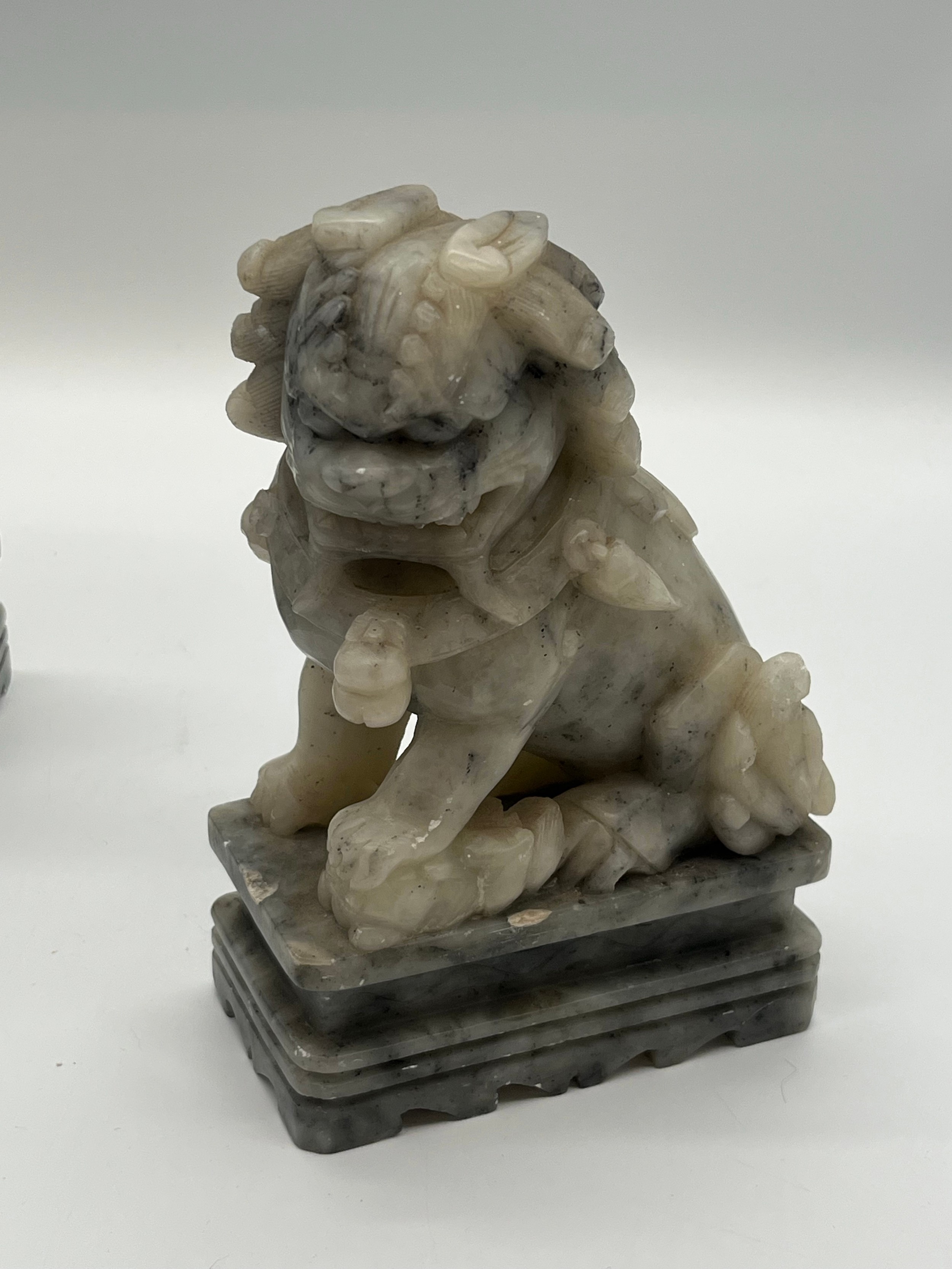 Pair of Mid Century Chinese hand carved soapstone foo dogs/guardian lion statues. 7" tall.