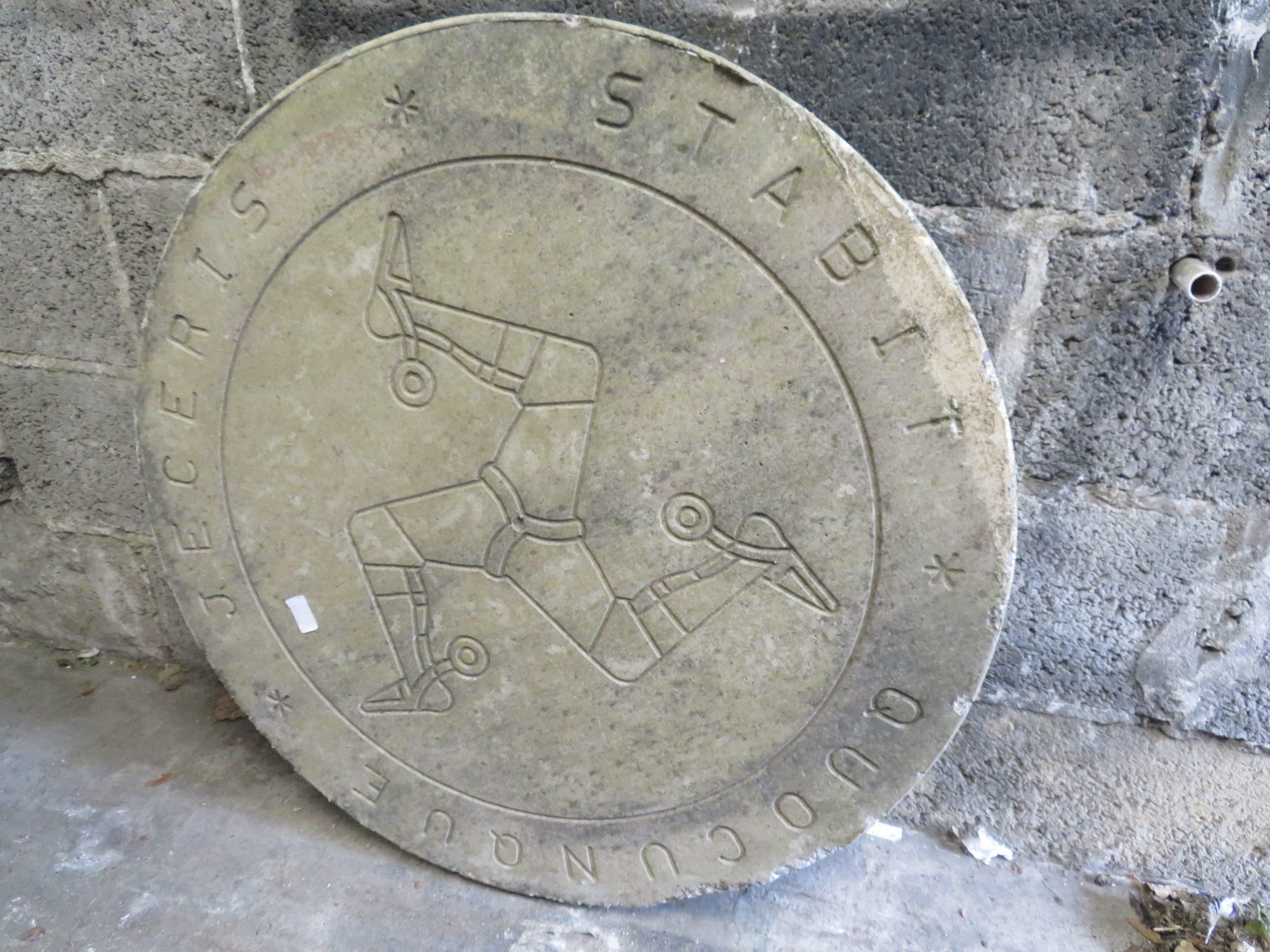 Large heavy concrete Isle of Man Triskelion plaque 'Quocunque Jeceris Stabit'