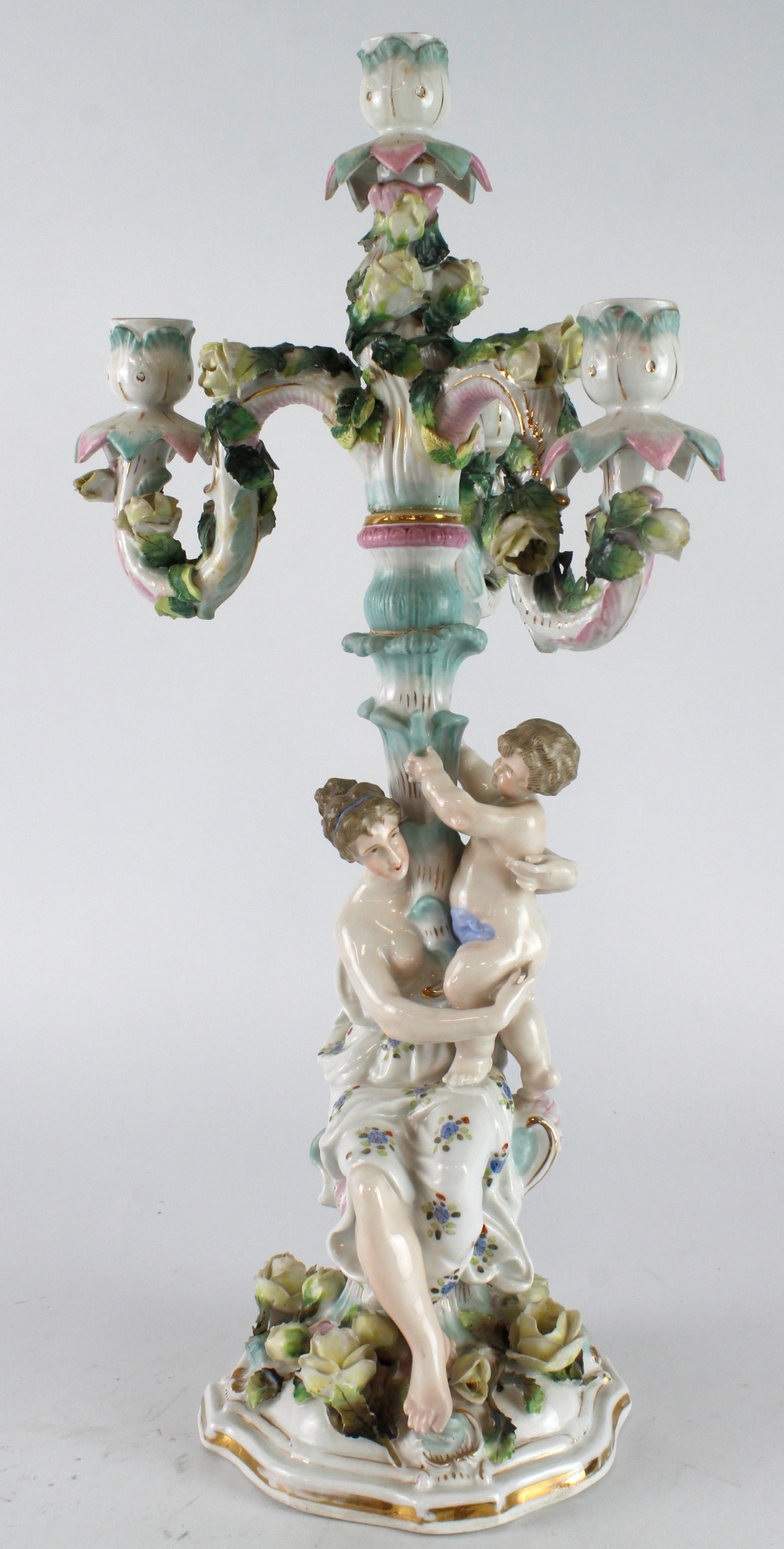 German porcelain candelabra (possibly by Dresden), with three branches, ornately decorated depicting a mother and child surrounded by flowers, makers mark to base, height 50.5cm approx.