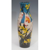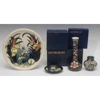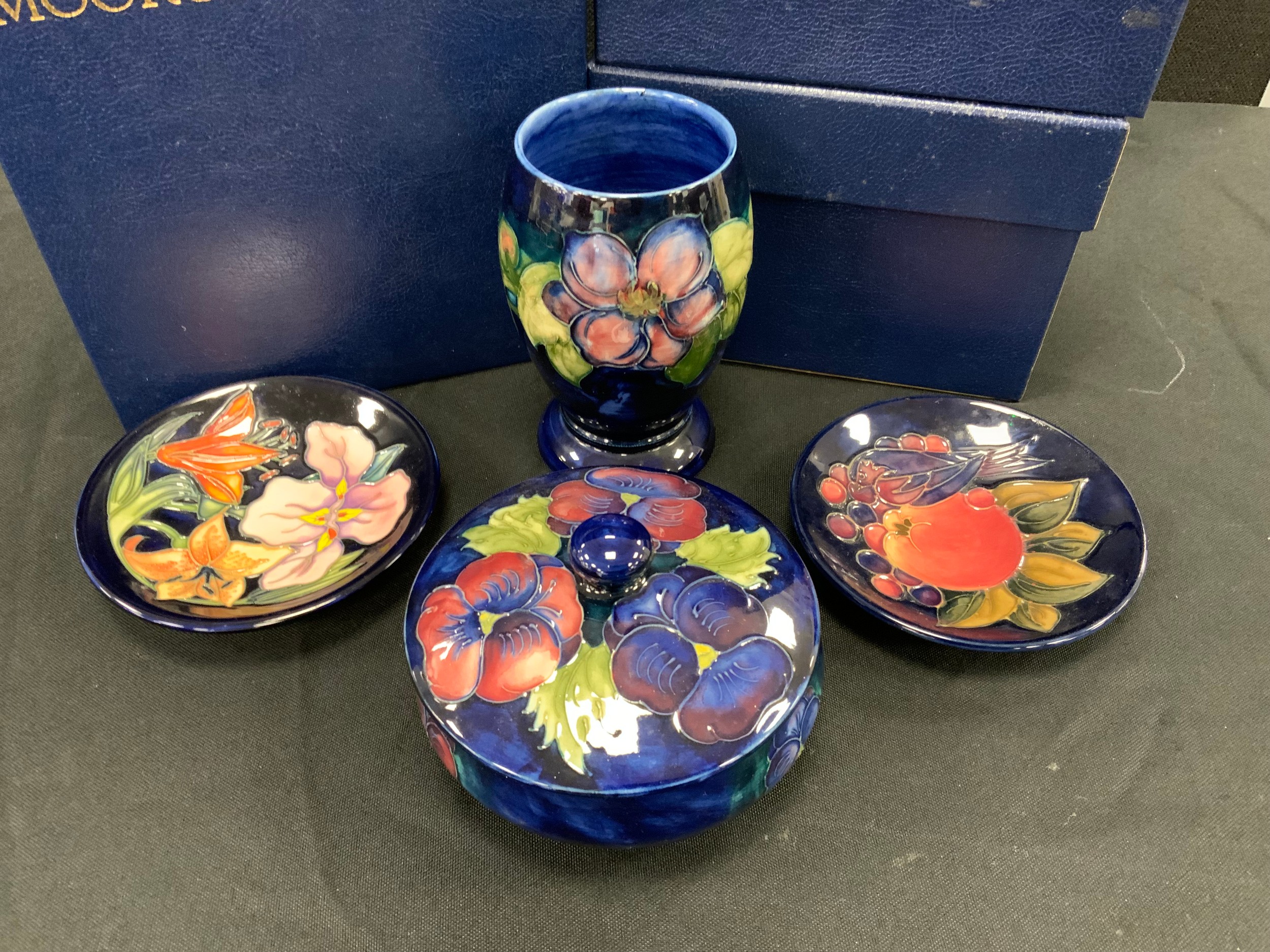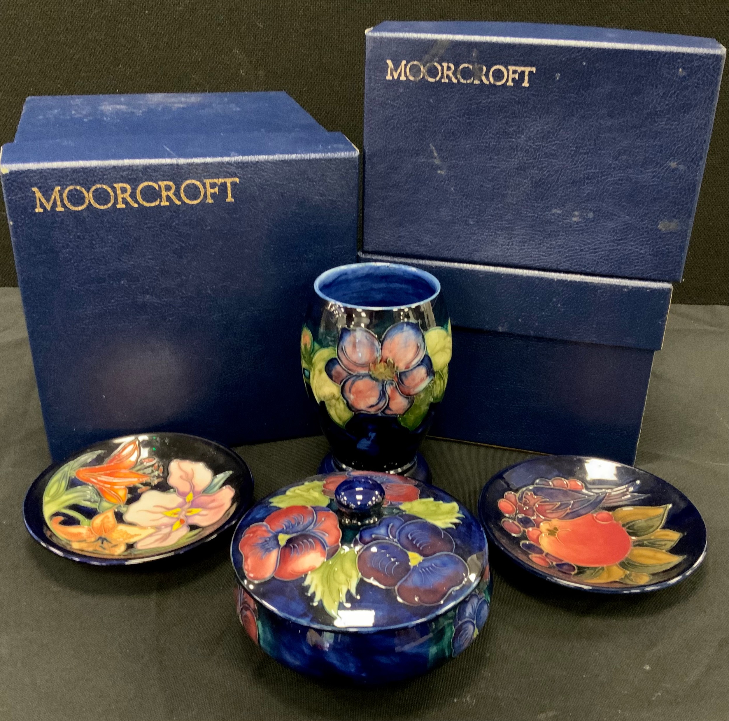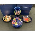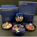 Moorcroft pansy pattern footed circular powder bowl and cover, circa 1921, impressed marks to base, Clematis pattern beaker, 13cm high, Pomegranate circular trinket dish, another, all boxed (4)