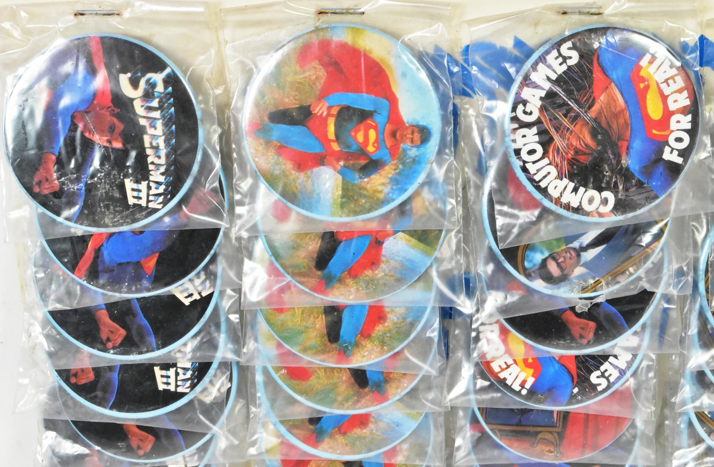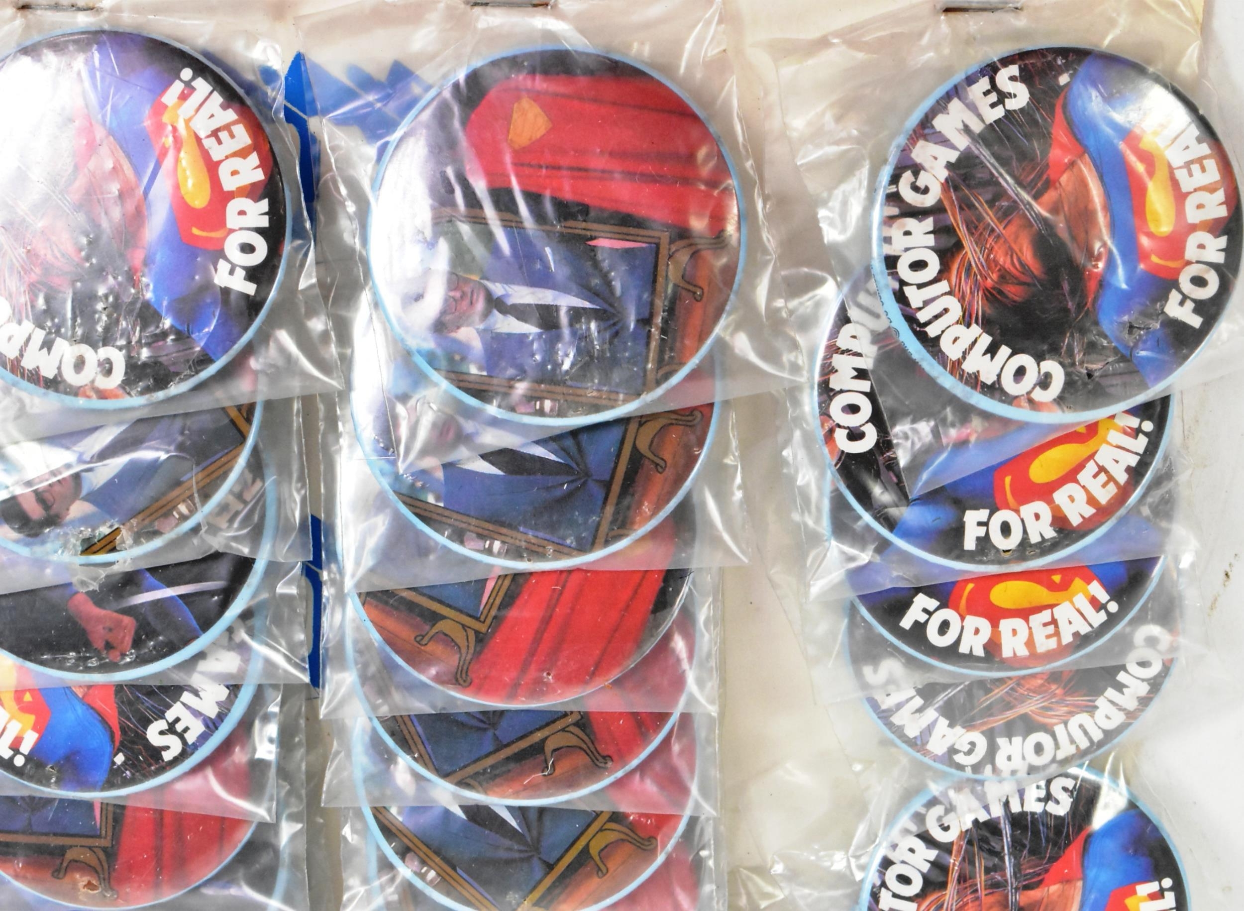 Superman III (1983) - an original vintage 1980s NOS / ex-shop-stock counter top display card featuring pin badges from the movie. Featuring five different badge styles. x2 missing, otherwise complete. Measures approx: 33cm tall.