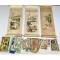 COLLECTION OF MOSTLY ORIENTAL BANK NOTES AND THREE SCROLLS