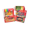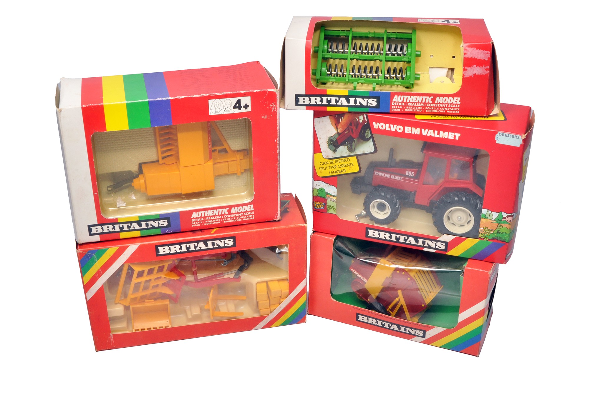A Group of Britains farm Tractor and Implements comprising Volvo BM Valmet 805 Tractor, New Holland Baler, Front Loader System, Flexicoil Packer and Round Baler. All appear without notable fault in boxes (storage wear).