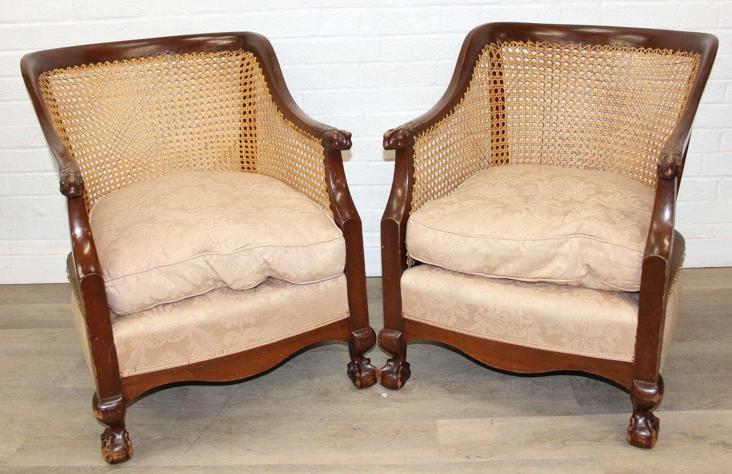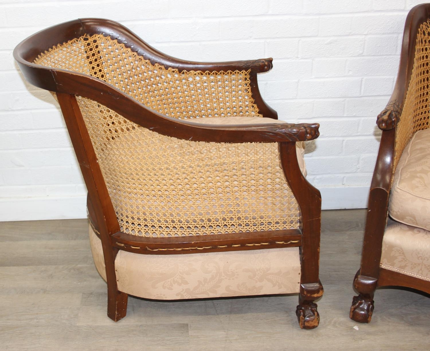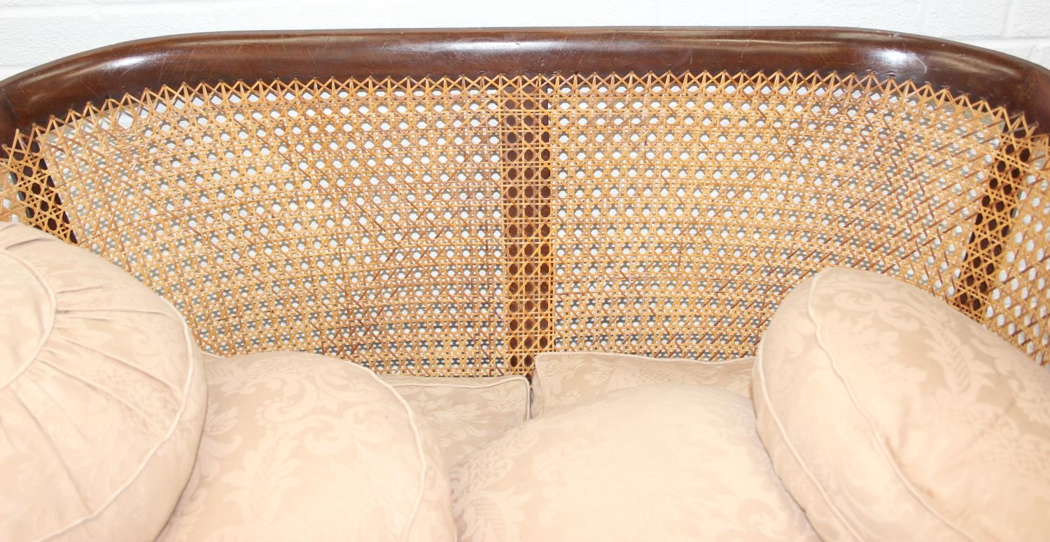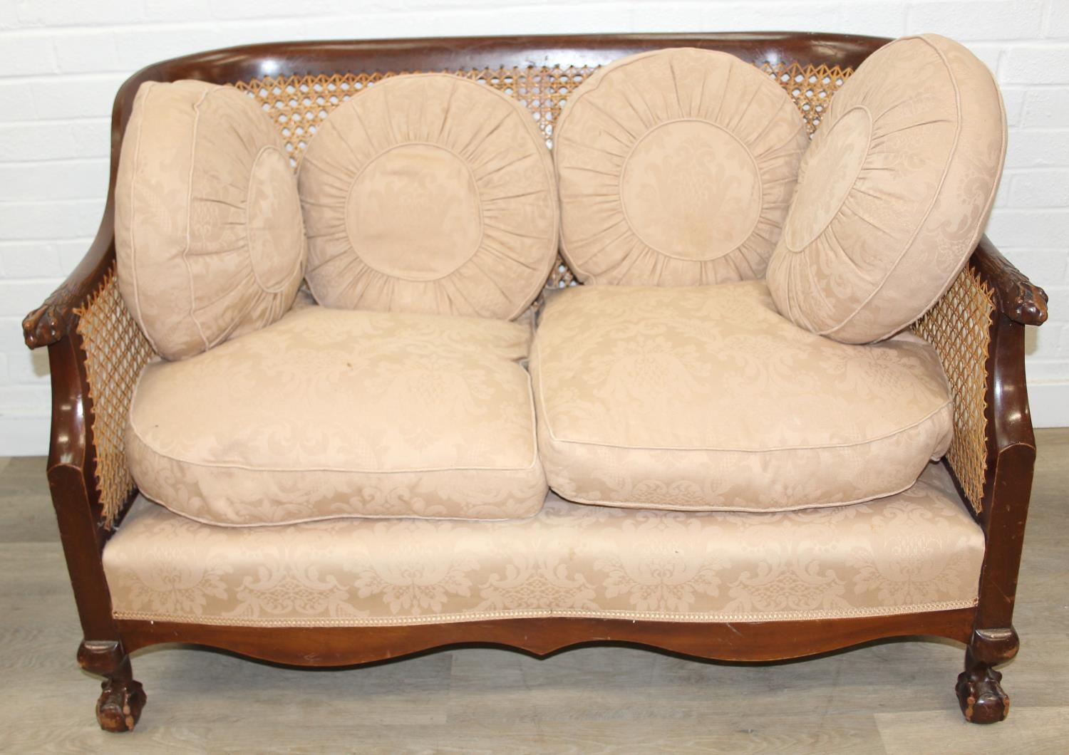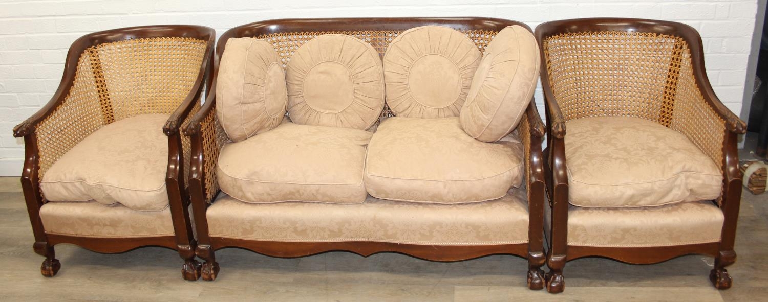 An Edwardian bergere backed three piece suite comprising of a two seater sofa and two chairs, light terracotta cushion covers, exposed mahogany frame with ball and claw feet, the sofa 126cm wide x 79cm tall [3]