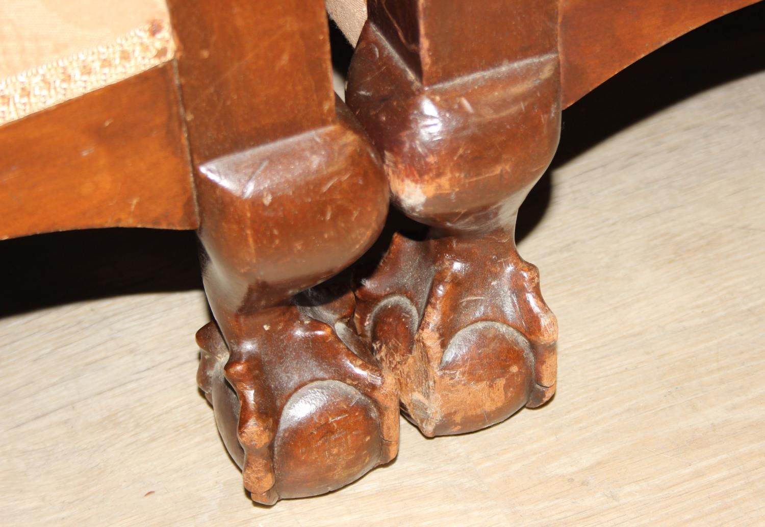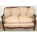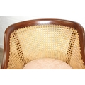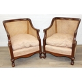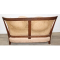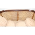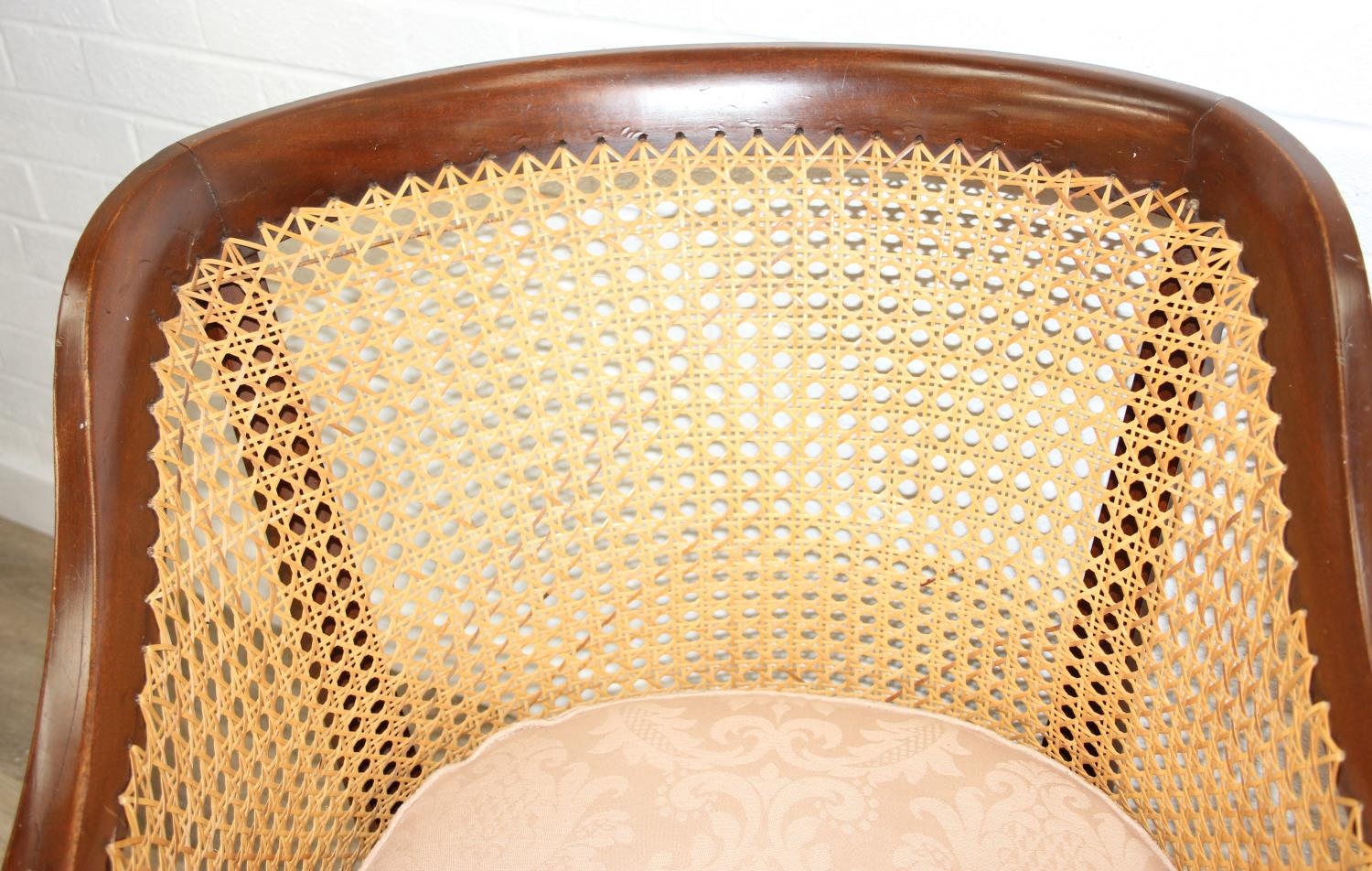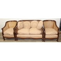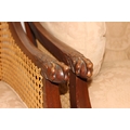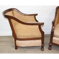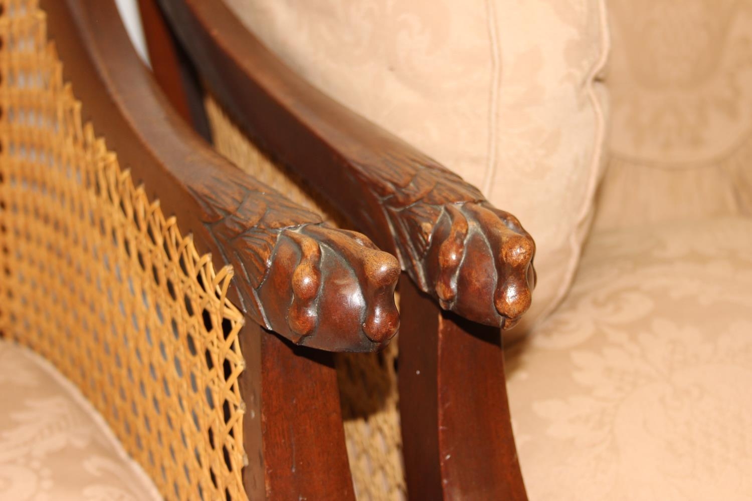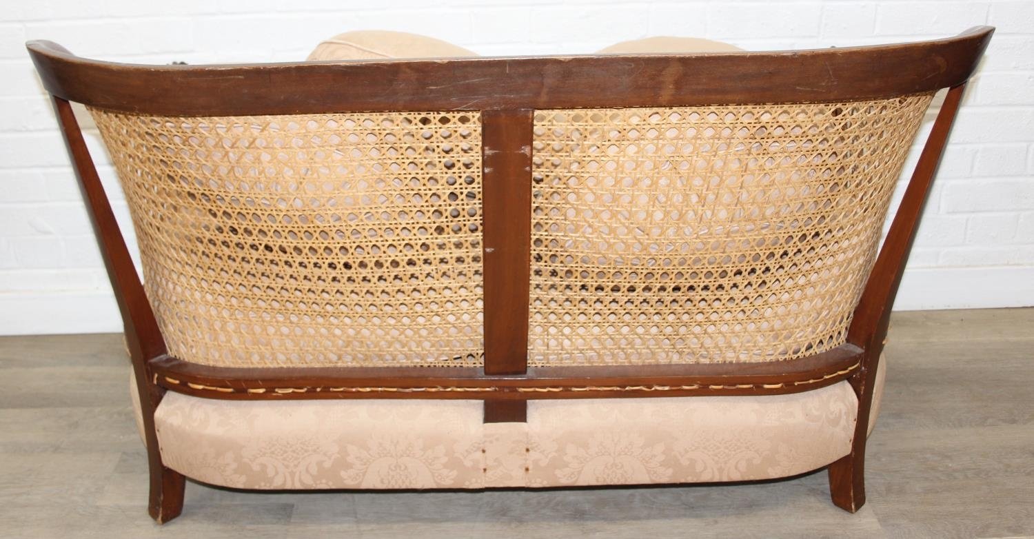 An Edwardian bergere backed three piece suite comprising of a two seater sofa and two chairs, light terracotta cushion covers, exposed mahogany frame with ball and claw feet, the sofa 126cm wide x 79cm tall [3]