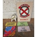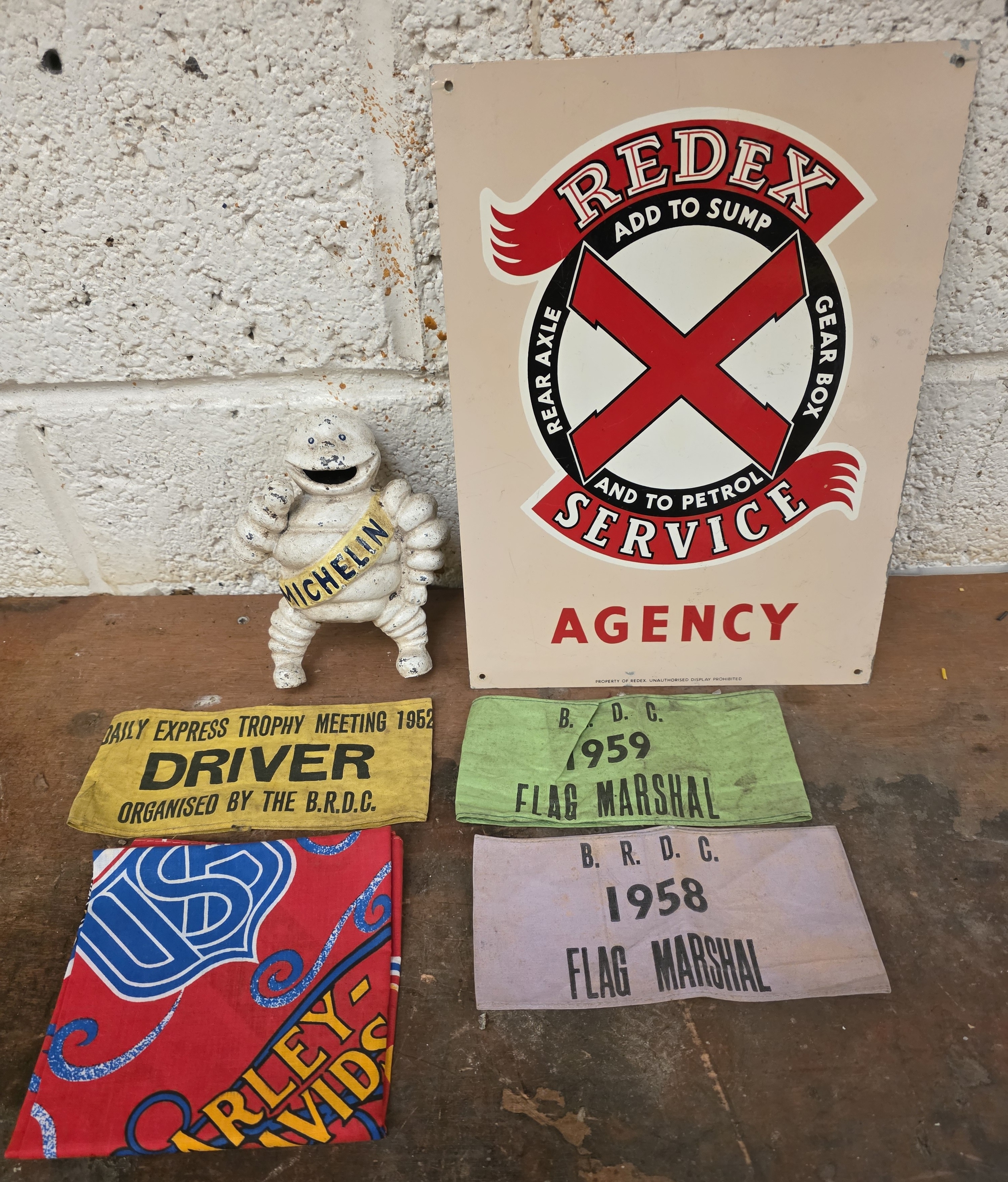 A Reddex enamel Agency sign, 30 x 23cm, a period cast iron painted Michelin man, three B.R.D.C. armbands and a Harley-Davidson scarf (6).