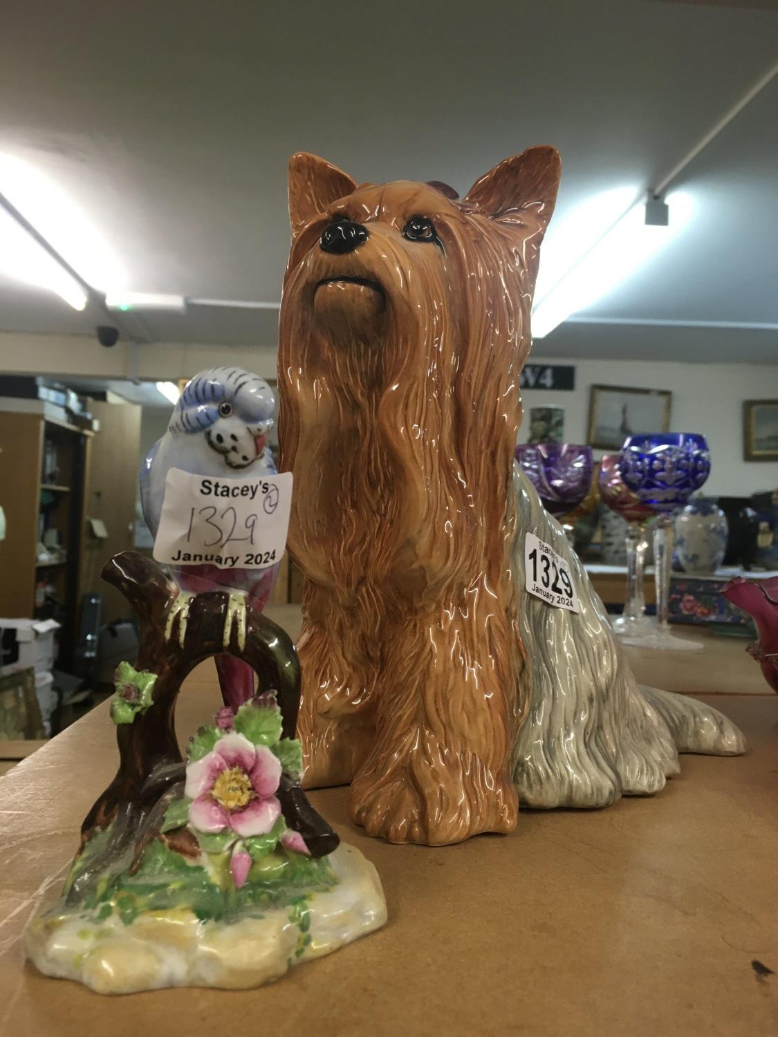A Beswick Yorkshire terrier Figure together with a porcelain figure of a budgerigar