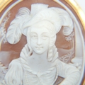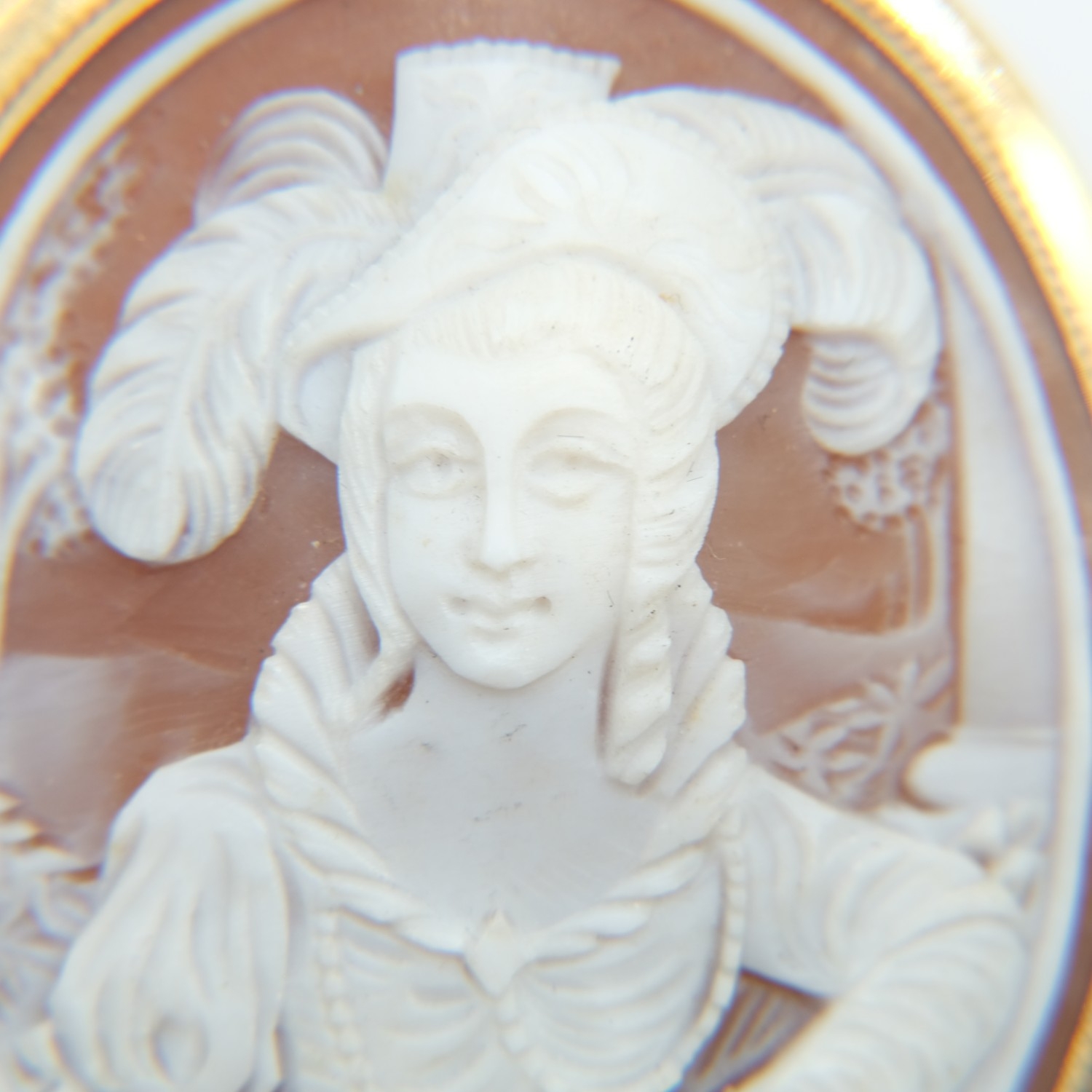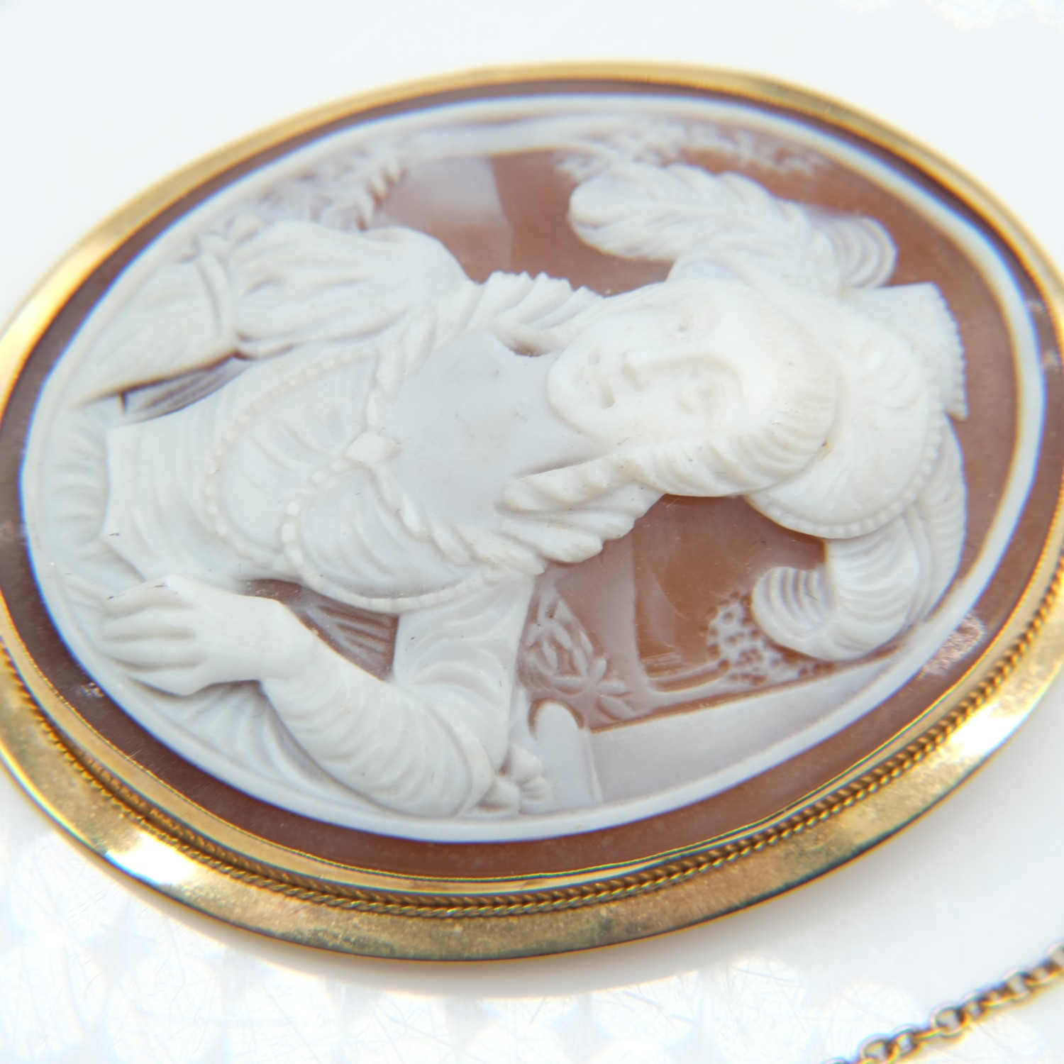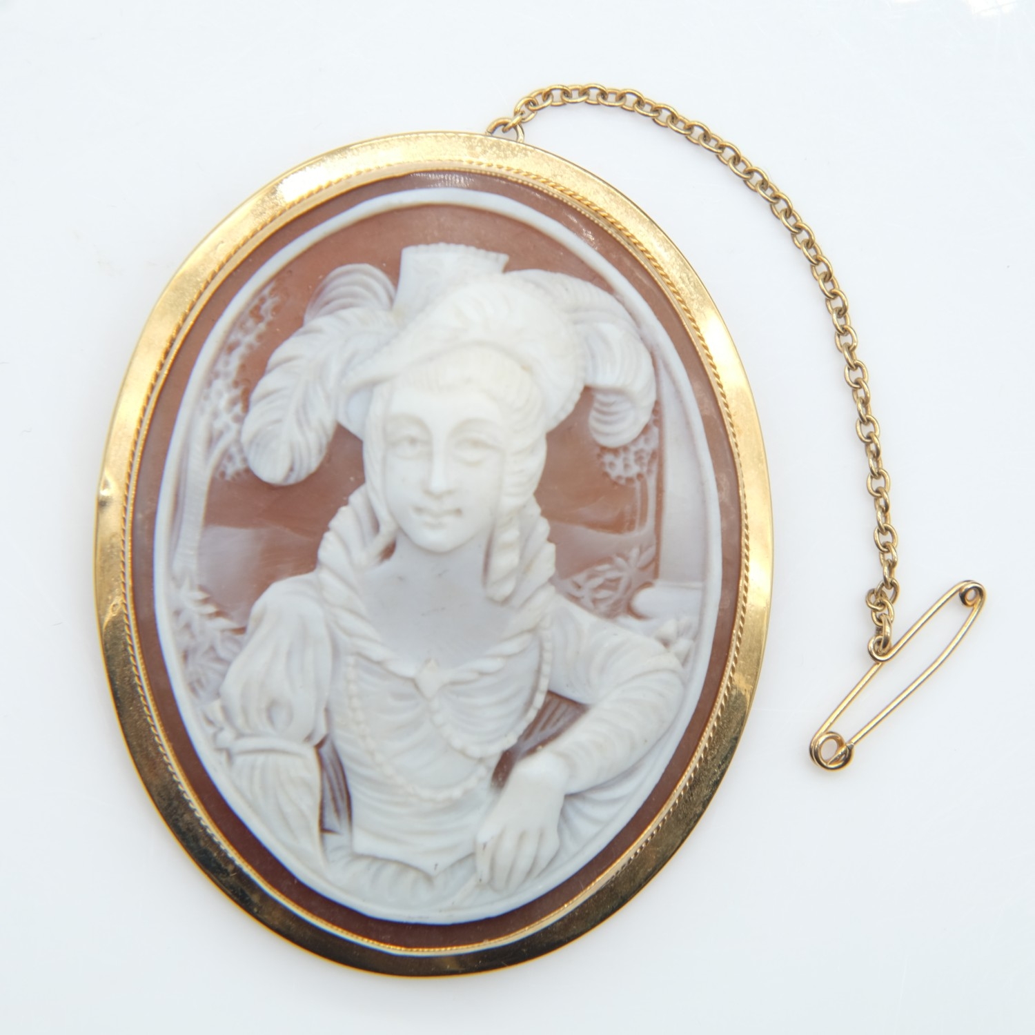 Large 9ct gold mounted cameo brooch, with safety chain, H: 60 mm, 19g. UK P&P Group 1 (£18+VAT for the first lot and £2+VAT for subsequent lots)
