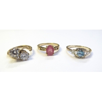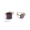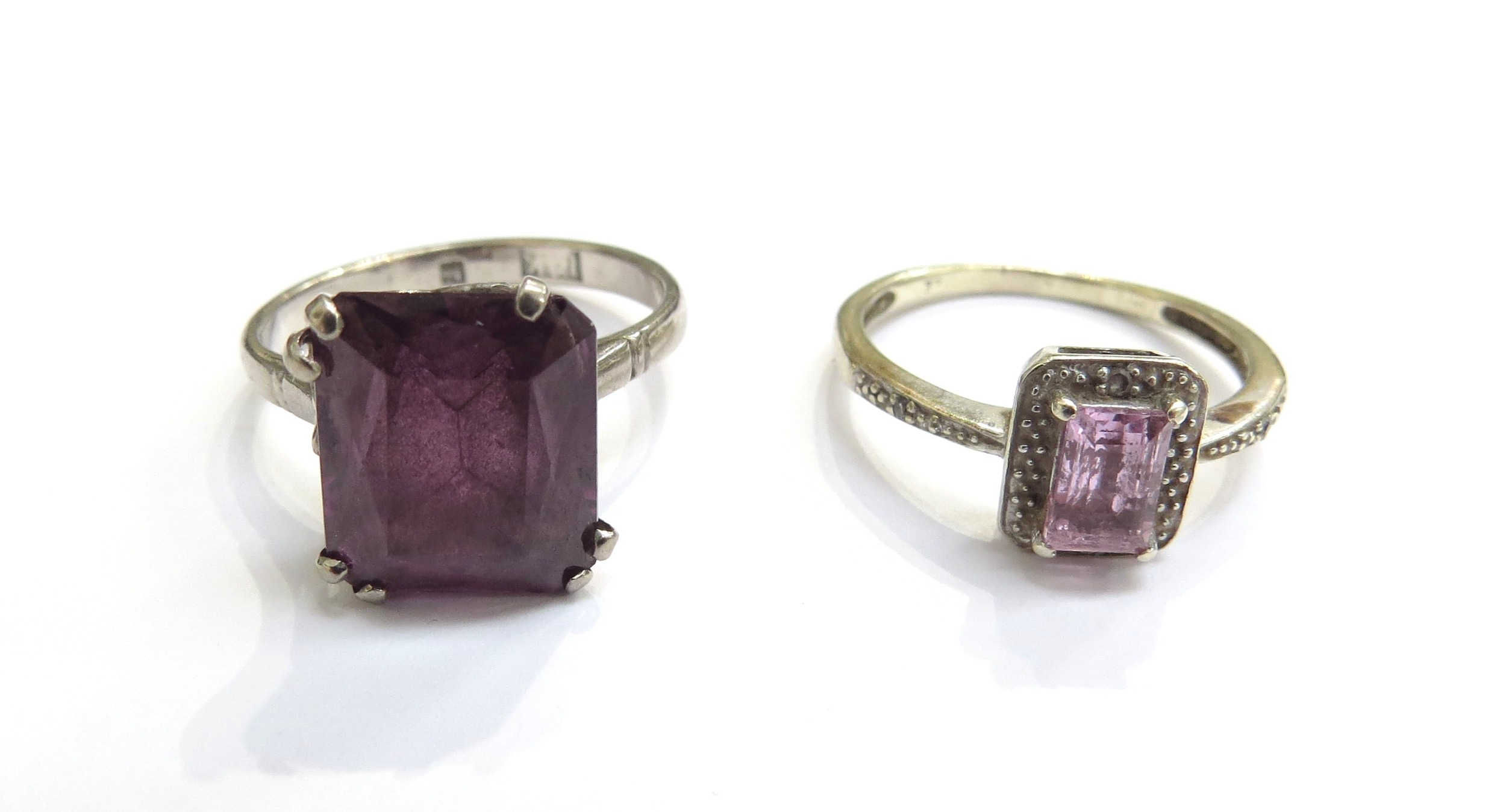 A white gold ring stamped 14k with a dark pink stone, size M and a 9ct white gold ring with pink stone, size M/N, 5.6g total (2)