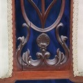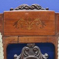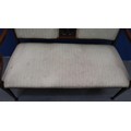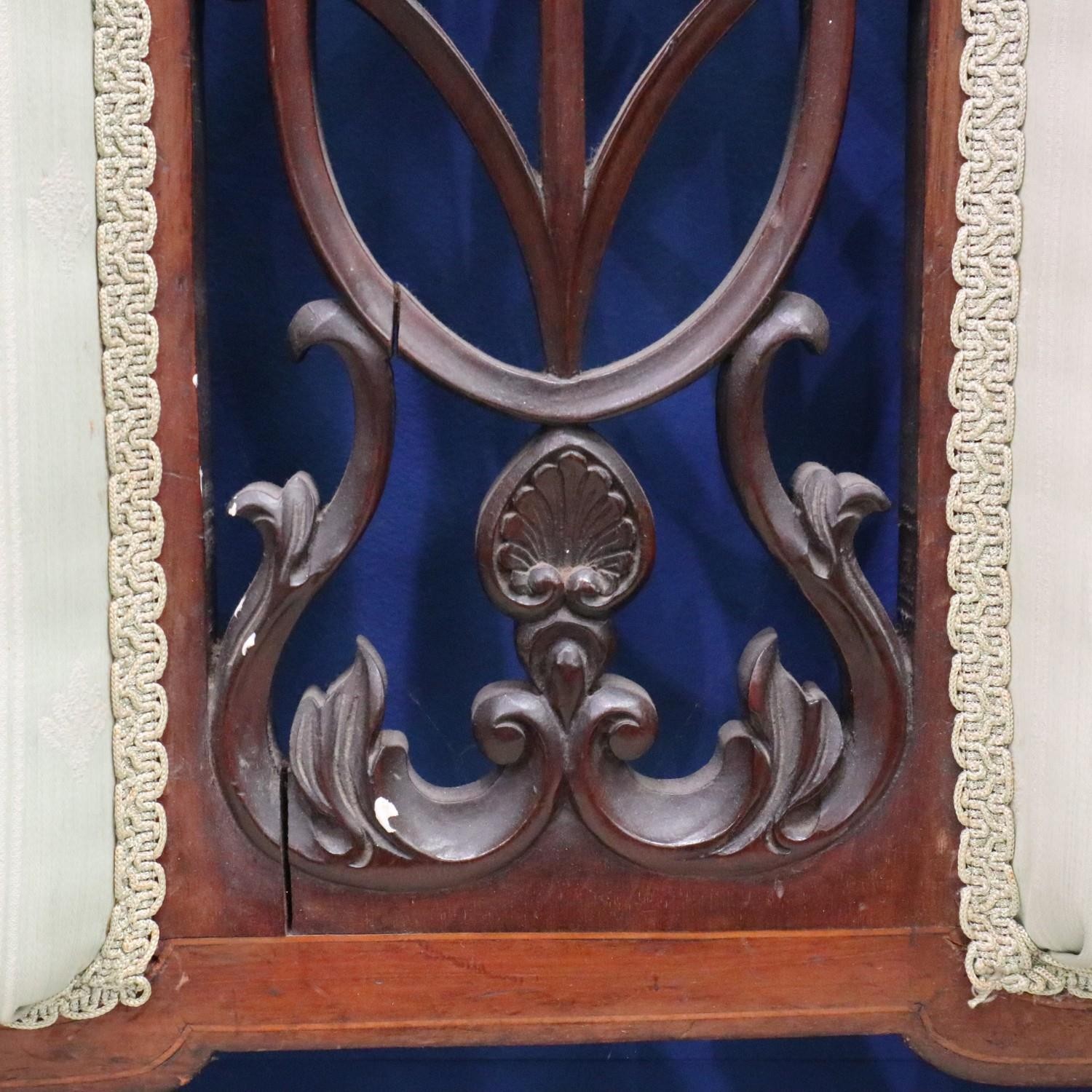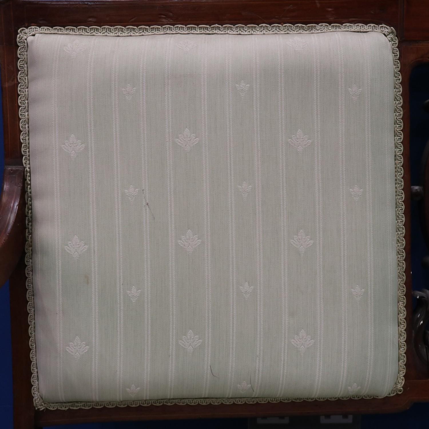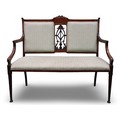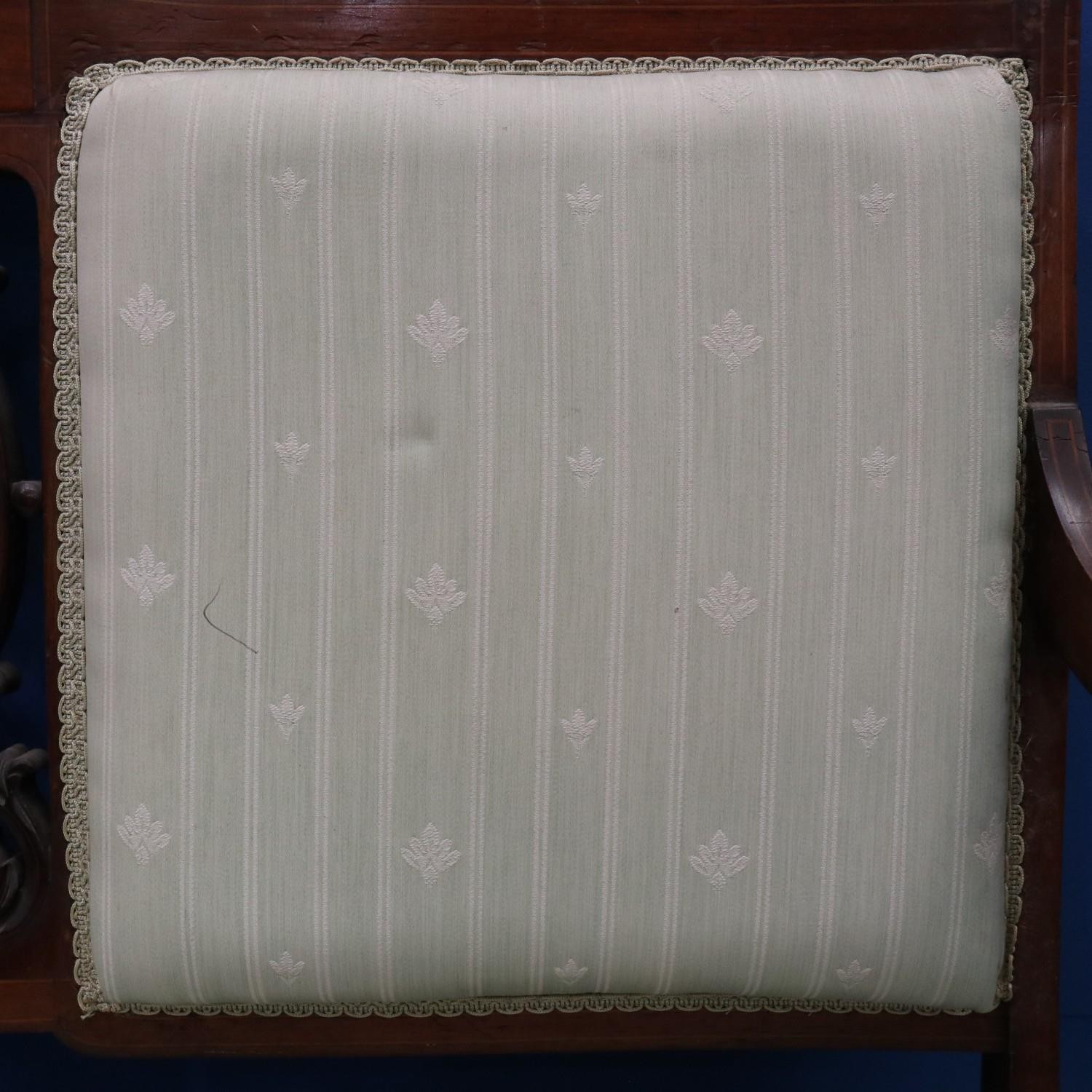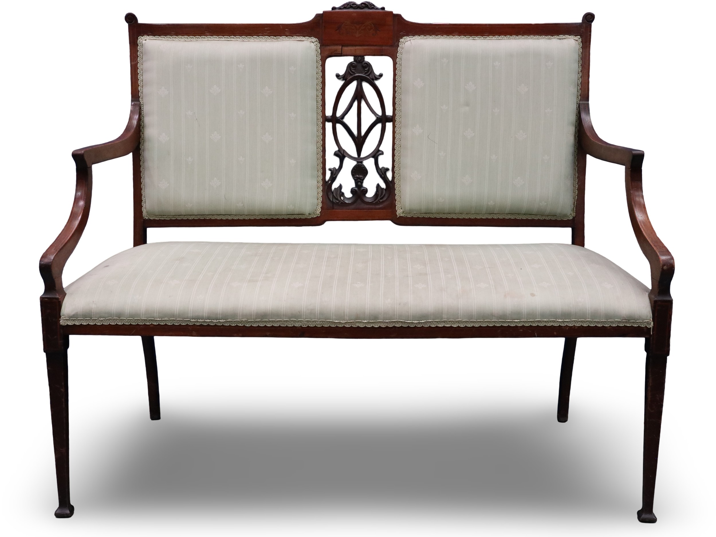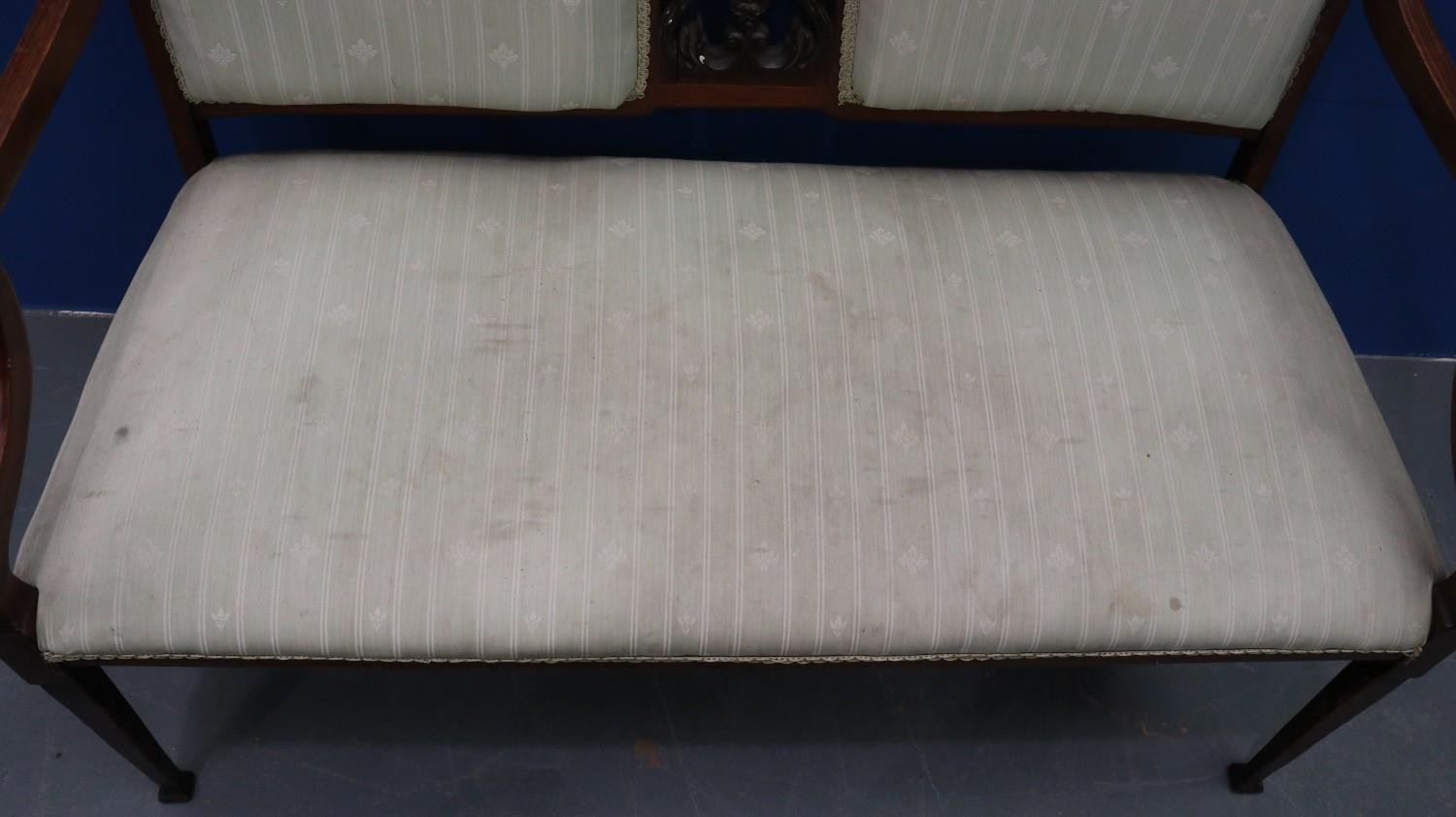 An Edwardian two-seat settee, inlaid walnut frame with upholstered and carved backrest, raised on tapering supports. Not available for in-house P&P