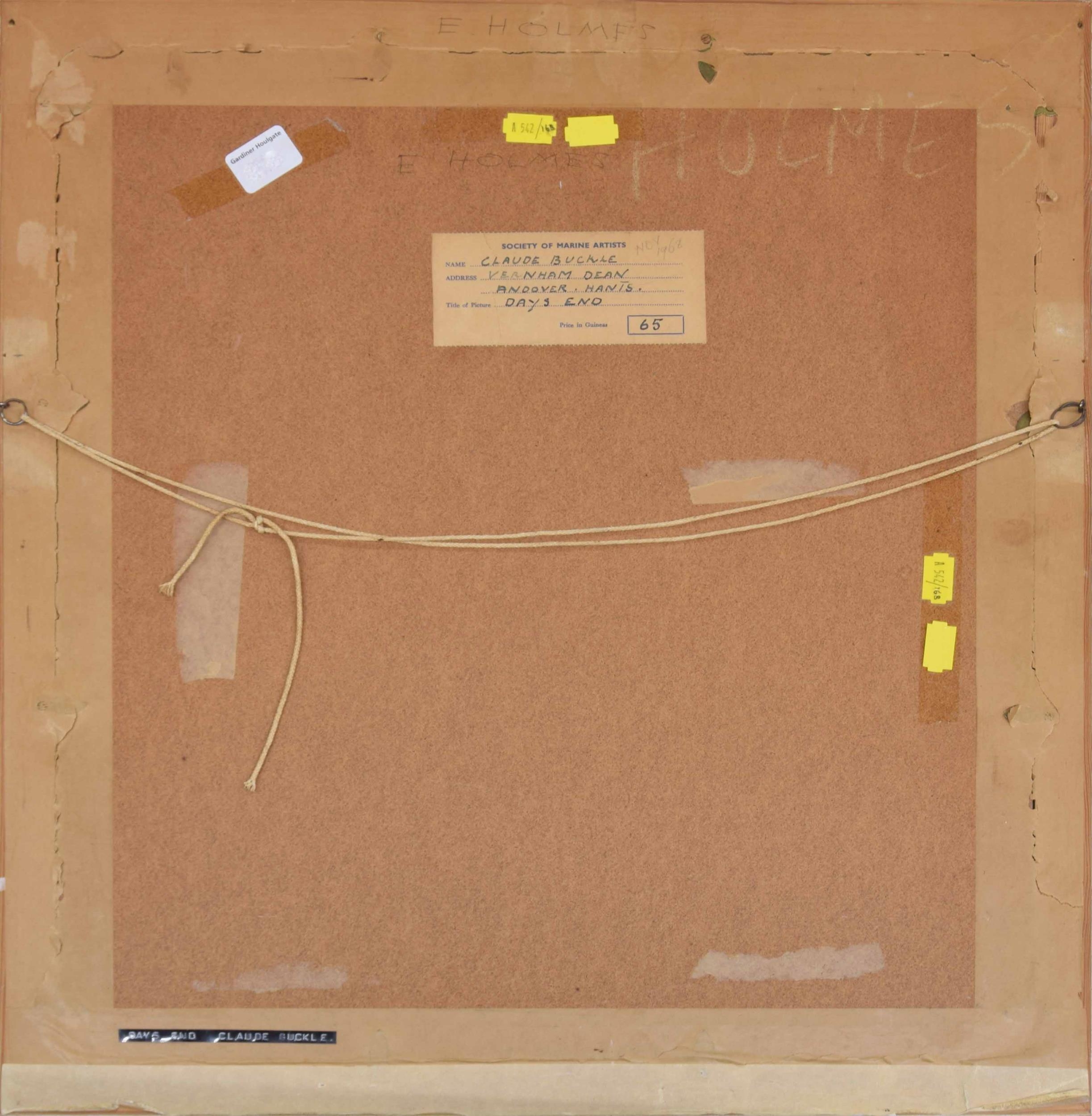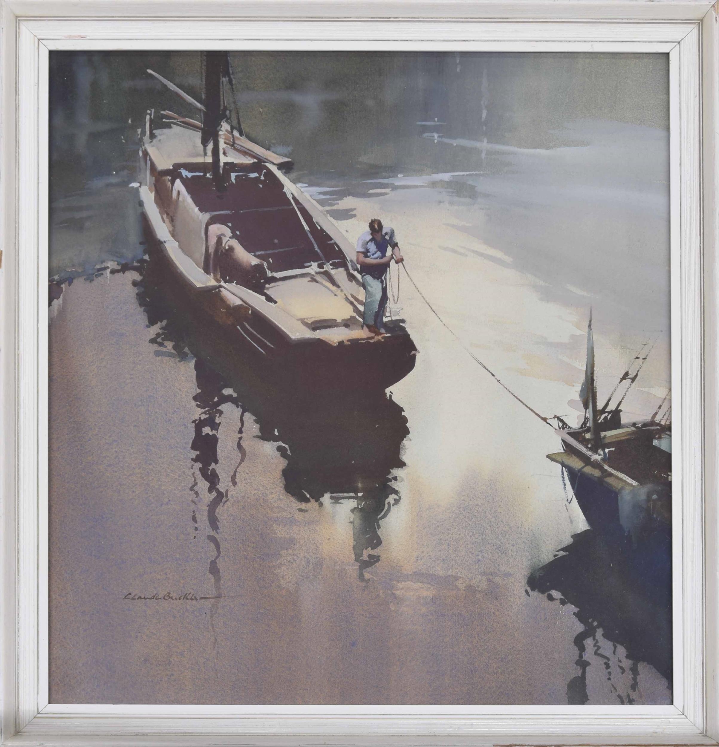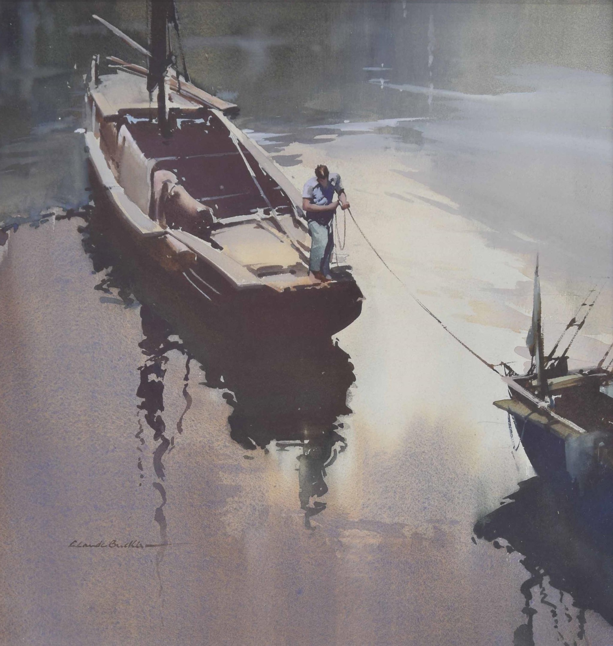 Claude Henry Buckle RI RSMA (1905-1973) - "Days End" gentleman tying up his boat, signed also inscribed with the title and the artist address on exhibition label verso, pencil and watercolour, 19" x 17.5"