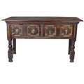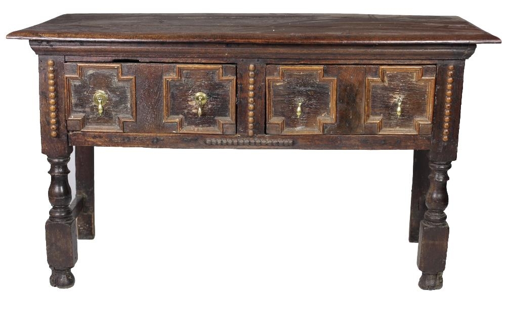 An 18th Century Jacobean style oak Side Table, the plain top over two frieze drawers decorated with geometric panels with brass drop handles, on turned front feet, approx. 137cms w x 53cms d x 81cms h (54" x 21" x 32"). (1)