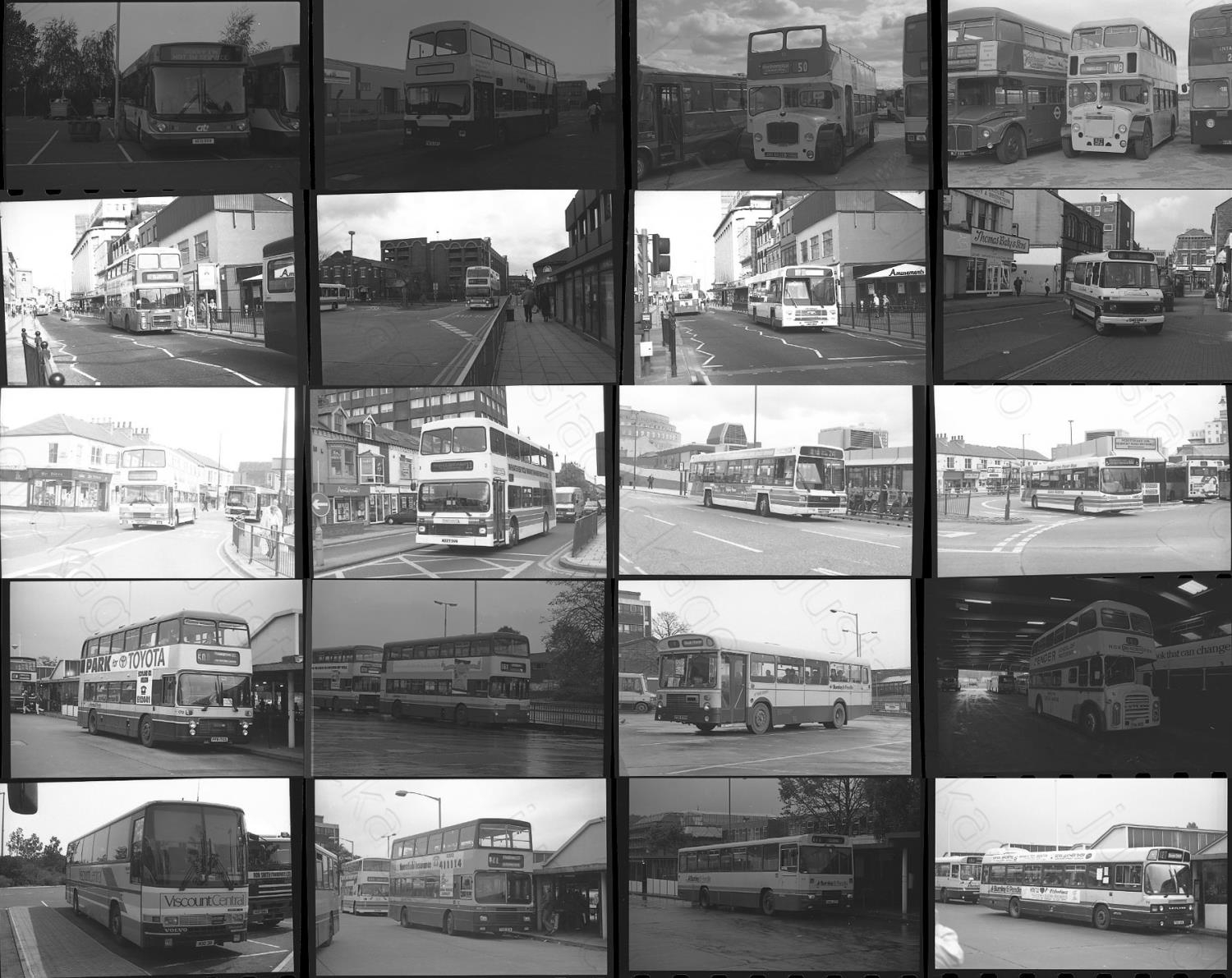 U.K. Bus selection. Approx. 100, individual, 35mm black and white and a few colour negatives. The selection features operators mainly in Burnley and Middlesbrough. including: Crossville-PMT, Stagecoach Cambus, Cumberland, Cleveland Transit, Burnley Colne & Nelson, Hatton St Helens and Burnley & Pendle . Locations include: Chester Bus Station, Carlisle, Middlesbrough, Burnley Bus Station etc. Most are from the 1990's. All captioned. Sold with copyright, sample illustrated.