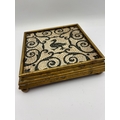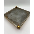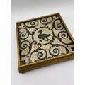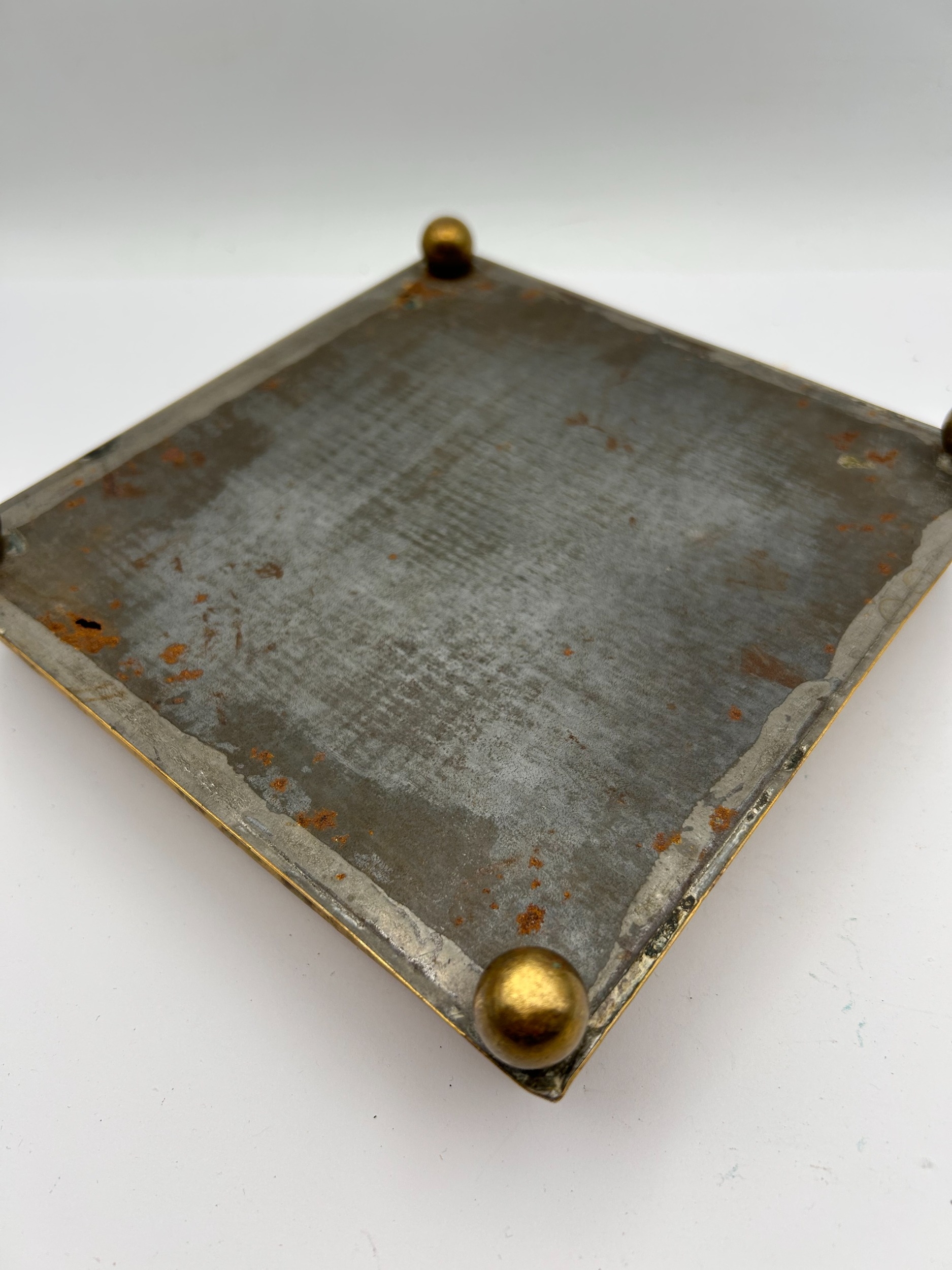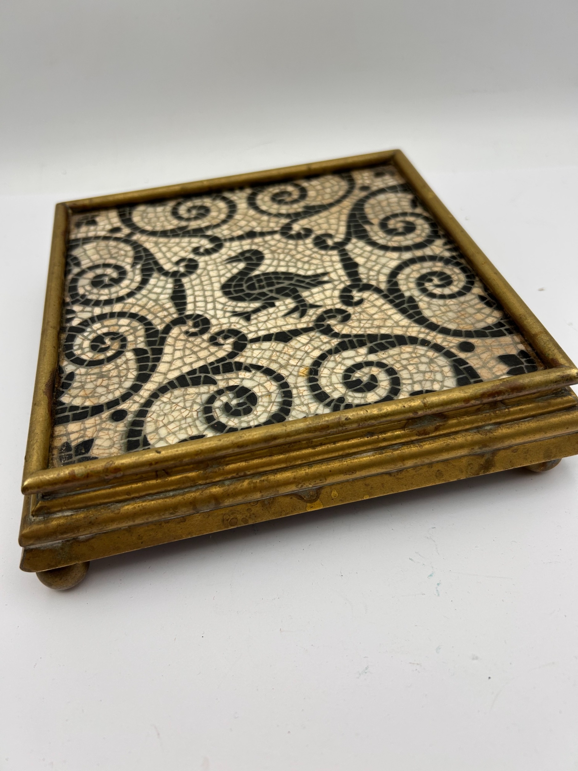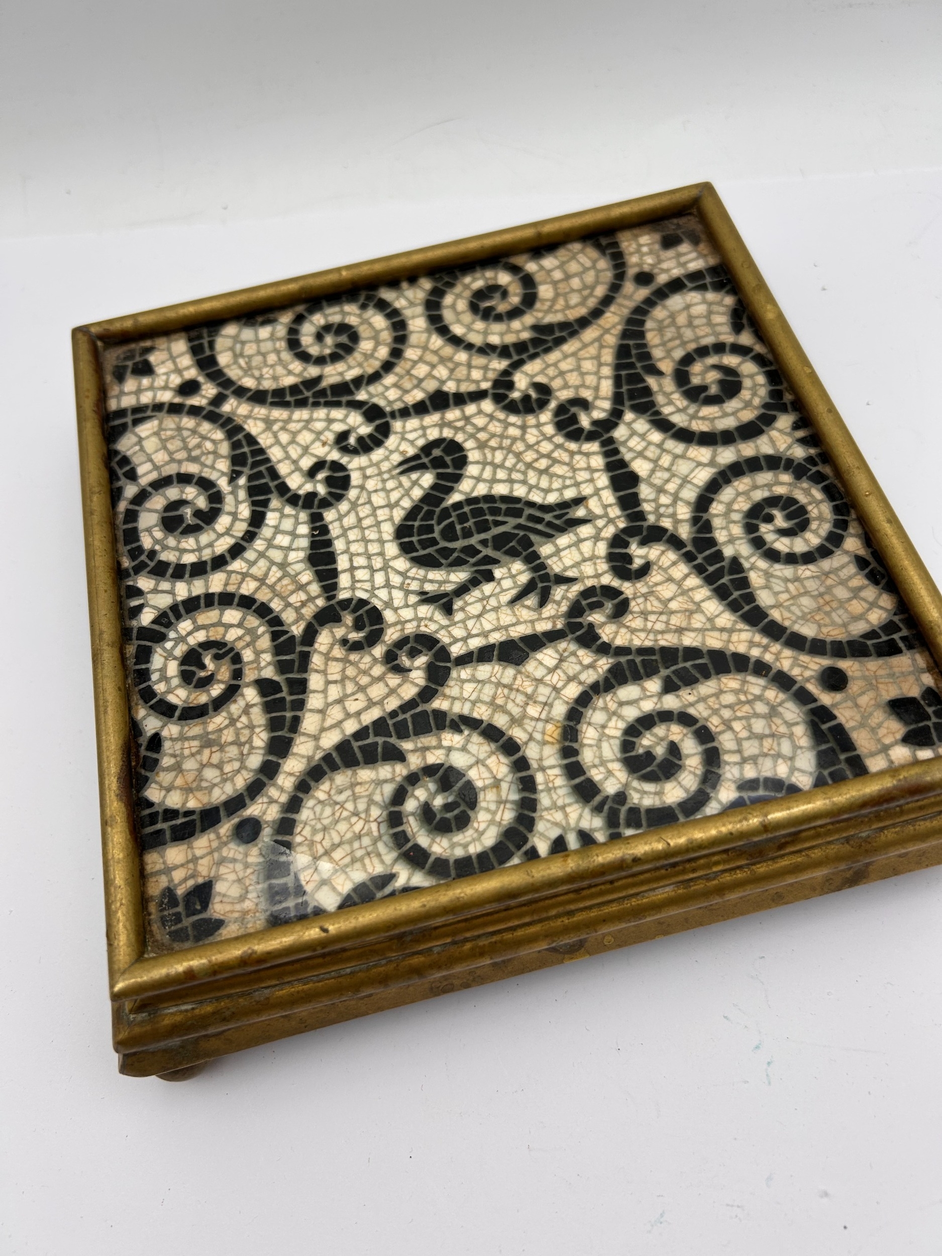 A single decorative stand or trivet featuring a central micro-mosaic panel. The mosaic utilizes small black, cream, and beige tesserae to form a design of scrolling volutes surrounding a central silhouette of a bird, consistent with a Classical Revival or Grand Tour aesthetic. The mosaic panel is set within a stepped, square frame constructed of gilt base metal. The stand is elevated by four small, spherical metal feet. No legible text or maker's marks are visible.