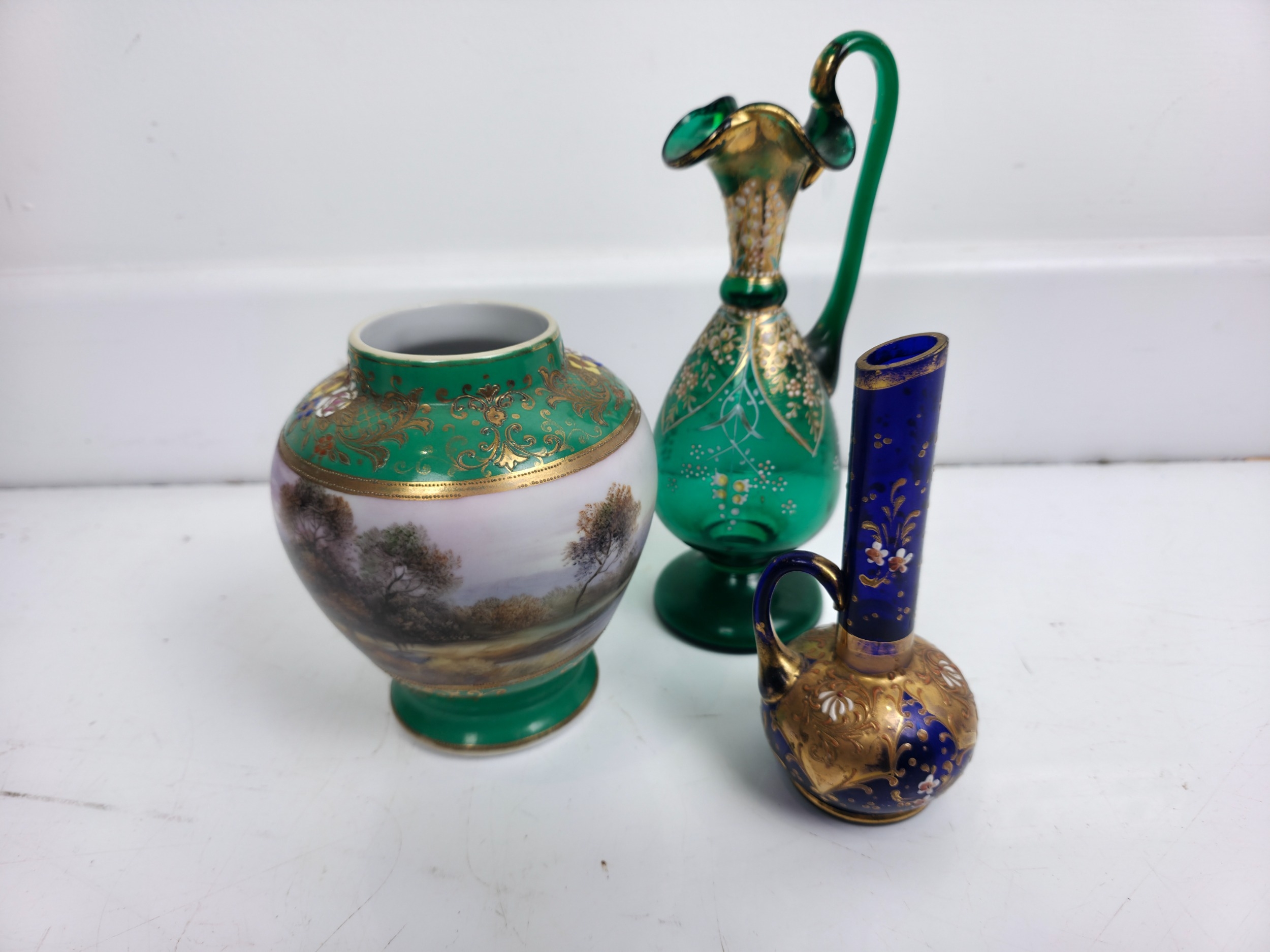 Noritake Vase and two Painted Glass Ewers or Vessels