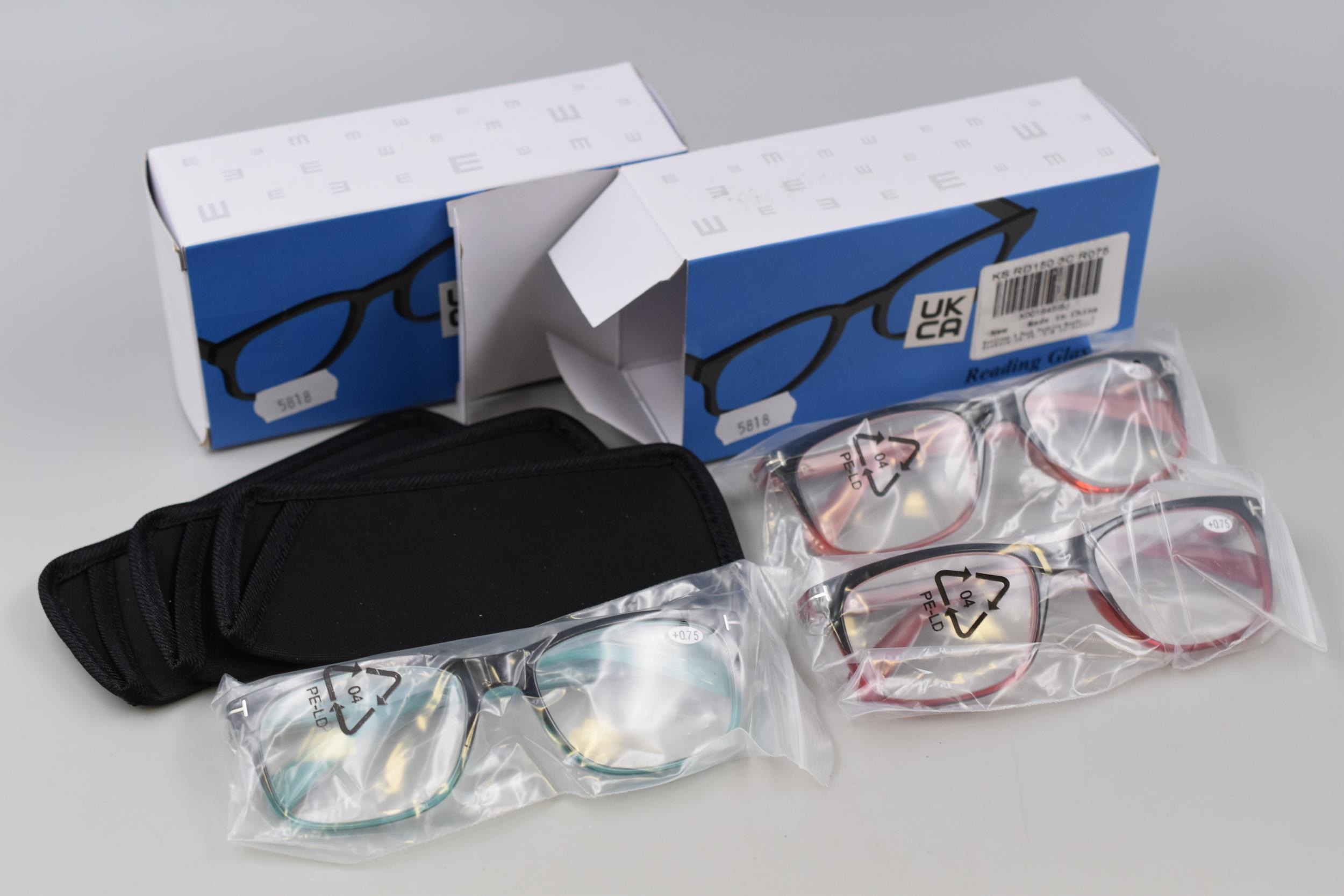 Six Pairs Of New Reading Glasses (+0.75 ) Complete With Case And Wipes
