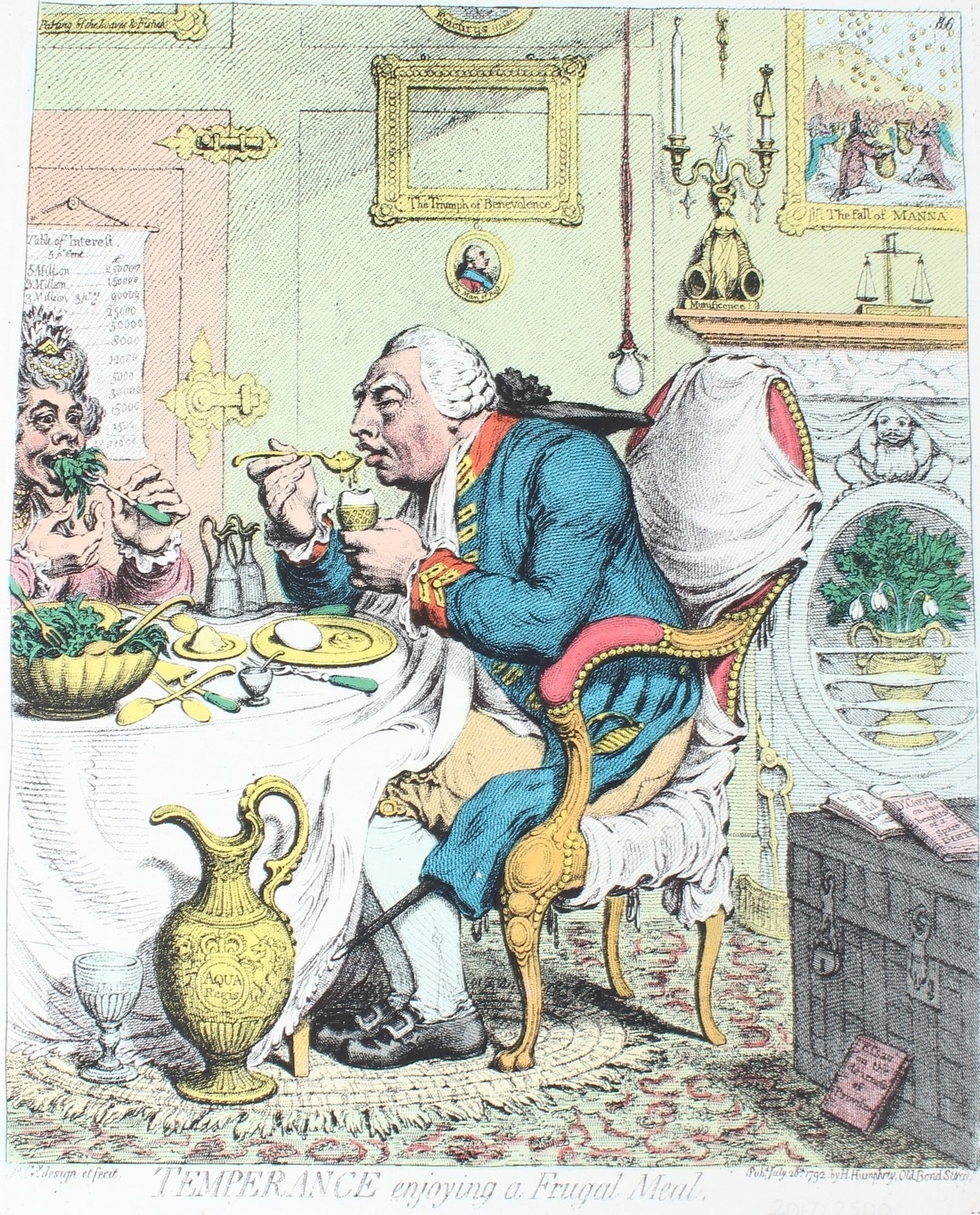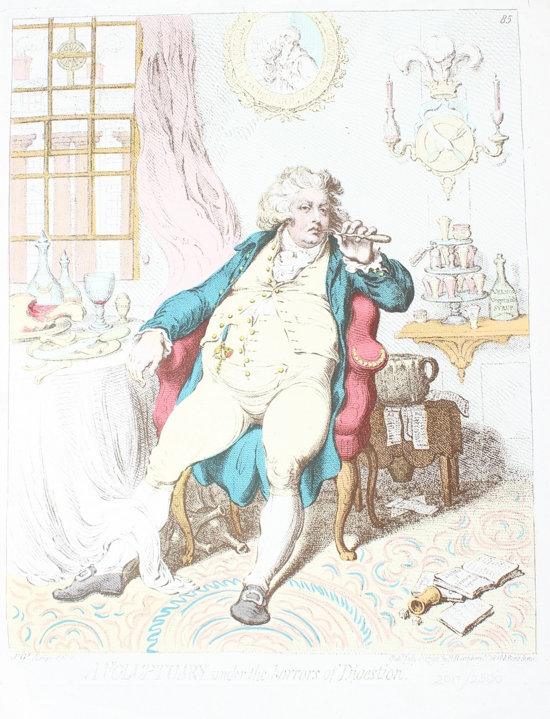 AFTER JAMES GILLRAY 'Temperance enjoying a frugal meal' and 'A Voluptuary under the horrors of digestion' two coloured prints unframed 40 x 31.5cm (2)