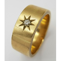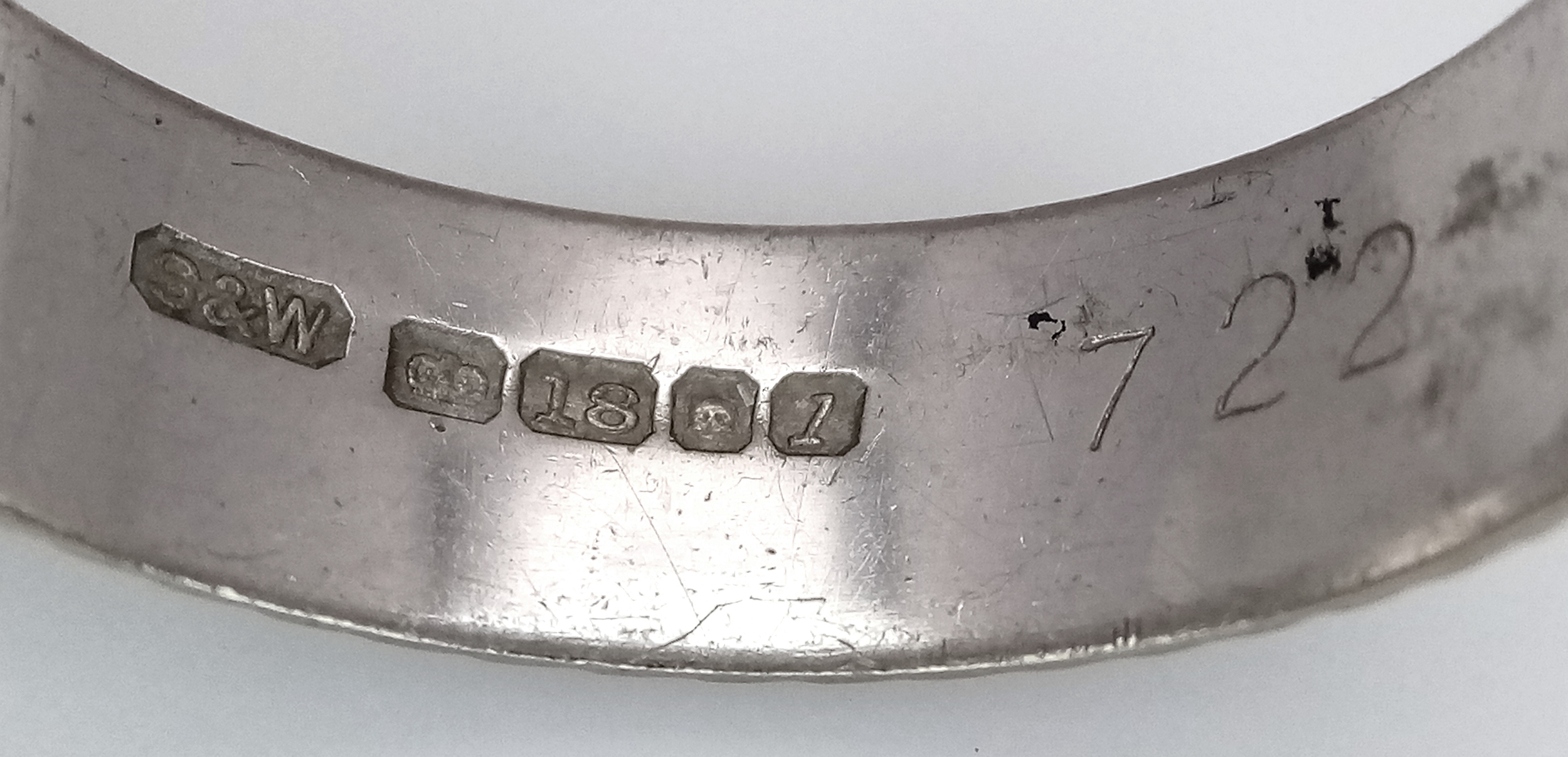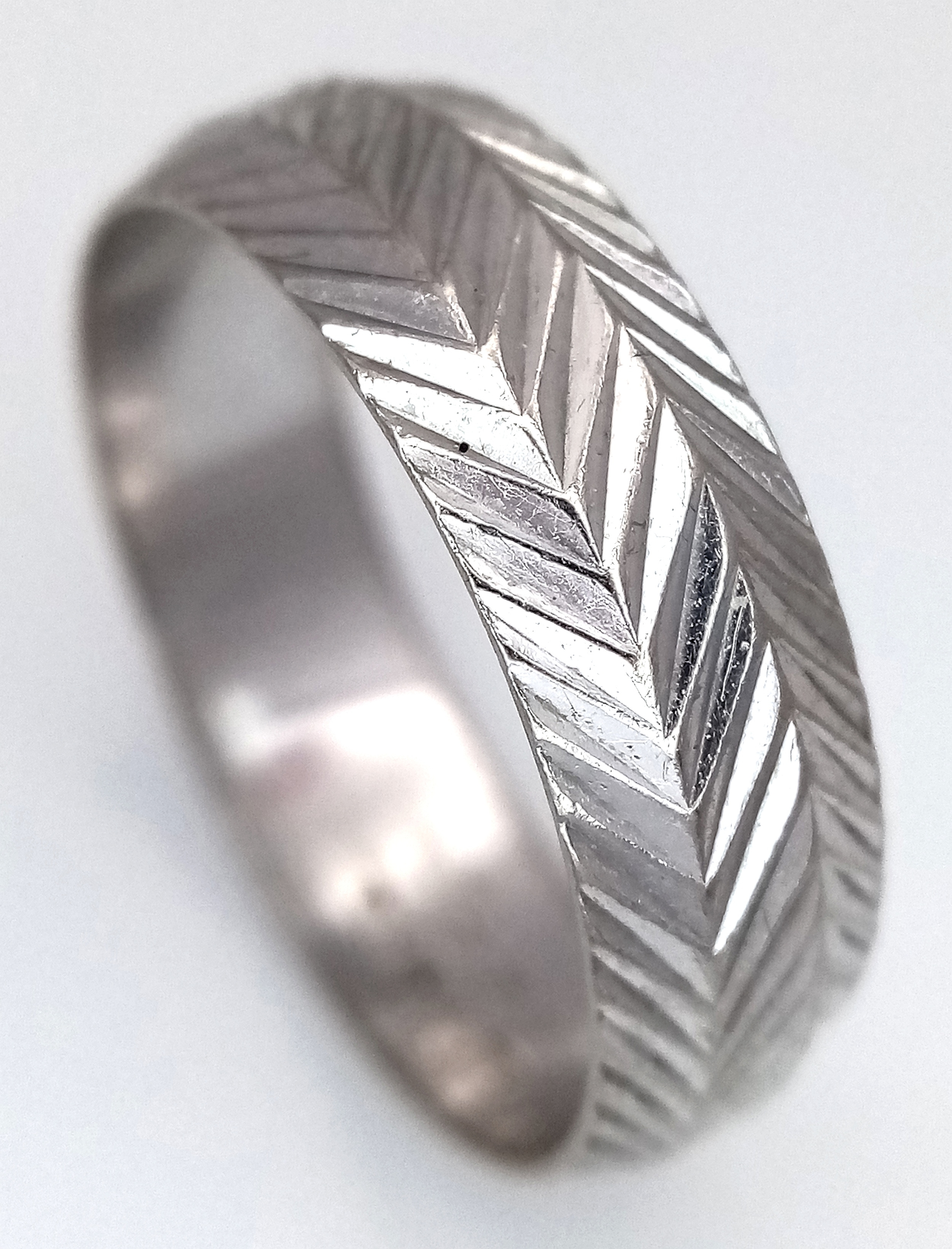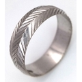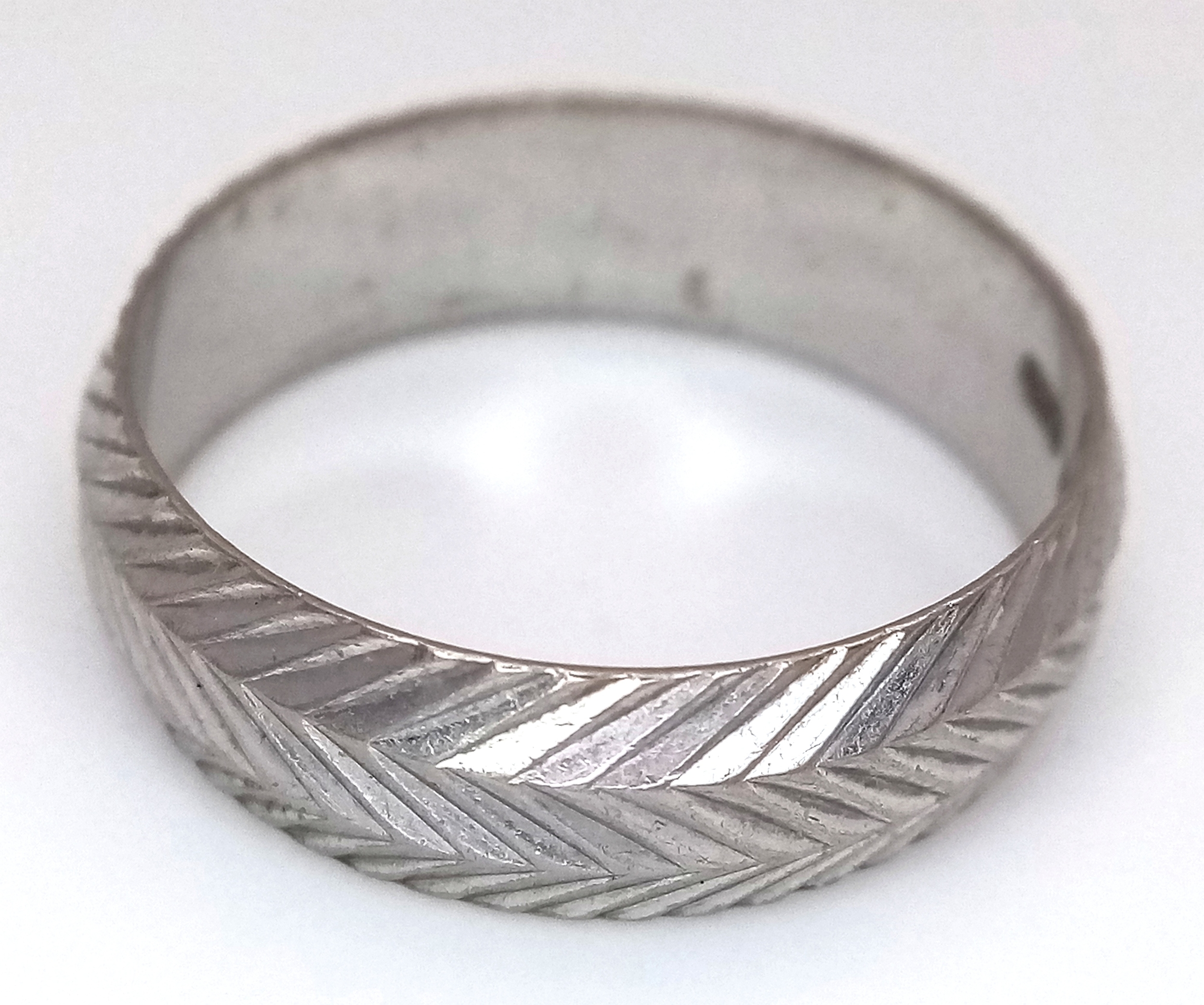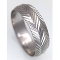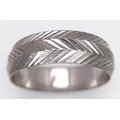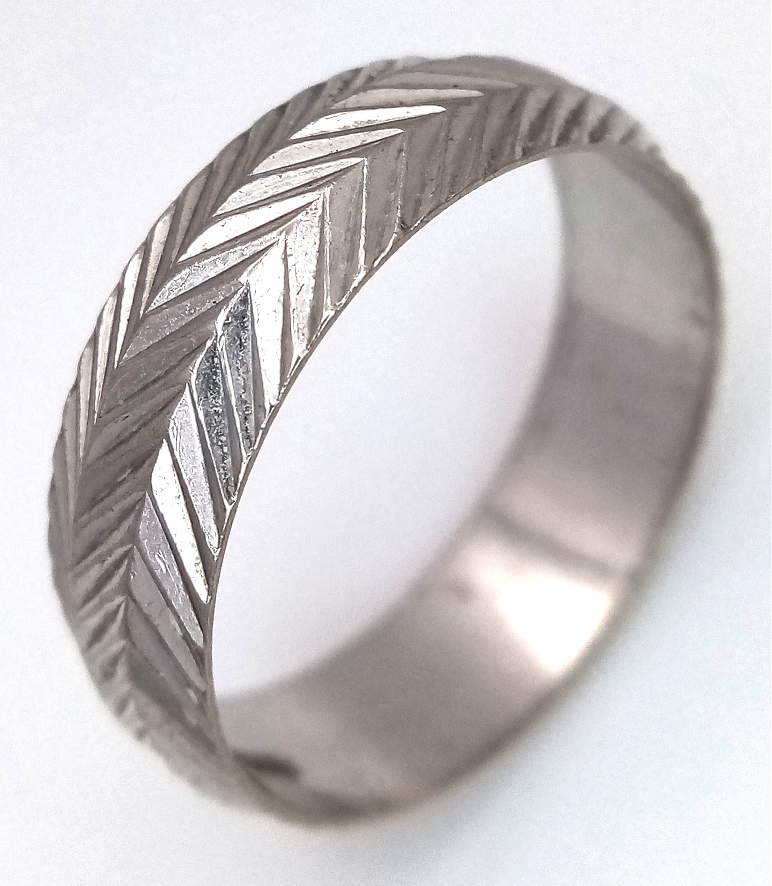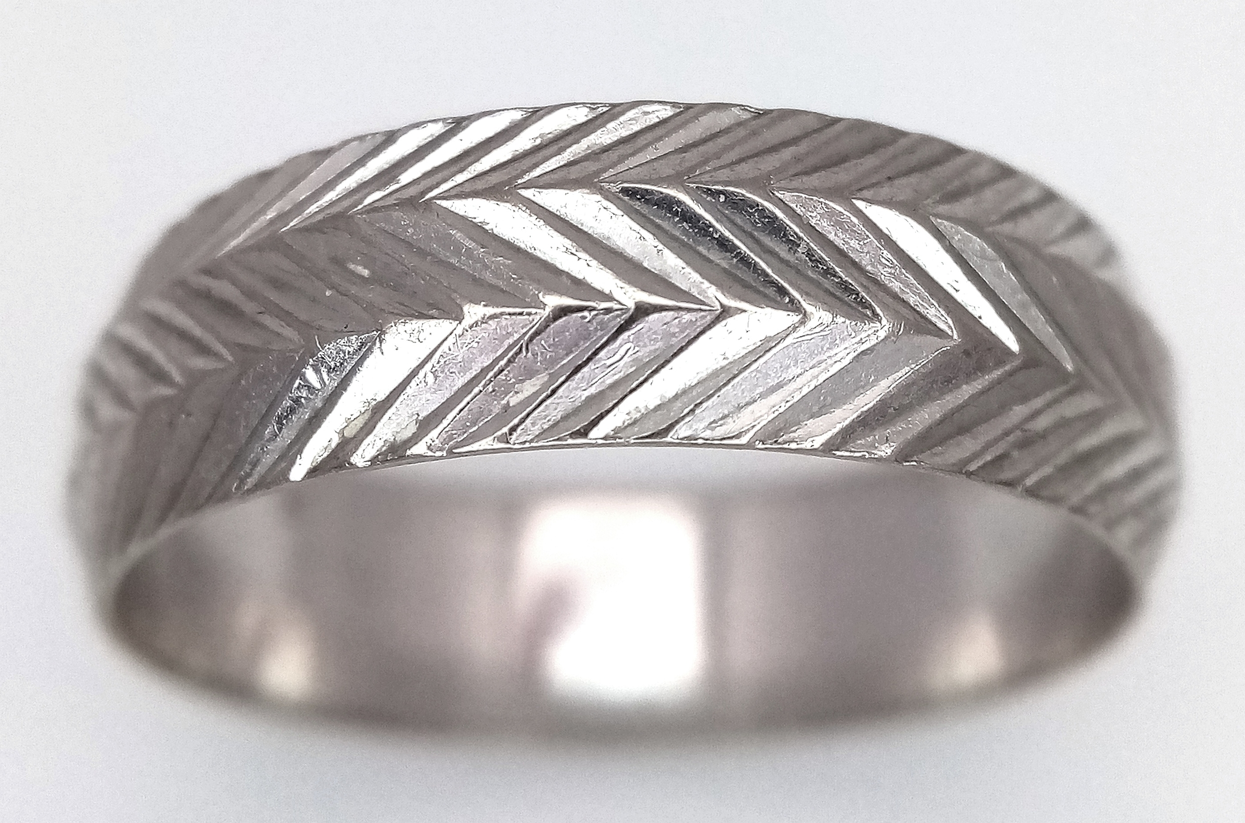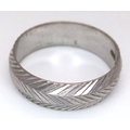 An 18K White Gold Band Ring. Textured chevron exterior band pattern. Size T 1/2. 7mm width. 5.6g.