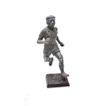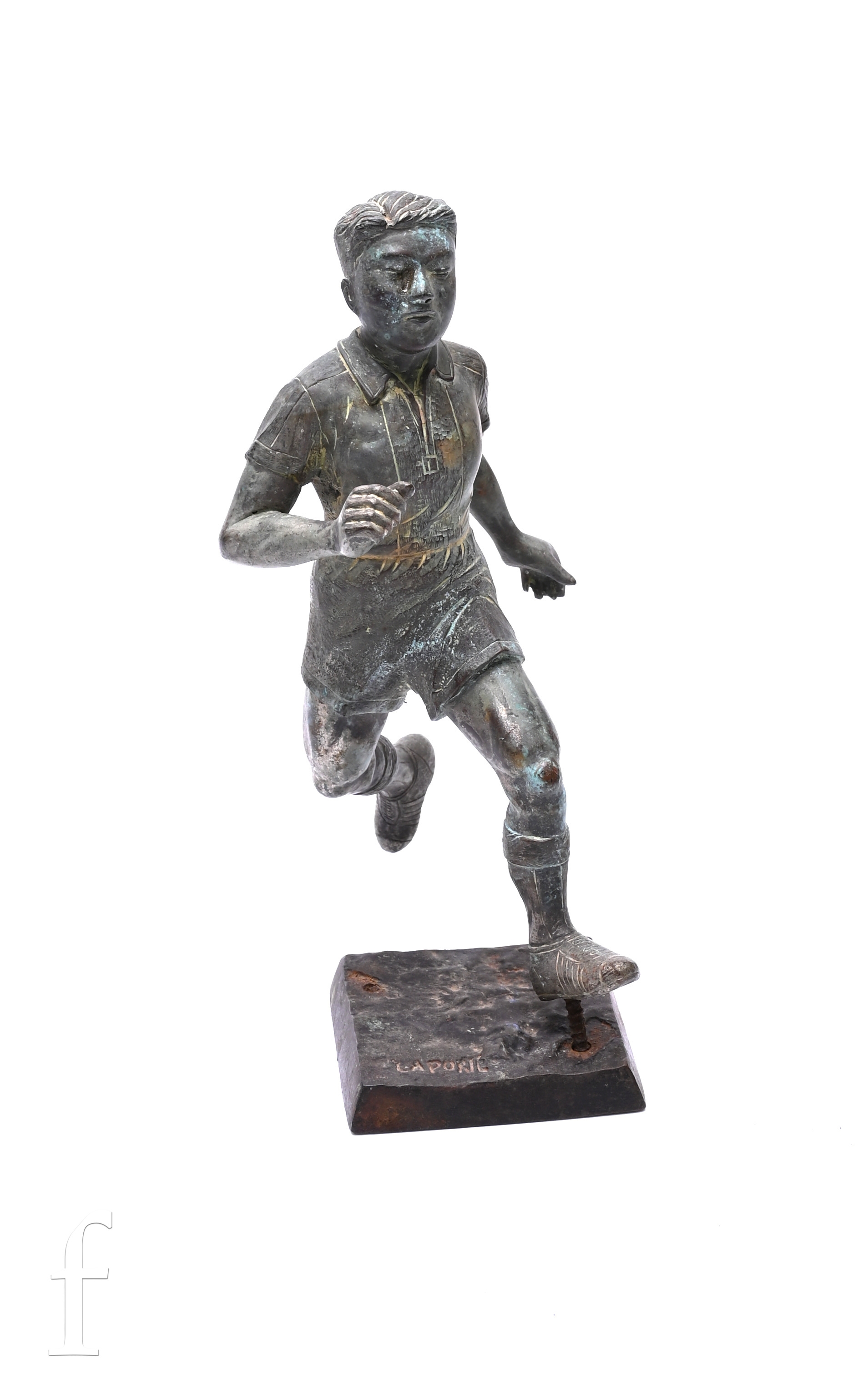 A 20th Century spelter figure after Laporte, depicting a footballer in running pose, complete with cast iron base, currently off the base and football missing, height of figure 19.5cm.