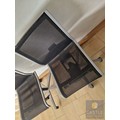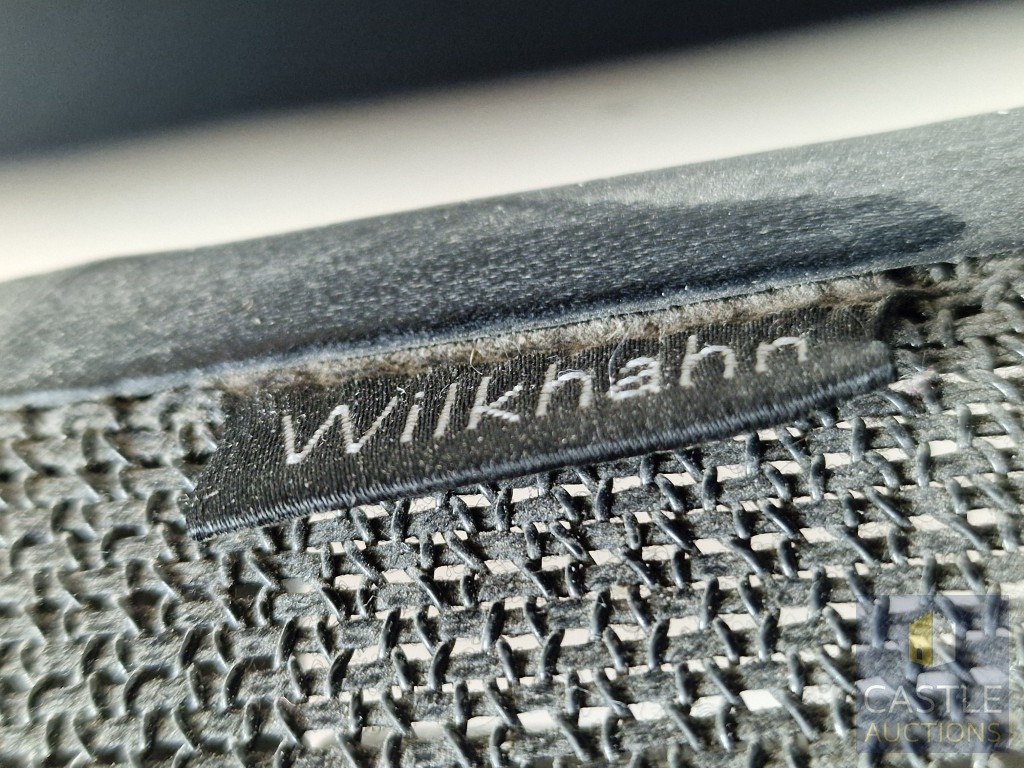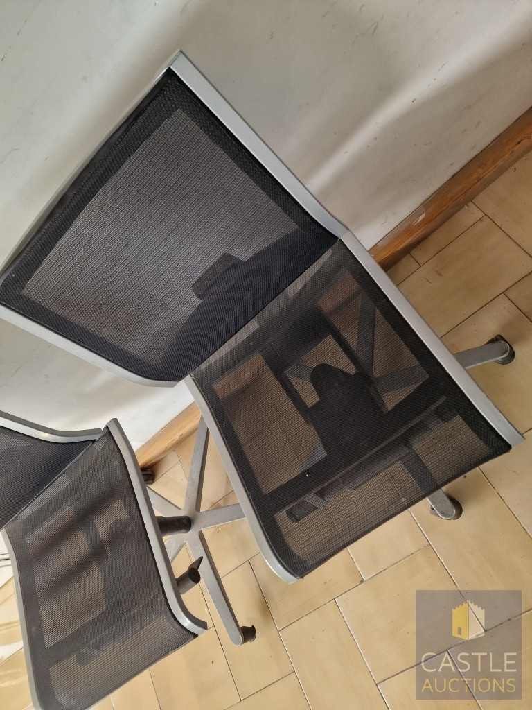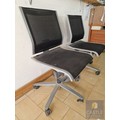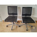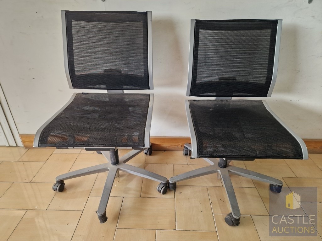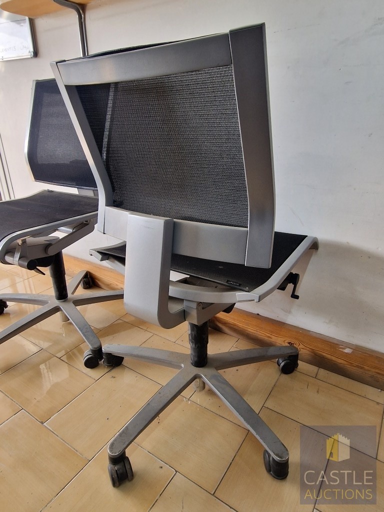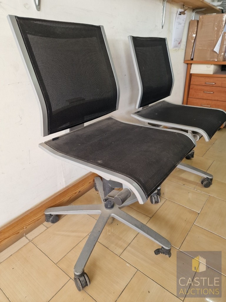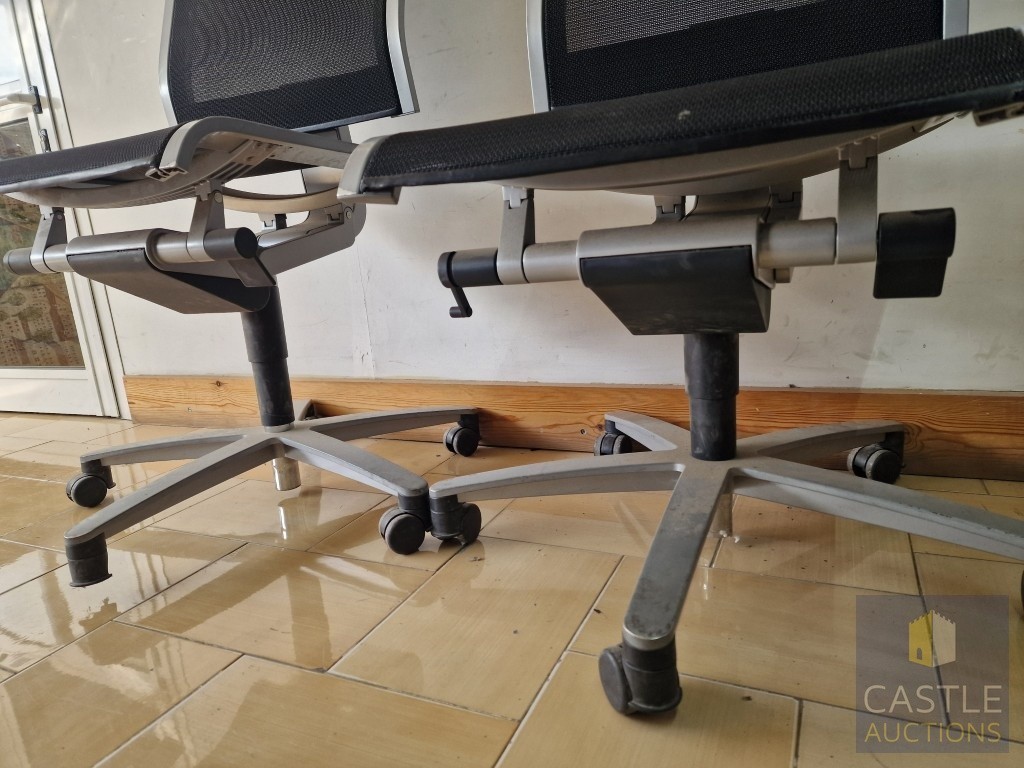 2 x Grey Metal Office Chairs with Black Mesh Seat and Back Rests, Adjustable, on Wheels, by 'Wilkhahn', (Noted one broken / missing wheel), (2)