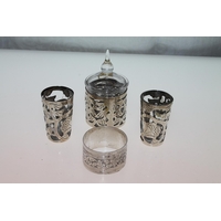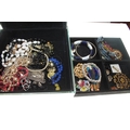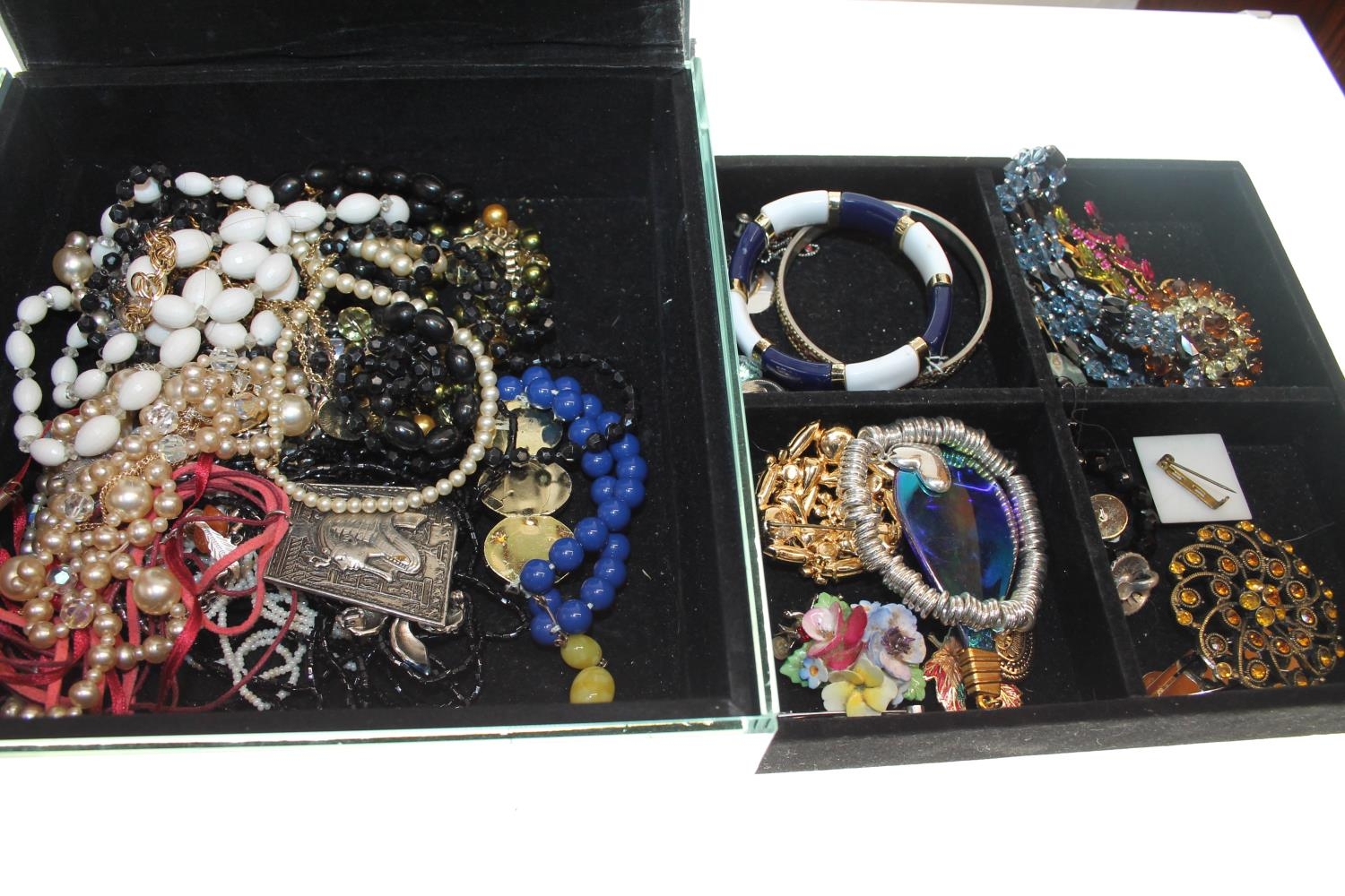Fitted modern glass case containing costume jewellery.