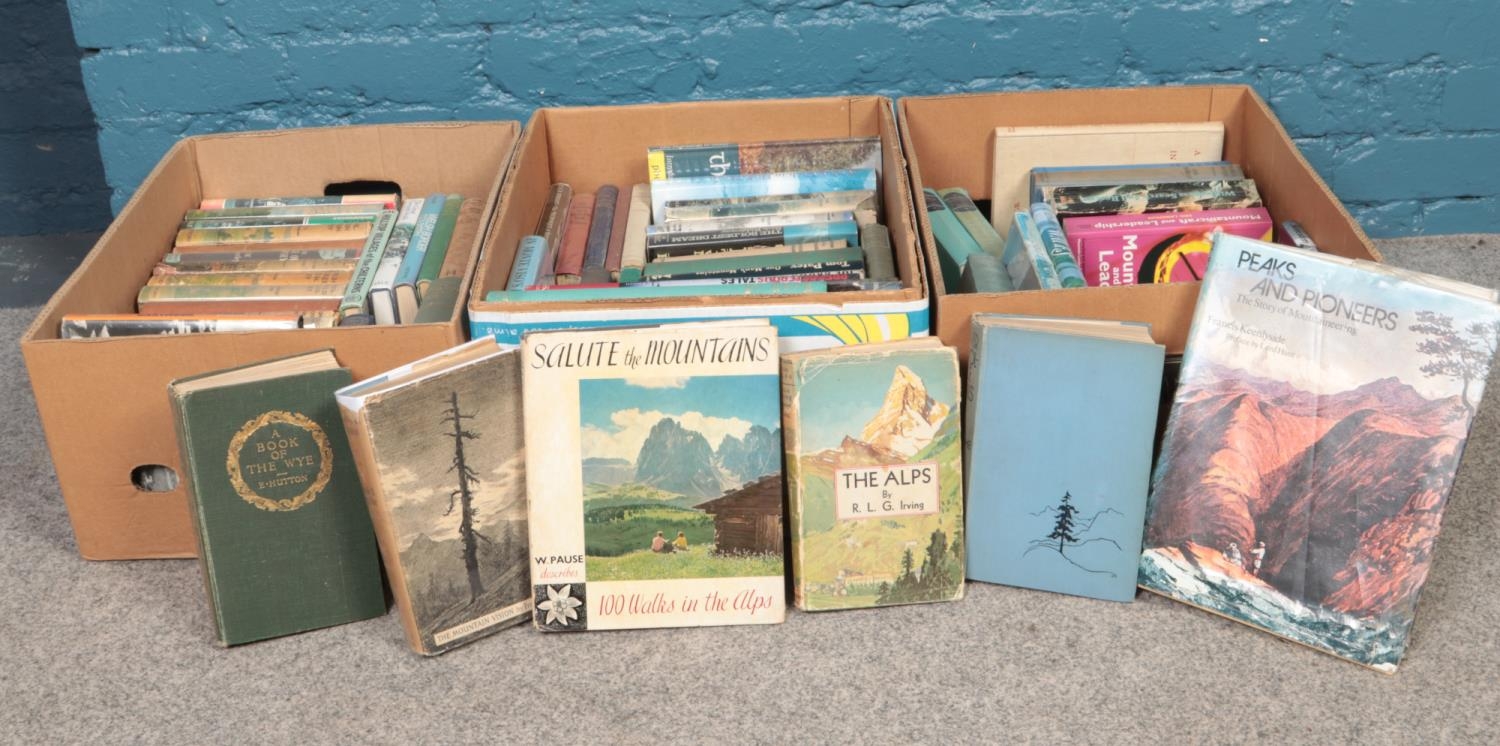 Three boxes of Mountaineering genre books. To include first editions - Irving R.L.G, The Romance of Mountaineering, 1935, Peacocke T.A.H, Mountaineering 1941, Smythe F.S, Over Tyrolese Hills 1936 etc